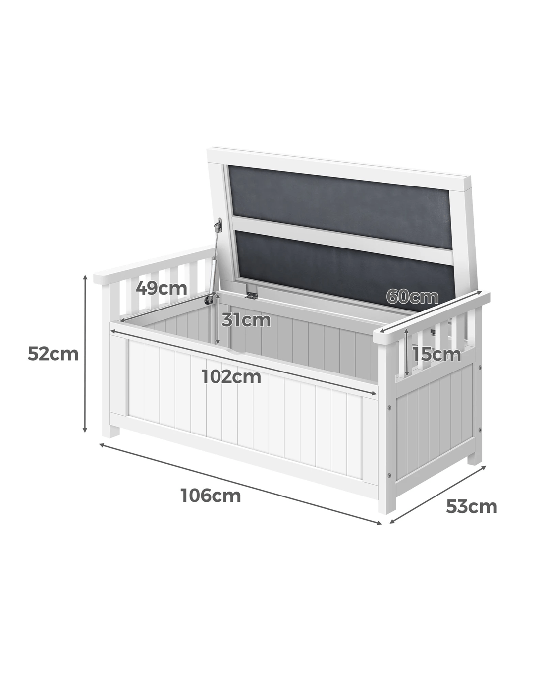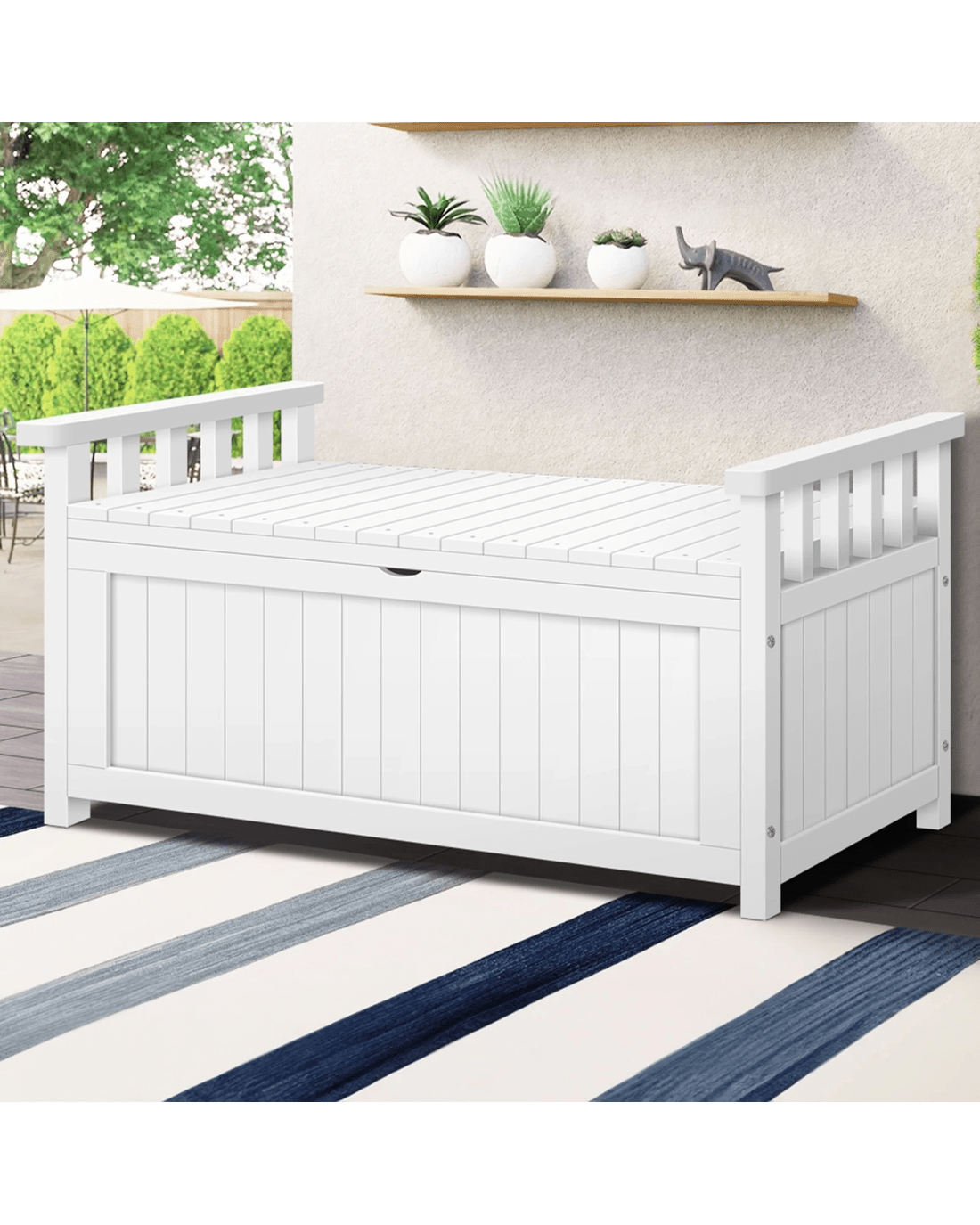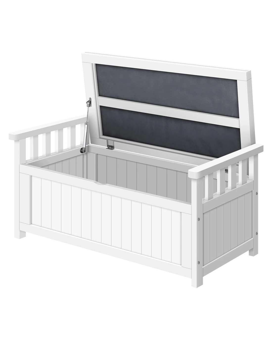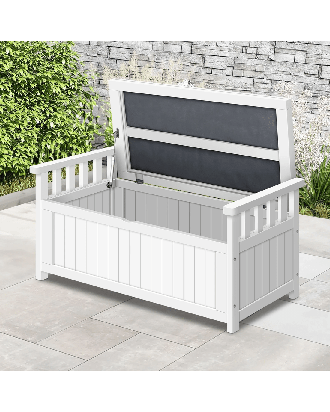 Ample storage space - At 160L, the large outdoor storage bench is spacious enough to hold everything from pool towels to furniture cushions. The convenient piston system allows smooth lid-opening and the lid can stay propped up on hinges for easy access to all your stuff.