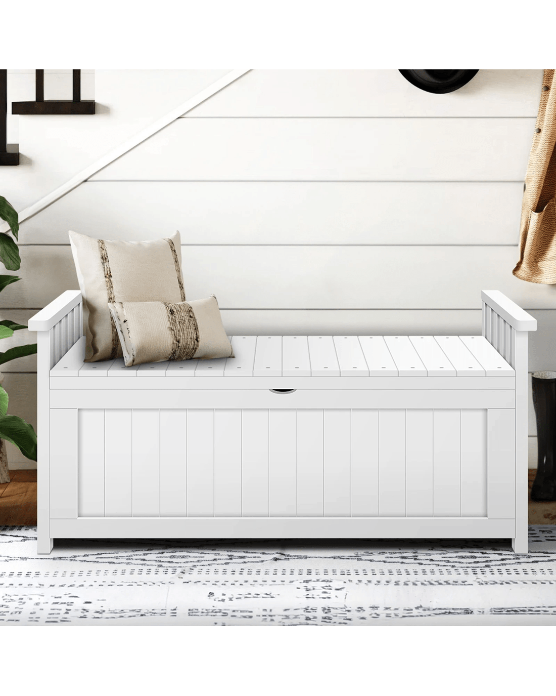 Outdoor and indoor chic - Our storage bench is suitable for both outdoor and indoor Use - ing you the flexibility to Use - herever you want. Whether you're looking to keep clutter at bay in your hallway or entrance, or outdoor space on your patio, the natural aesthetic appearance can blend seamlessly with your home decor. There are also built-in handles on the sides, making it easy to lift and move around as needed.