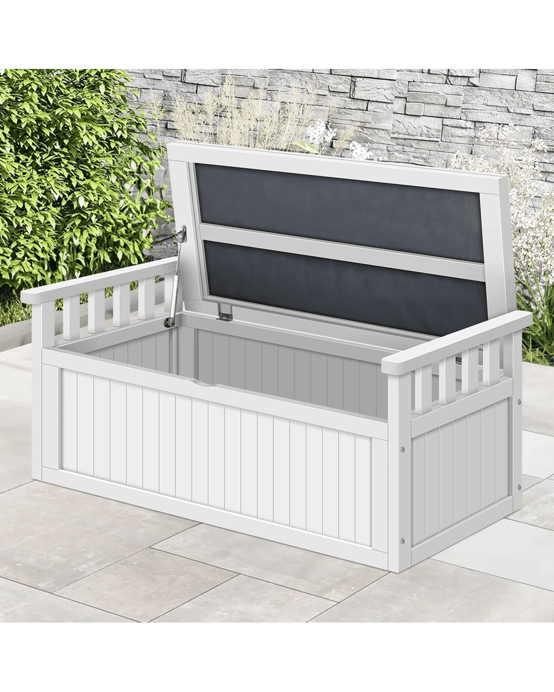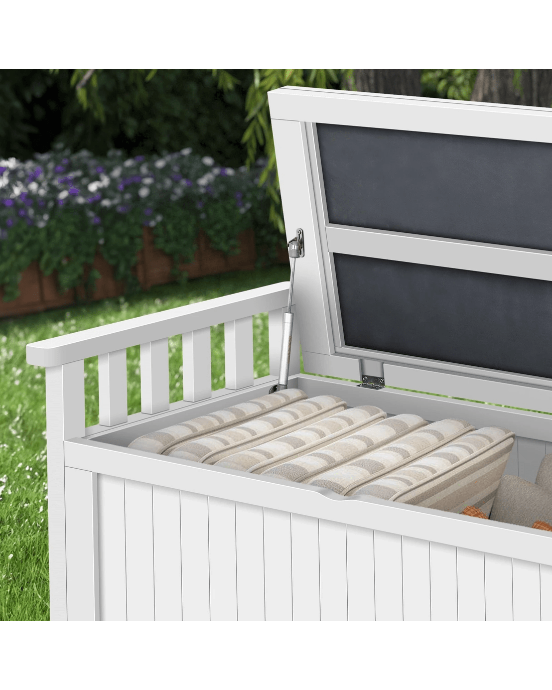 Ample storage space - At 200L, the large outdoor storage bench is spacious enough to hold everything from pool towels to furniture cushions. The convenient piston system allows smooth lid-opening and the lid can stay propped up on hinges for easy access to all your stuff.