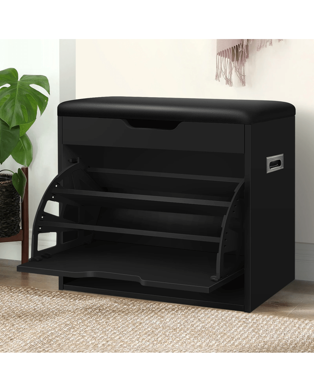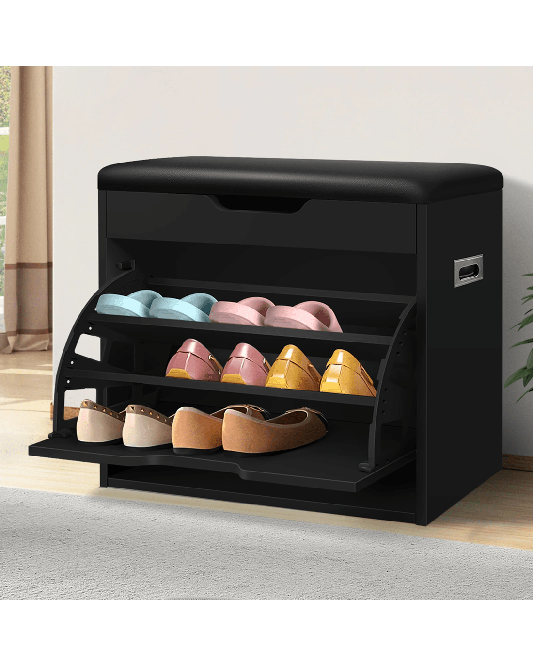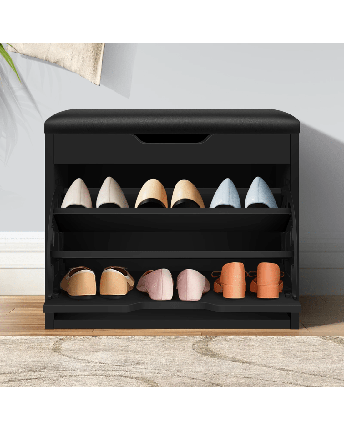 Not only will it add a touch of elegance to your home, but the shoe cabinet bench also effortlessly declutters your space. By storing up to 12 shoes, it feaures three-tiered shelves which are adjustable according to the sizes of your shoes: Flat shoes, high heels, ankle boots or slippers. Thanks to its flip-door design, it can easily transform into a bench, giving you a comfy space to sit and pop your shoes on in a jiffy. Under the seat, you will find an additional storage space which is wonderful to keep your keys, watch, umbrella, sunglasses or other items for quick assess.
