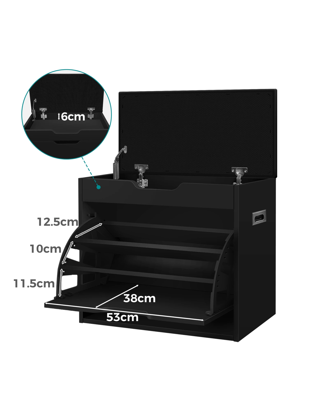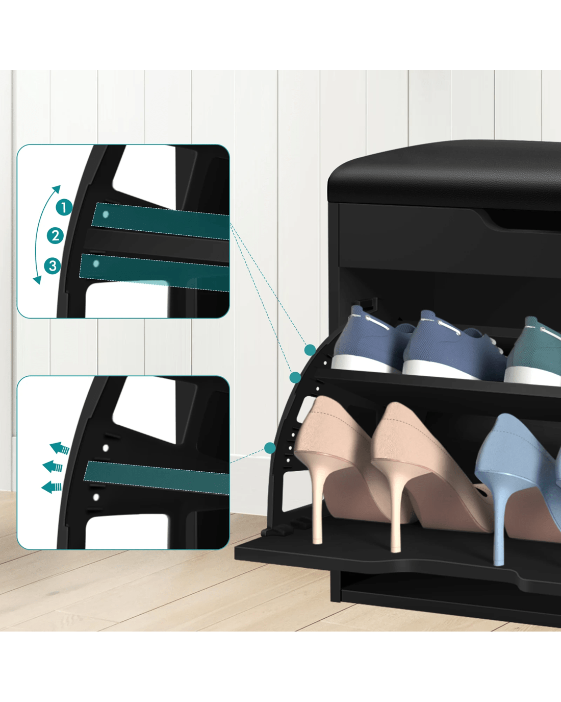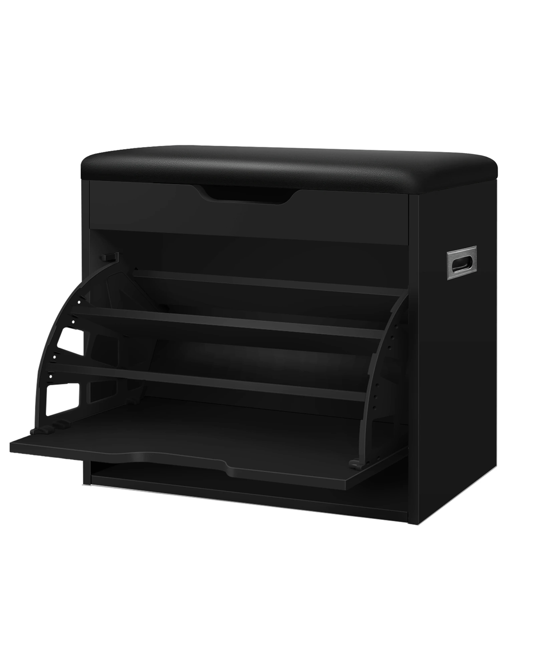 Not only will it add a touch of elegance to your home, but the shoe cabinet bench also effortlessly declutters your space. By storing up to 12 shoes, it feaures three-tiered shelves which are adjustable according to the sizes of your shoes: Flat shoes, high heels, ankle boots or slippers. Thanks to its flip-door design, it can easily transform into a bench, giving you a comfy space to sit and pop your shoes on in a jiffy. Under the seat, you will find an additional storage space which is wonderful to keep your keys, watch, umbrella, sunglasses or other items for quick assess.