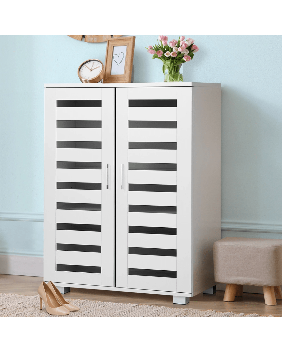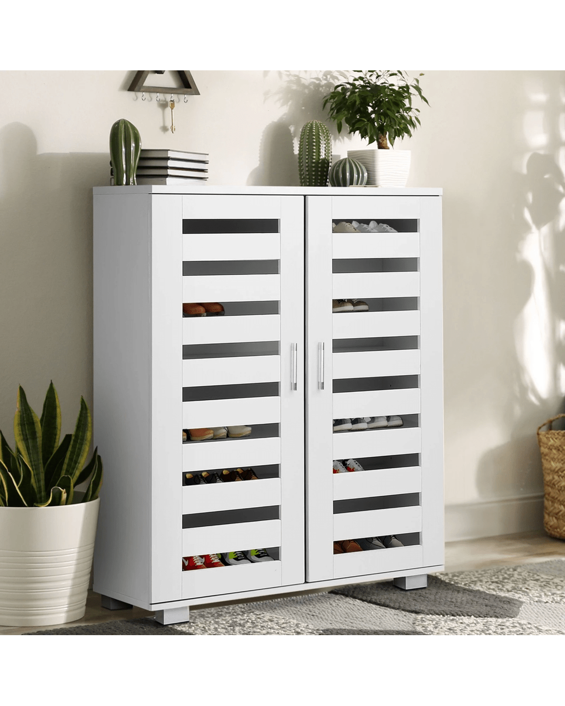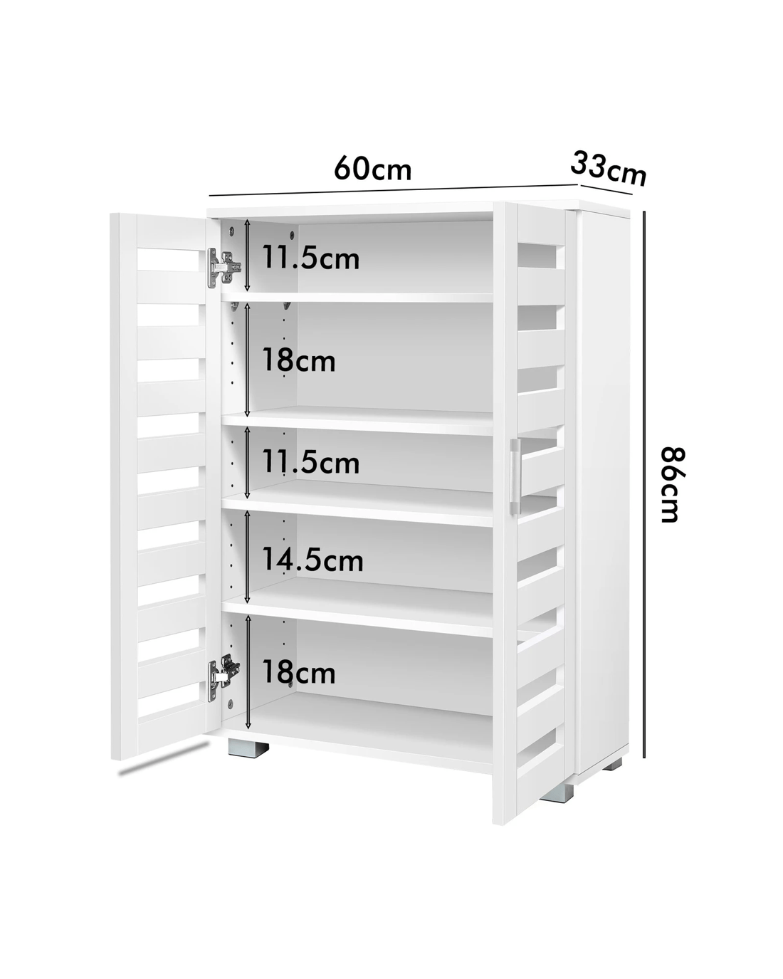 Fitted with two slatted doors with 5 customized shelves giving this piece enough space for up to 21 pairs of shoes ranging from slippers to high boots. Slits within the doors enable air circulation and prevent mould growth on your shoes.