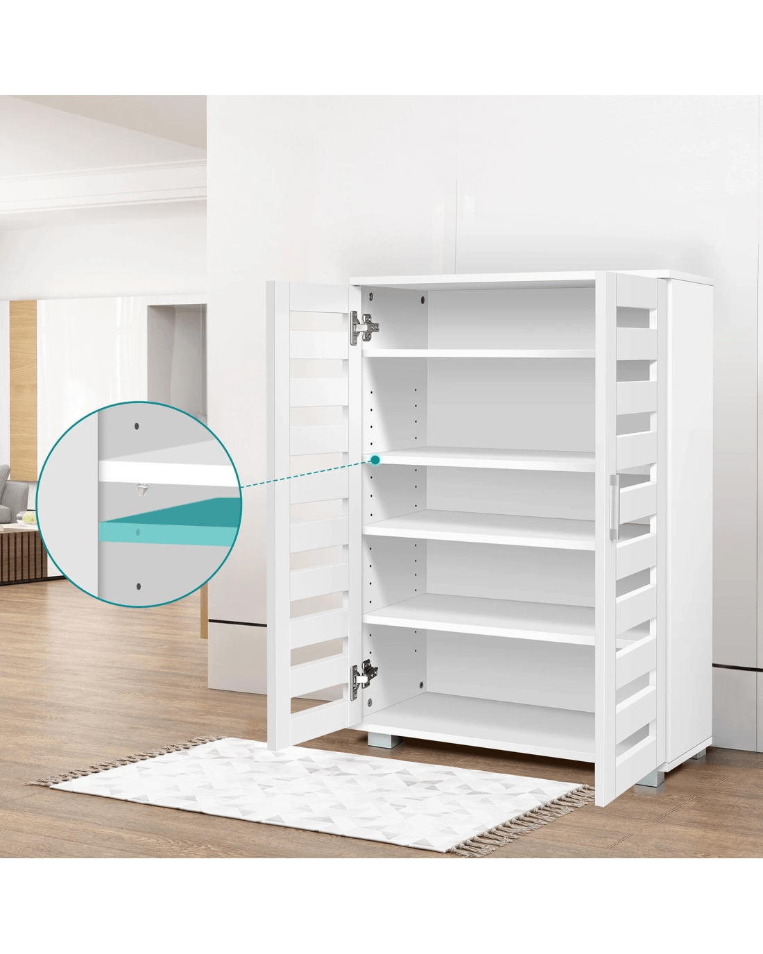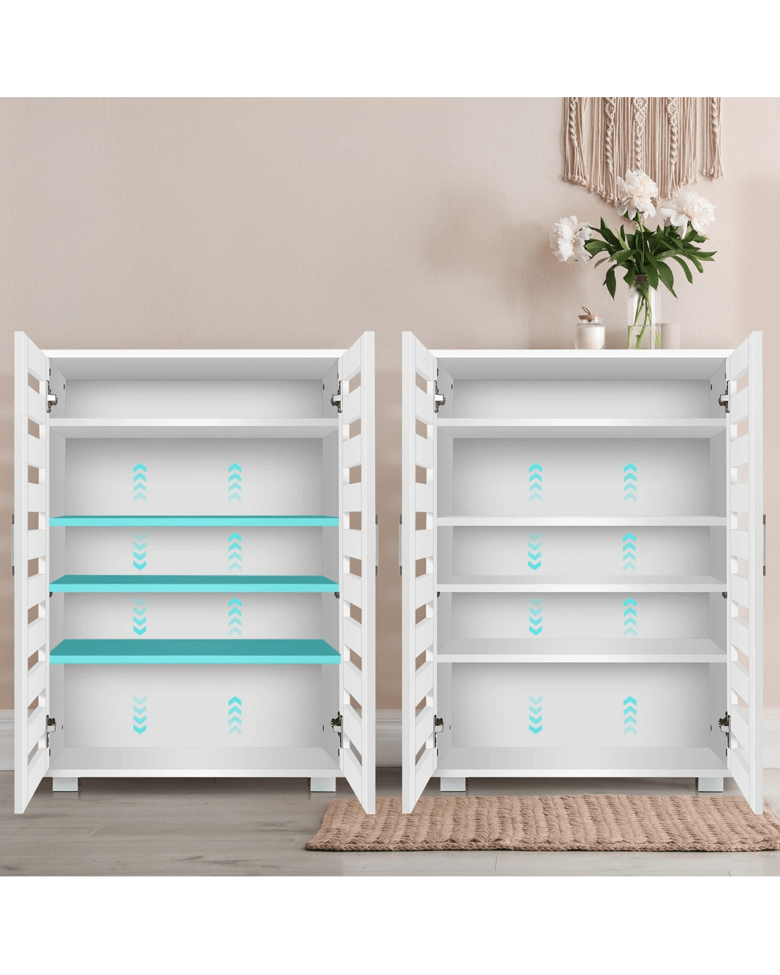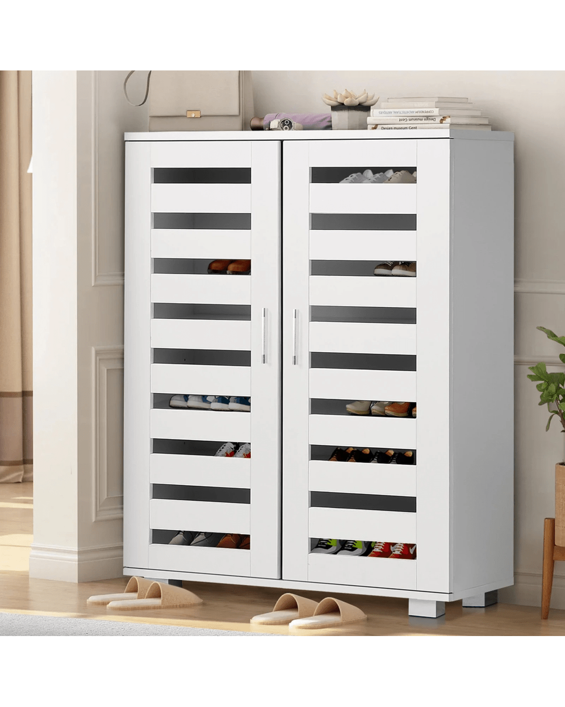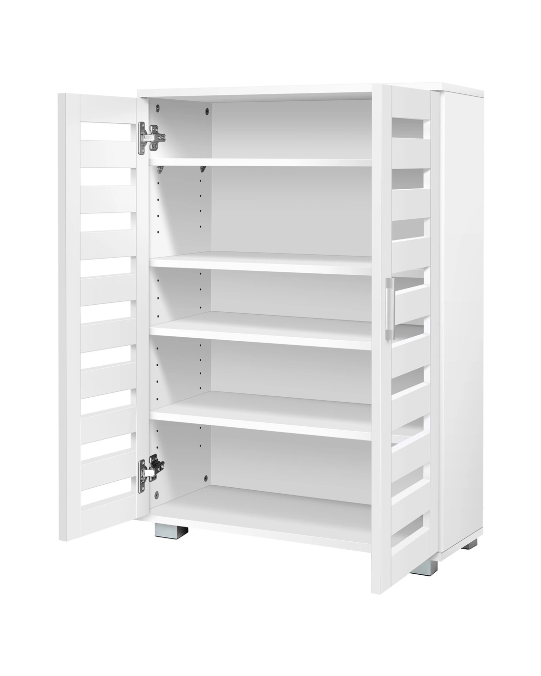 Fitted with two slatted doors with 5 customized shelves giving this piece enough space for up to 21 pairs of shoes ranging from slippers to high boots. Slits within the doors enable air circulation and prevent mould growth on your shoes.