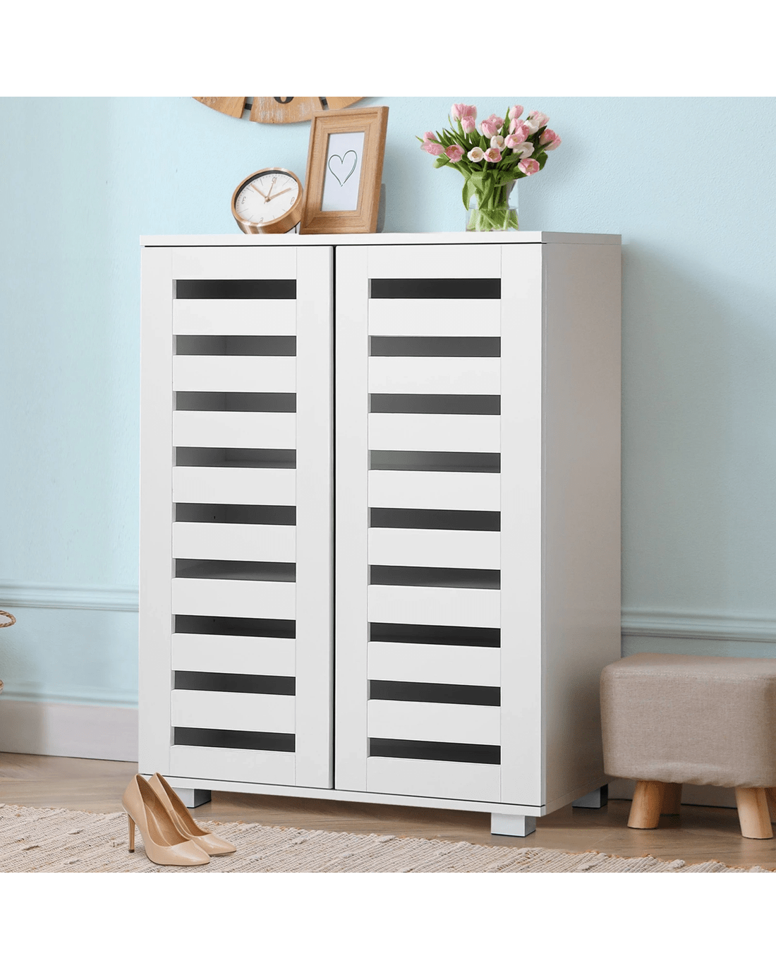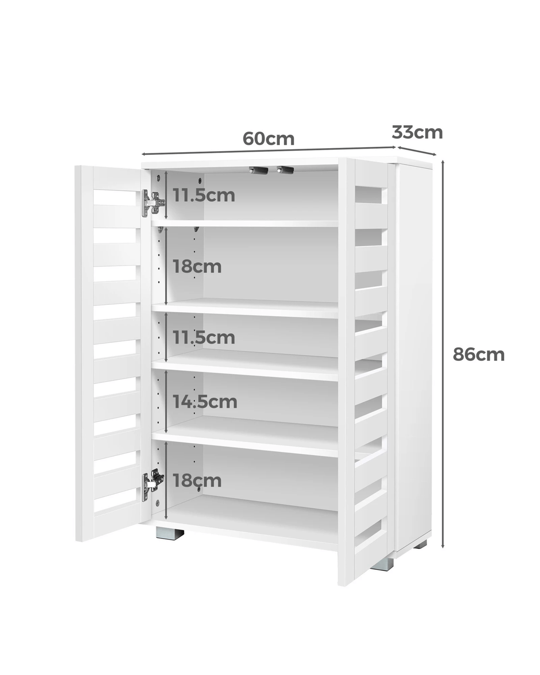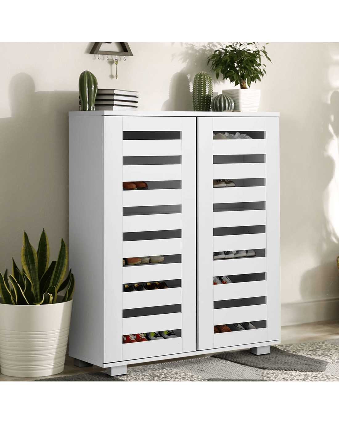 Fitted with two slatted doors with 5 customized shelves giving this piece enough space for up to 21 pairs of shoes ranging from slippers to high boots. Slits within the doors enable air circulation and prevent mould growth on your shoes.