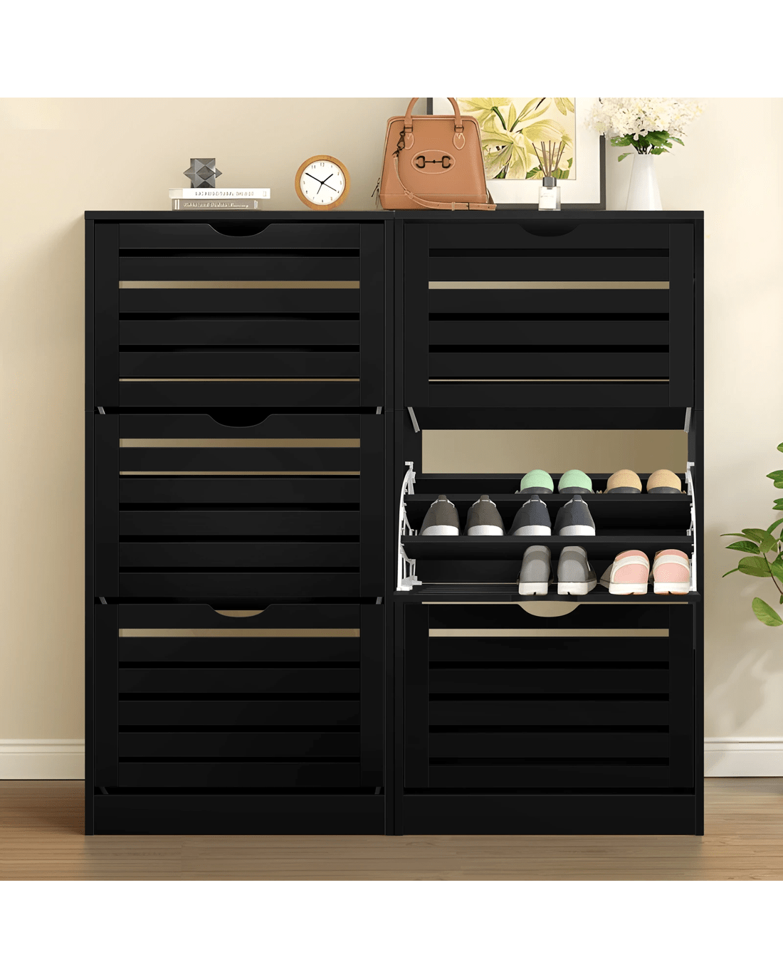 Not only will it add a touch of elegance to your home, but the shoe cabinet bench also effortlessly declutters your space. By storing up to 45 pairs of children's shoes or 21-27 pairs of ladies' or men's shoes, it feaures 3-tier shelves for each flip-down drawer, which are adjustable according to the size of your shoes: flat shoes, high heels, sneakers or slippers. Slits within the doors enable air circulation and prevent mould growth on your shoes.