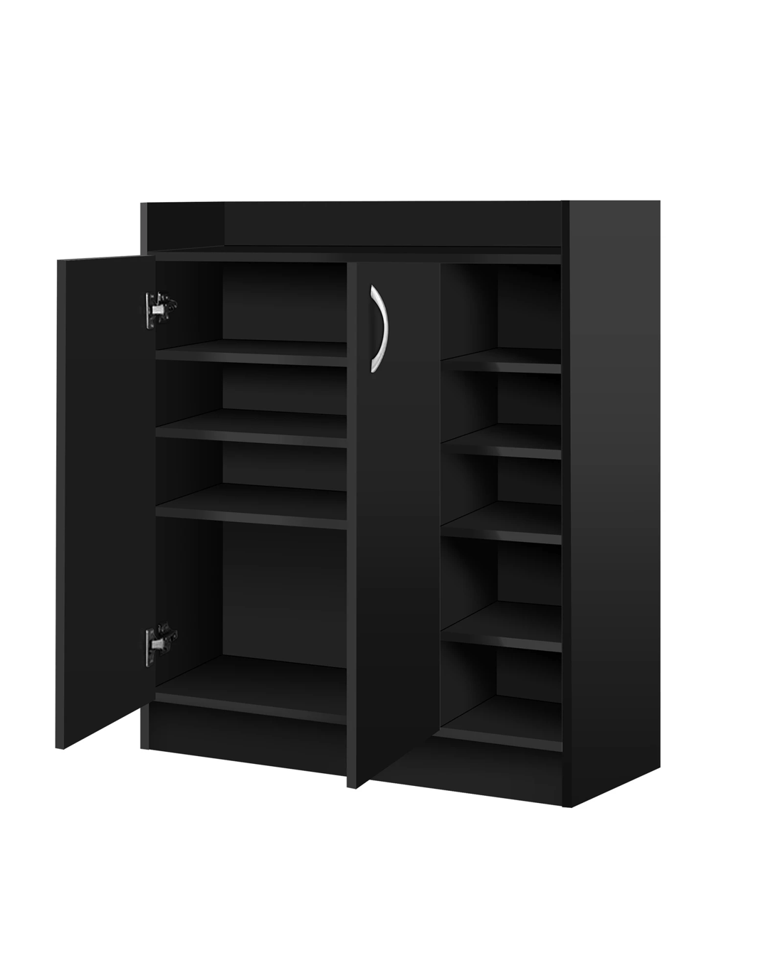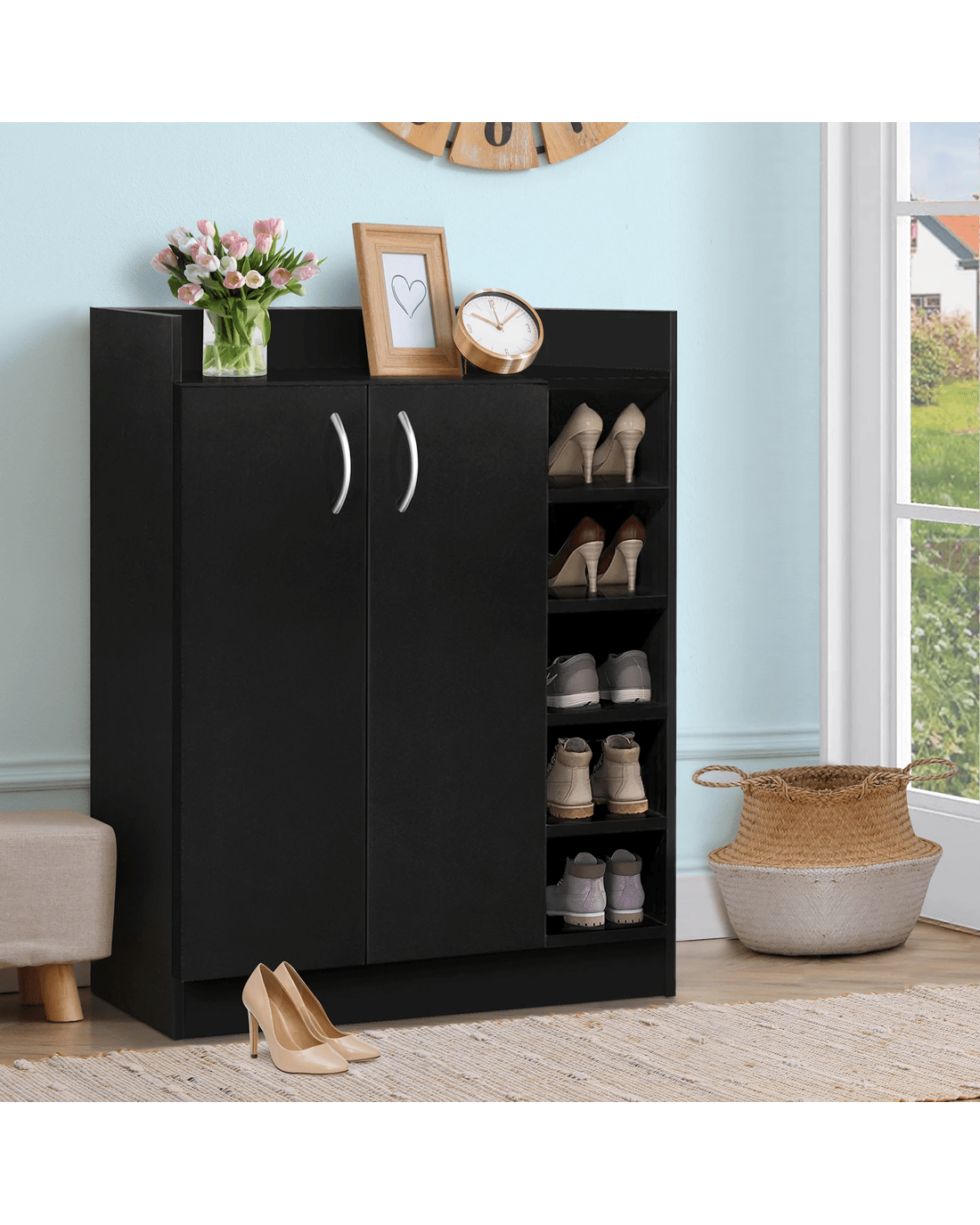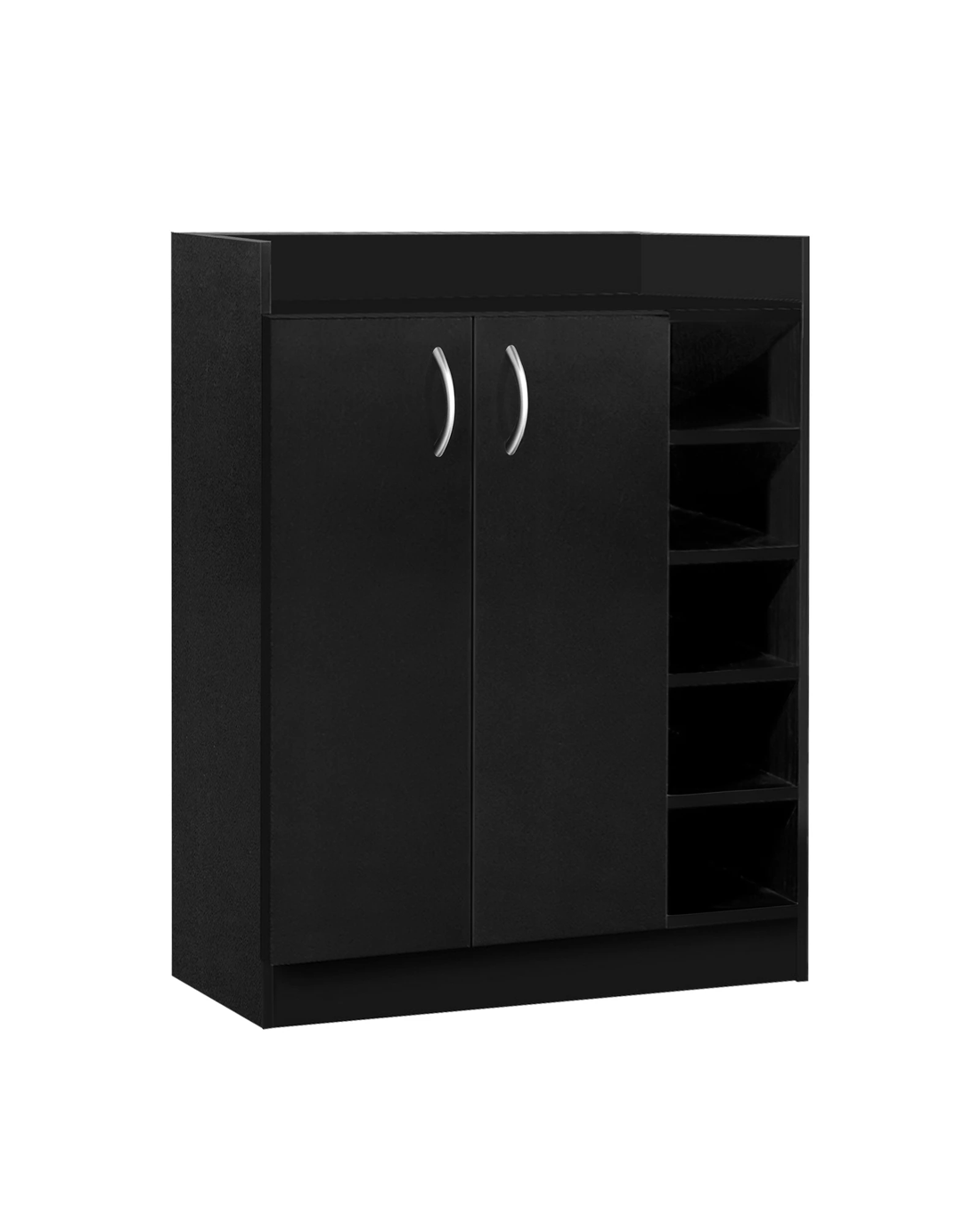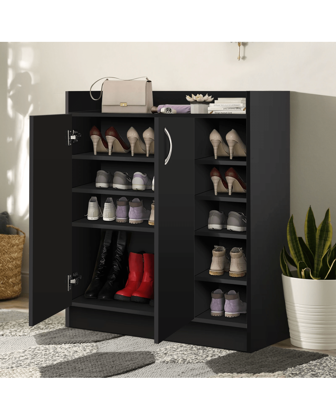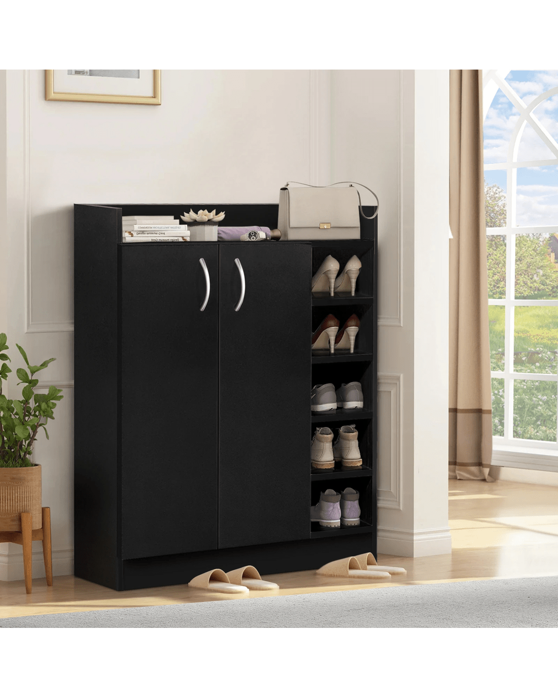 The shoe cabinet features 4 shelving compartments behind 2 doors to store up to 16 pairs of shoes, while open shelves to the side fits up to 5 pairs for quick access of your everyday shoes with ease. All tiers are adjustable for versatile storage needs.
