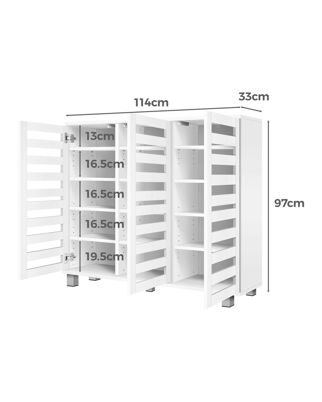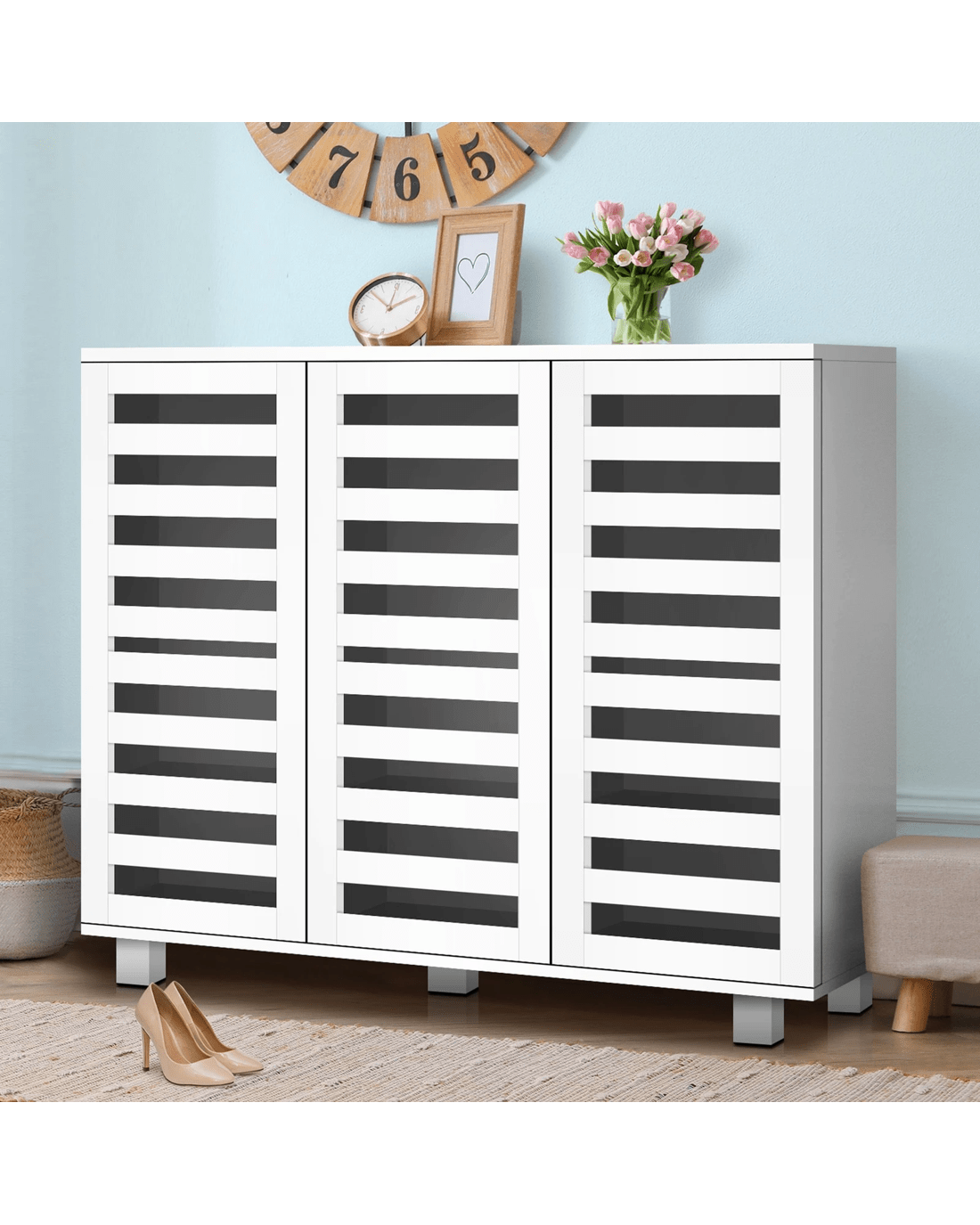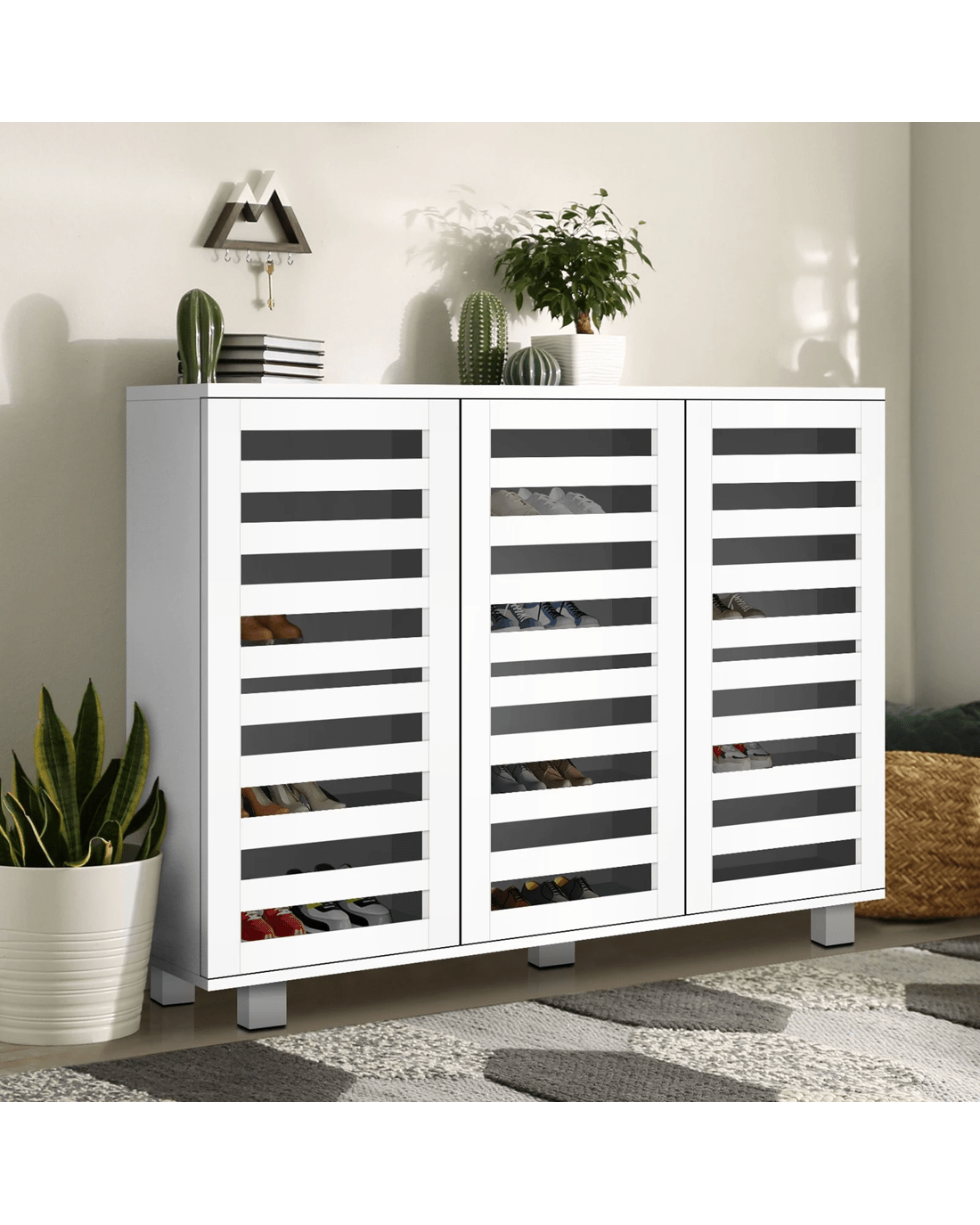 Fitted with three slatted doors and 15 customized shelves giving this piece enough space for up to 30 pairs of shoes ranging from slippers to high boots. Slits within the doors enable air circulation and prevent mould growth on your shoes.