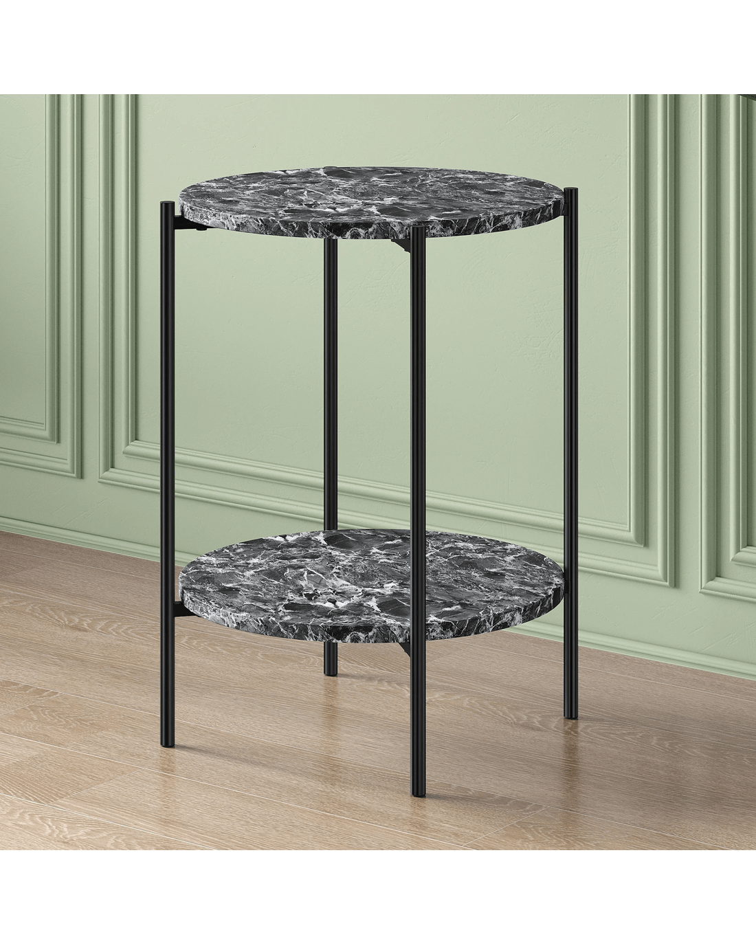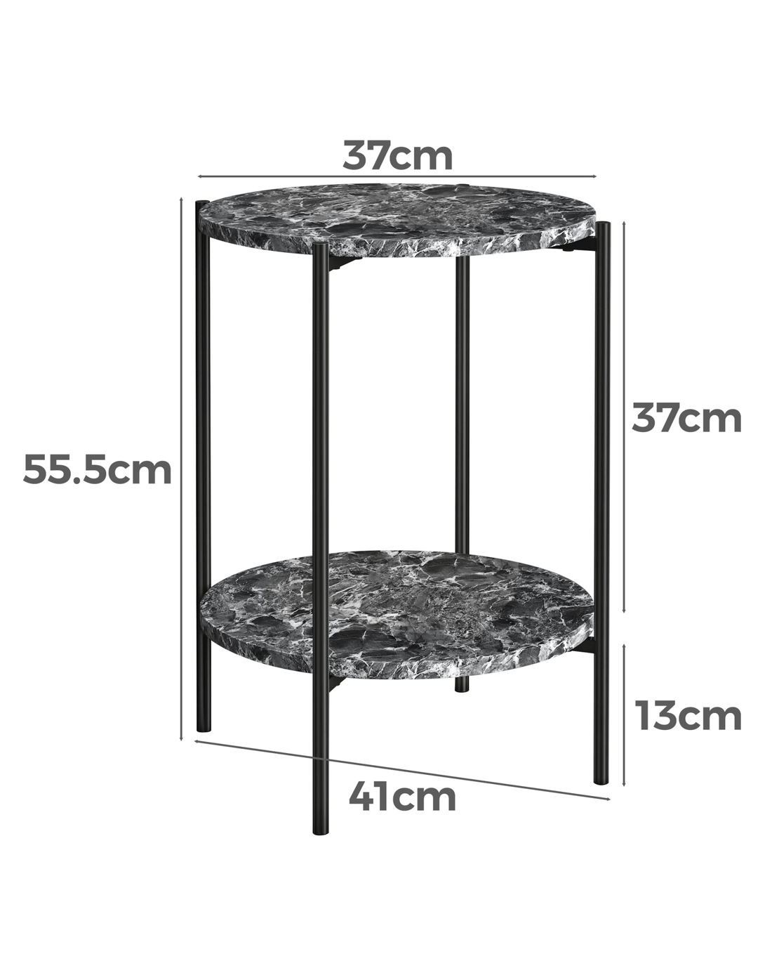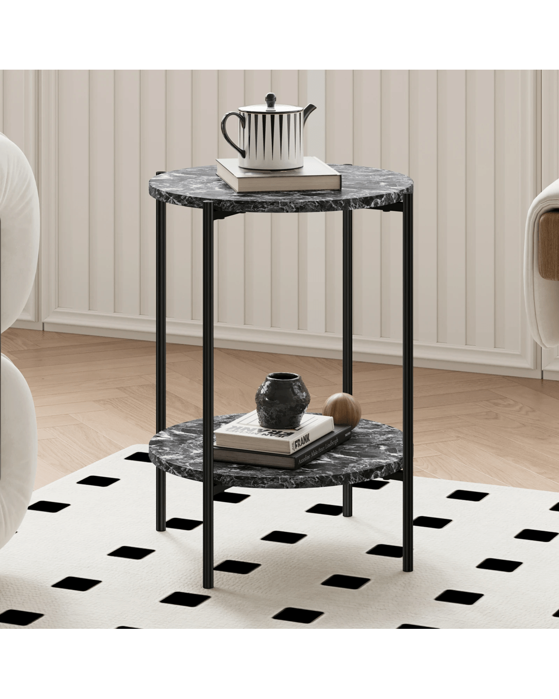 Made of superior 15mm thick particle board and fully covered by PVC for 2-tier shelves, this side table is designed to be highly durable. Supported by heavy-duty metal legs, it ensures a sturdy and stable base. Unlike some other sellers, we have no compromise on materials used. It is not only easy to maintain and clean, but also long lasting and durable. In addition to its practical use, its round shape with delicate marble pattern creats a sense of cohesion and aesthetics to living space.