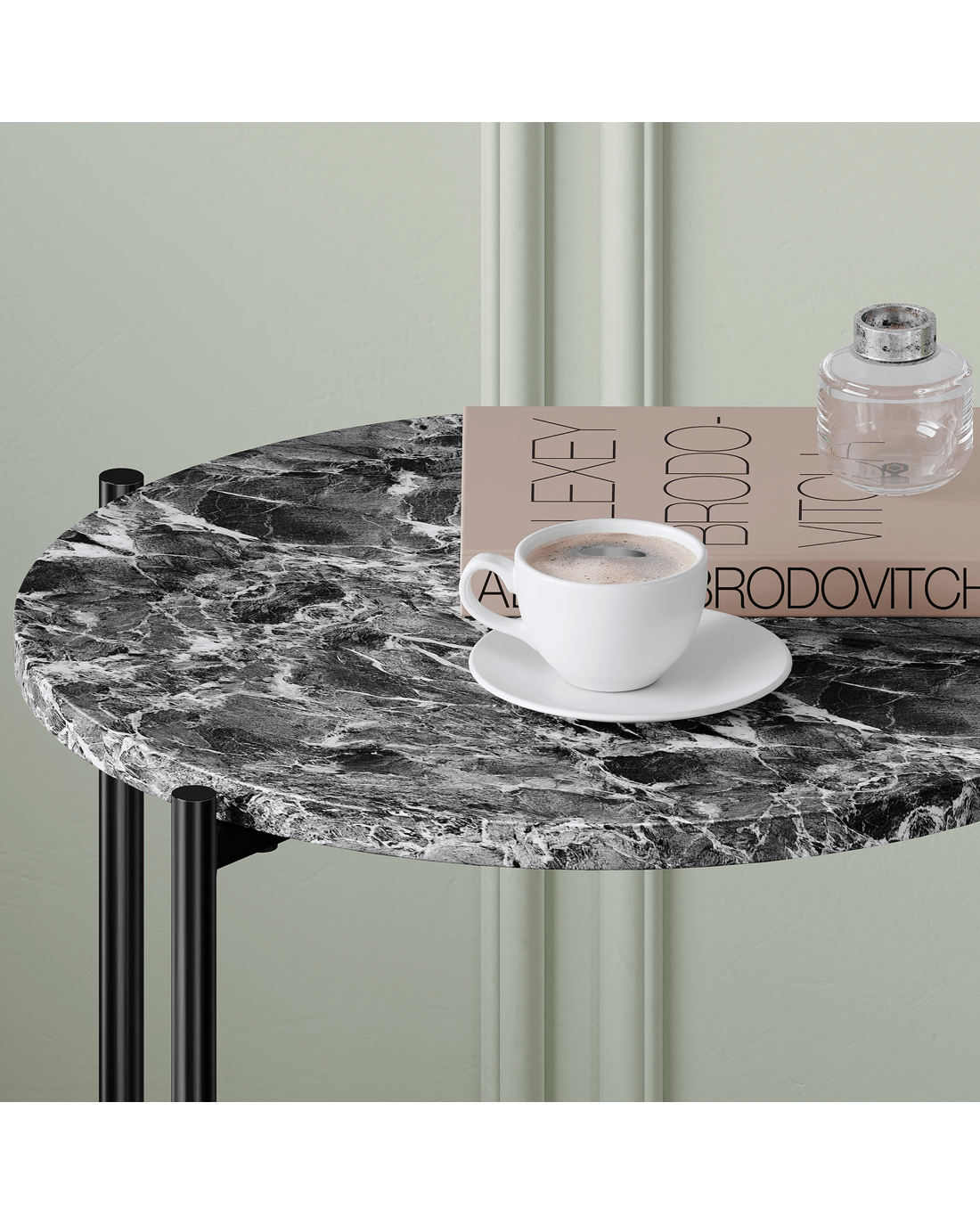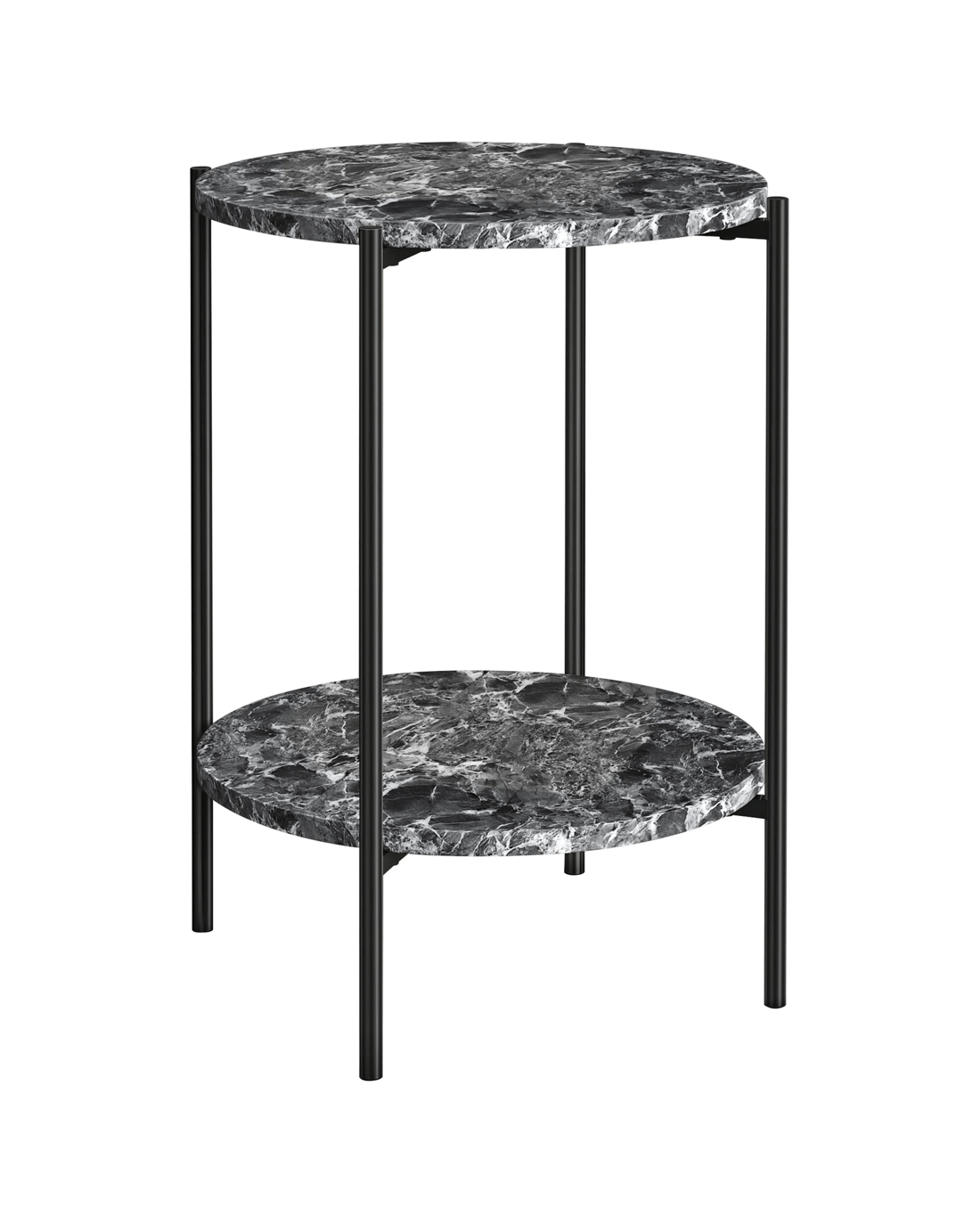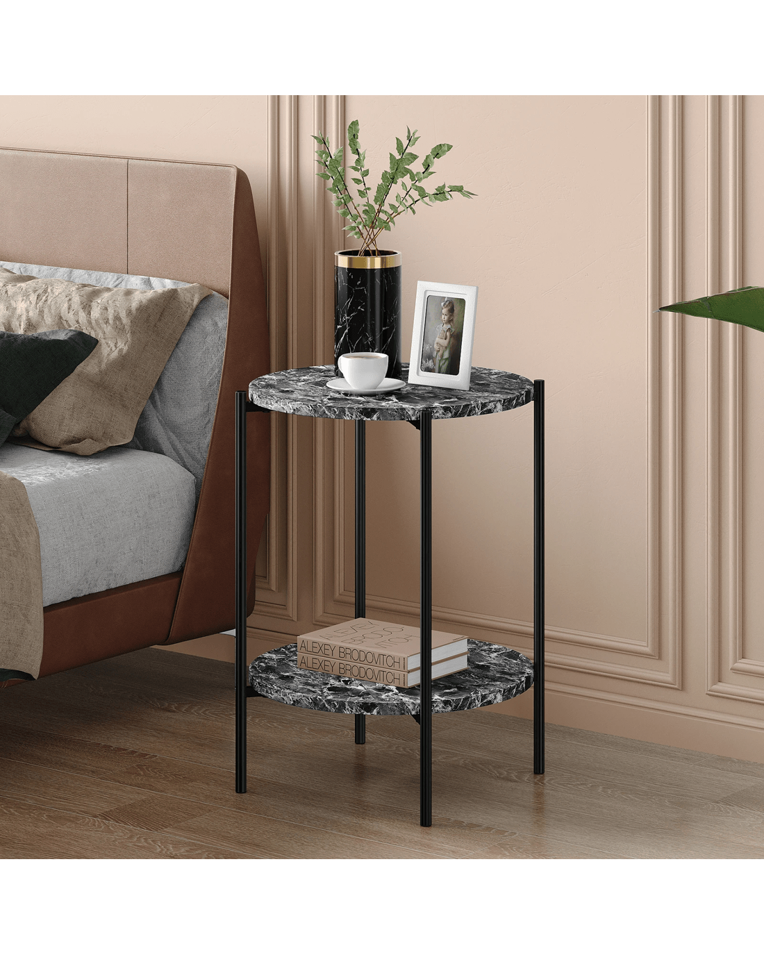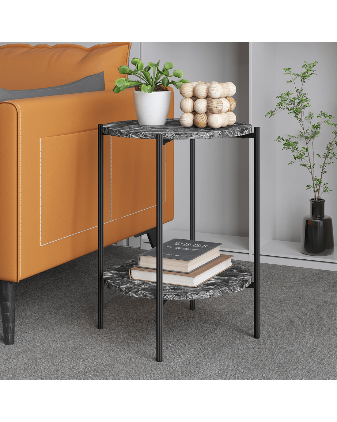 Made of superior 15mm thick particle board and fully covered by PVC for 2-tier shelves, this side table is designed to be highly durable. Supported by heavy-duty metal legs, it ensures a sturdy and stable base. Unlike some other sellers, we have no compromise on materials used. It is not only easy to maintain and clean, but also long lasting and durable. In addition to its practical use, its round shape with delicate marble pattern creats a sense of cohesion and aesthetics to living space.