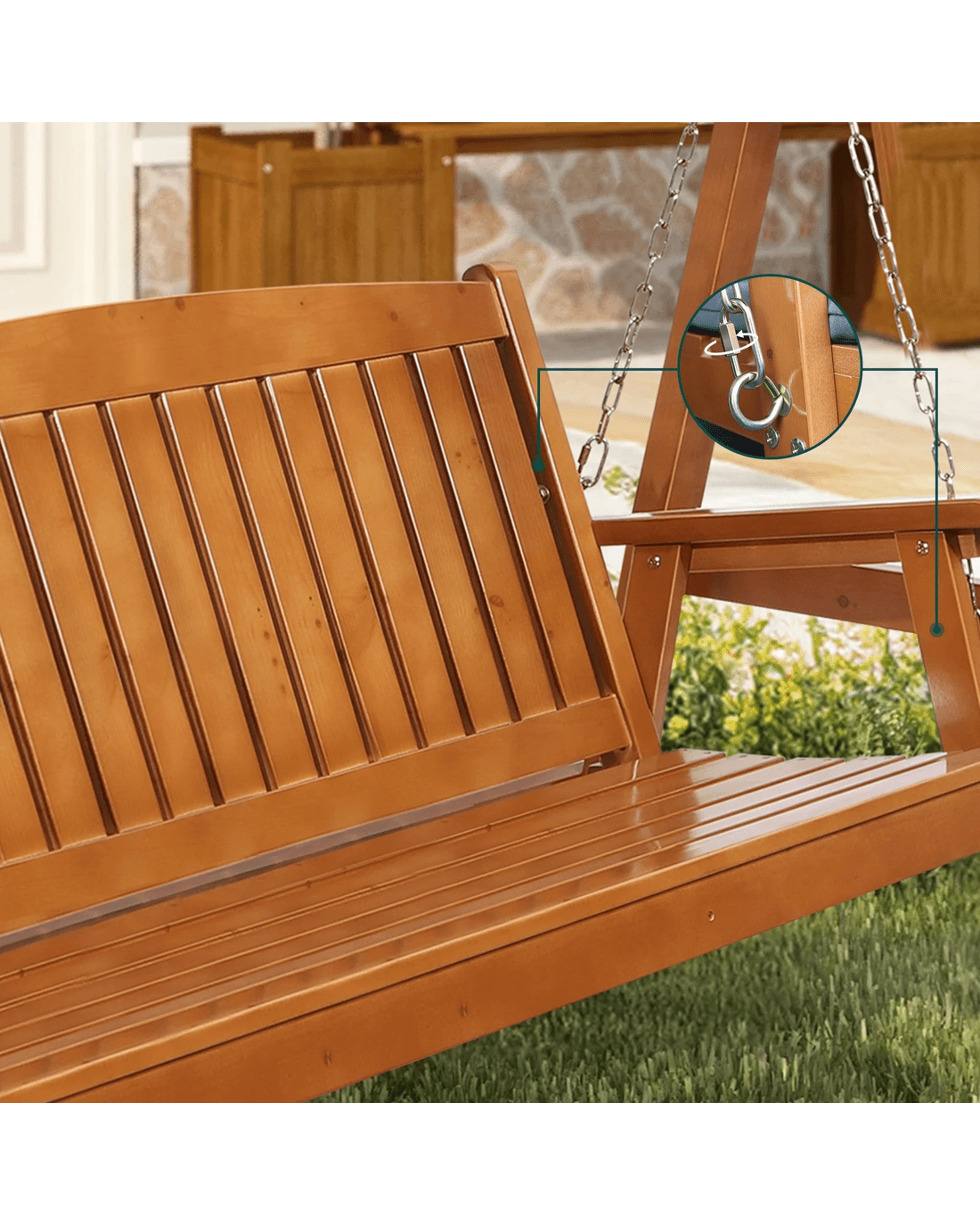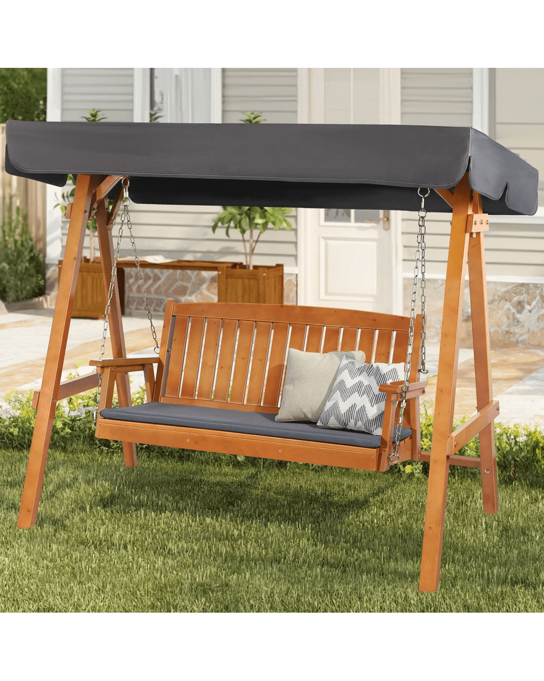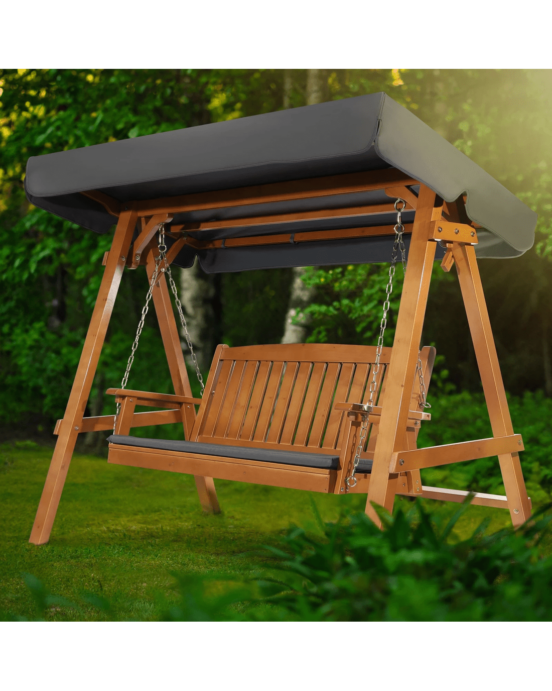 Comfortable seat - A swing seat is all about comfort. With its luxurious natural finish, the curved design of the tilted seat and armrest will allow you to sit and relax. The slatted design of chair not only offers a modern and minimalist look, but only allows water to run through, instead of ponding. Throw in a pillow or two on the generous padded seat cushion, grab a book, and you can while away the hours in perfect bliss.
