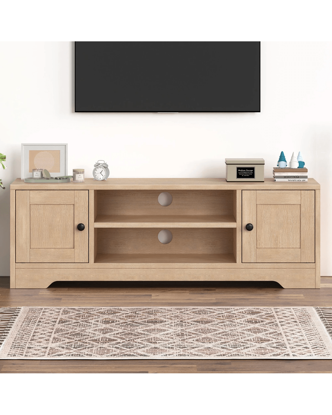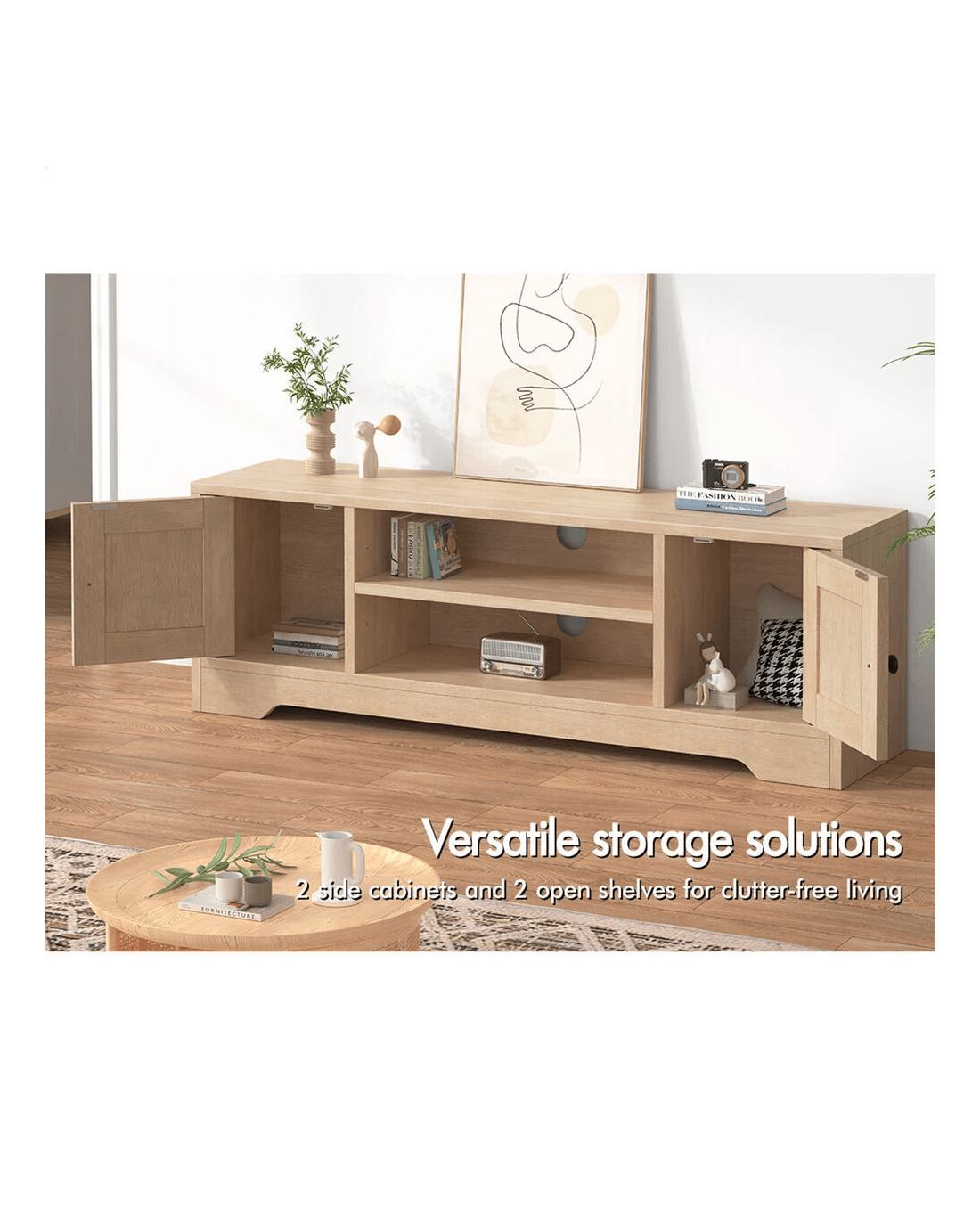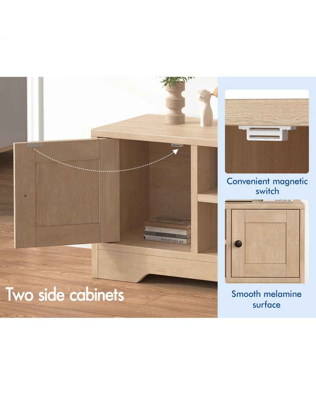 Reliable quality - Made of superior E1 grade and 15mm thick particle board, our entertainment unit is durable and resistant to scratches. Instead of flimsy paper finish, it is well made with smooth melamine finish which is easy to maintain and long lasting. Equipped with magnetic switch, the cabinets quietly open and close so you can access your items with ease.