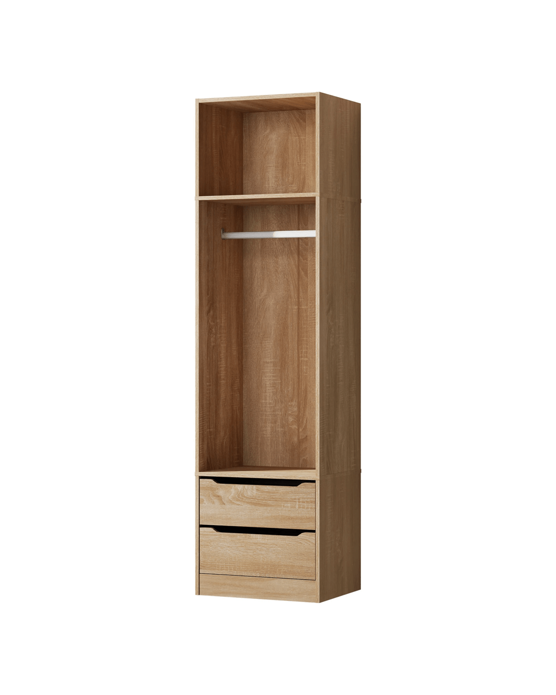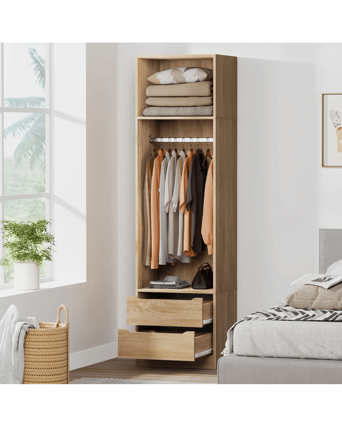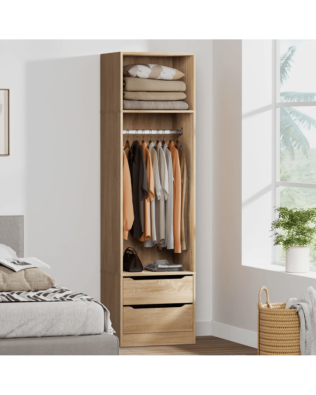 Ample Storage - As a well-organized wardrobe, it provides sufficient space with 2 open shelves and 2 drawers to keep your room tidy and free of clutter. The top shelf offers easy visibility and access to quilt, blanket and pillows, while the middle one with hanging rail is perfectly convenient for storing longer clothes, like dresses, coats and shirts. The smaller concealed drawers at the bottom are ideal for your undergarments, socks and other accessories.