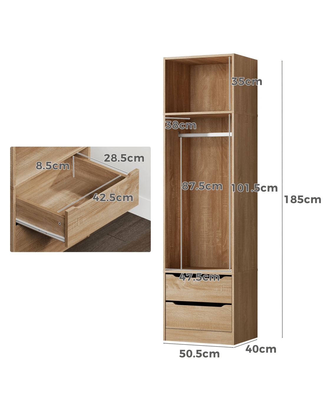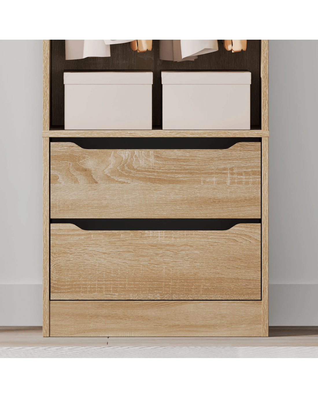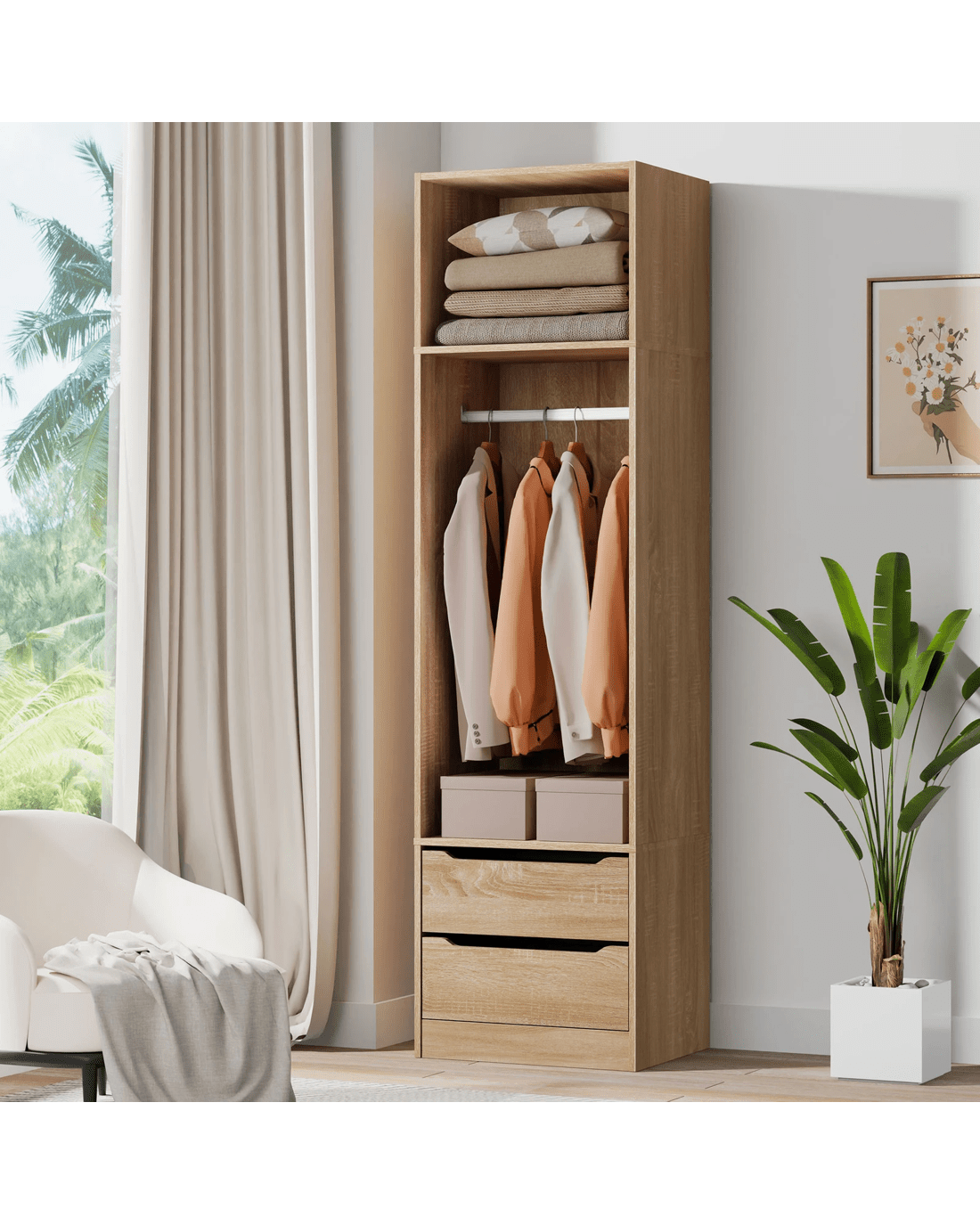 Ample Storage - As a well-organized wardrobe, it provides sufficient space with 2 open shelves and 2 drawers to keep your room tidy and free of clutter. The top shelf offers easy visibility and access to quilt, blanket and pillows, while the middle one with hanging rail is perfectly convenient for storing longer clothes, like dresses, coats and shirts. The smaller concealed drawers at the bottom are ideal for your undergarments, socks and other accessories.