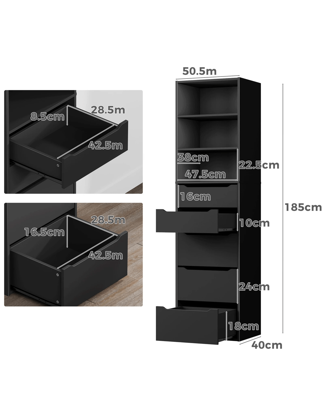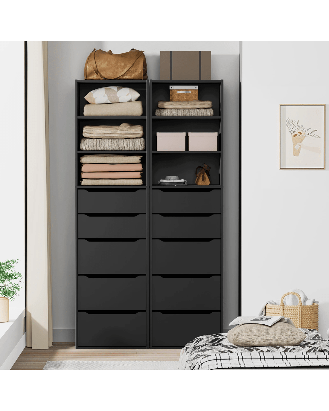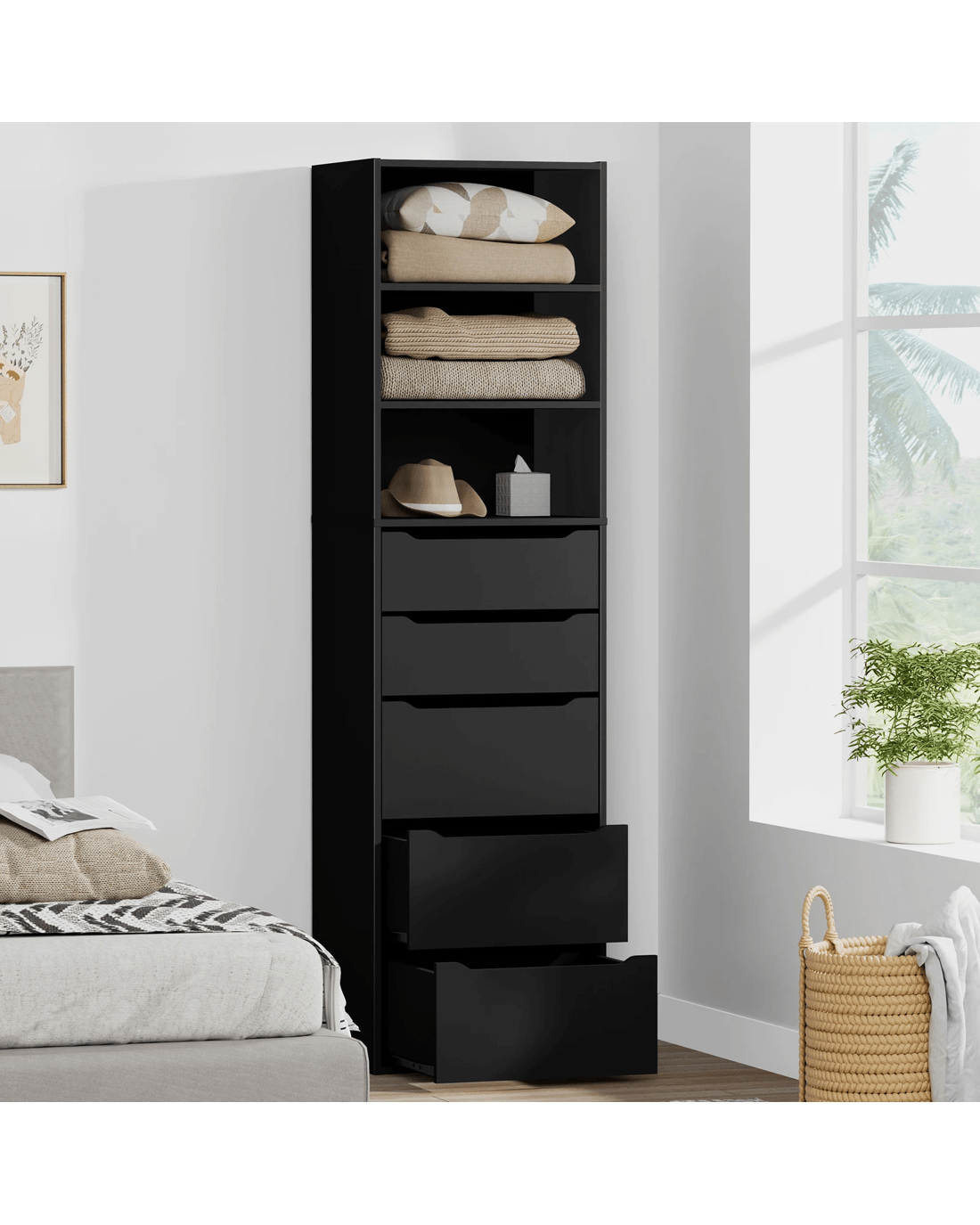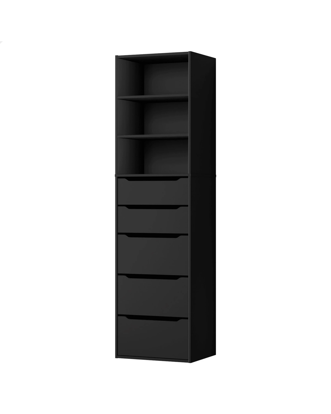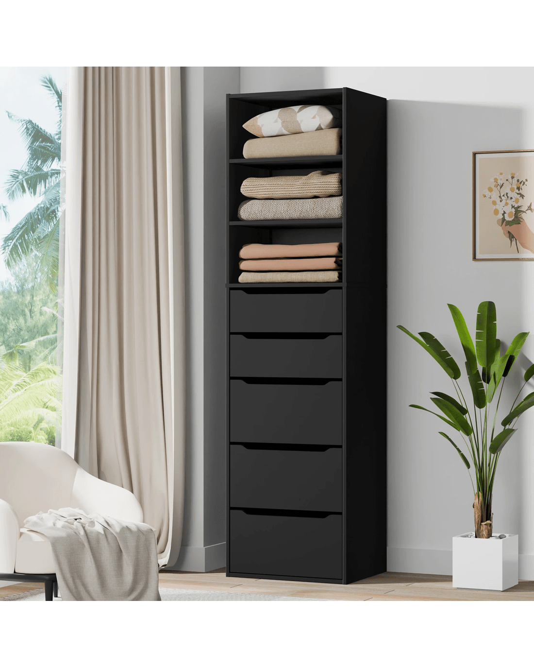 Ample Storage - As a well-organized wardrobe, it provides sufficient space with 3 open shelves and 5 drawers to keep your room tidy and free of clutter. The top shelves offer easy visibility and access to clothing and accessories, making it an ideal choice for those who value convenience. The bottom drawers with 2 sizes allow for flexible storage options to store kinds of clothes, like sweaters, jeans, undergarments, socks, and so on.