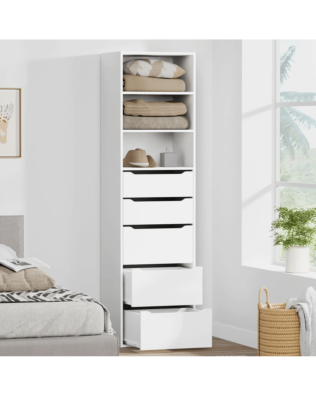 Ample Storage - As a well-organized wardrobe, it provides sufficient space with 3 open shelves and 5 drawers to keep your room tidy and free of clutter. The top shelves offer easy visibility and access to clothing and accessories, making it an ideal choice for those who value convenience. The bottom drawers with 2 sizes allow for flexible storage options to store kinds of clothes, like sweaters, jeans, undergarments, socks, and so on.