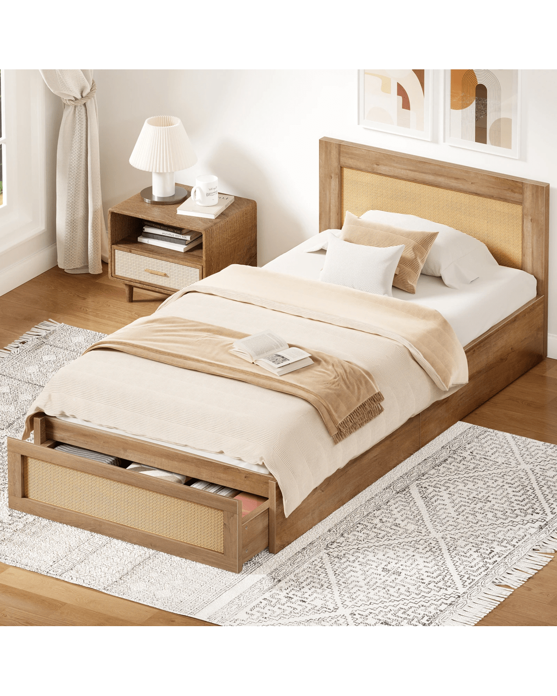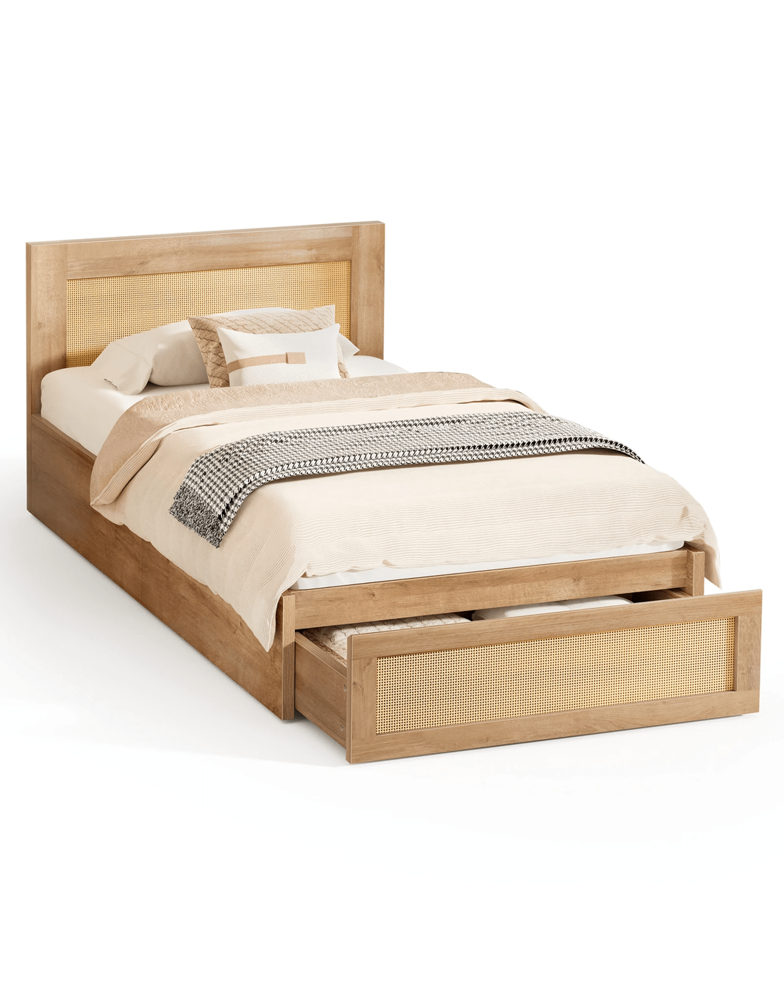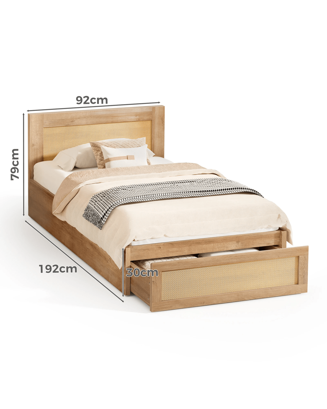 Sold by Aussie Union GroupAlfordson Wooden Bed Frame Single Size Rattan Bed Base with Storage Drawer - Oak