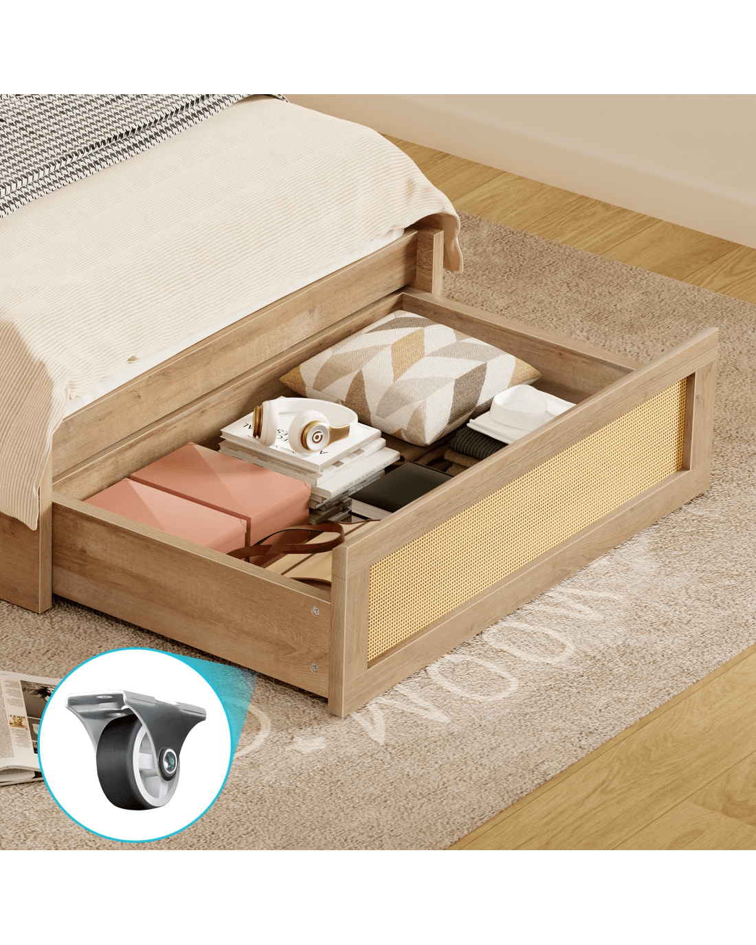 More storage space - The integrated underbed trundle drawer solves your bedroom storage woes effortlessly. Equipped with smooth castor wheels for easy gliding, the spacious drawer provides ample space for storing clothes, bedding, linen and more, keeping your essentials neatly organized and within reach.