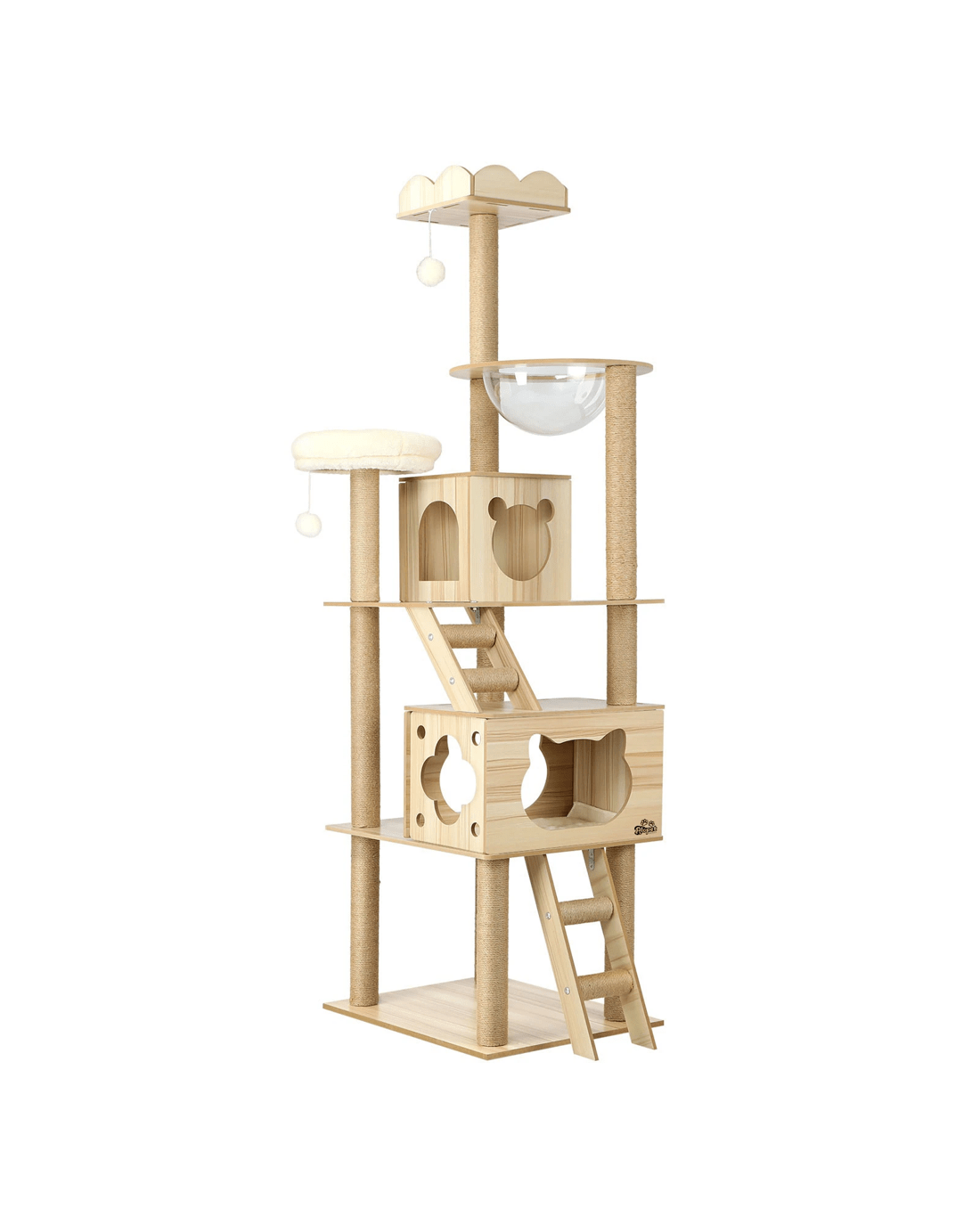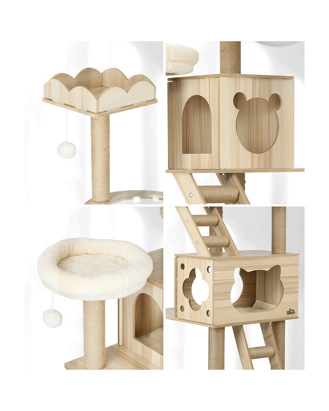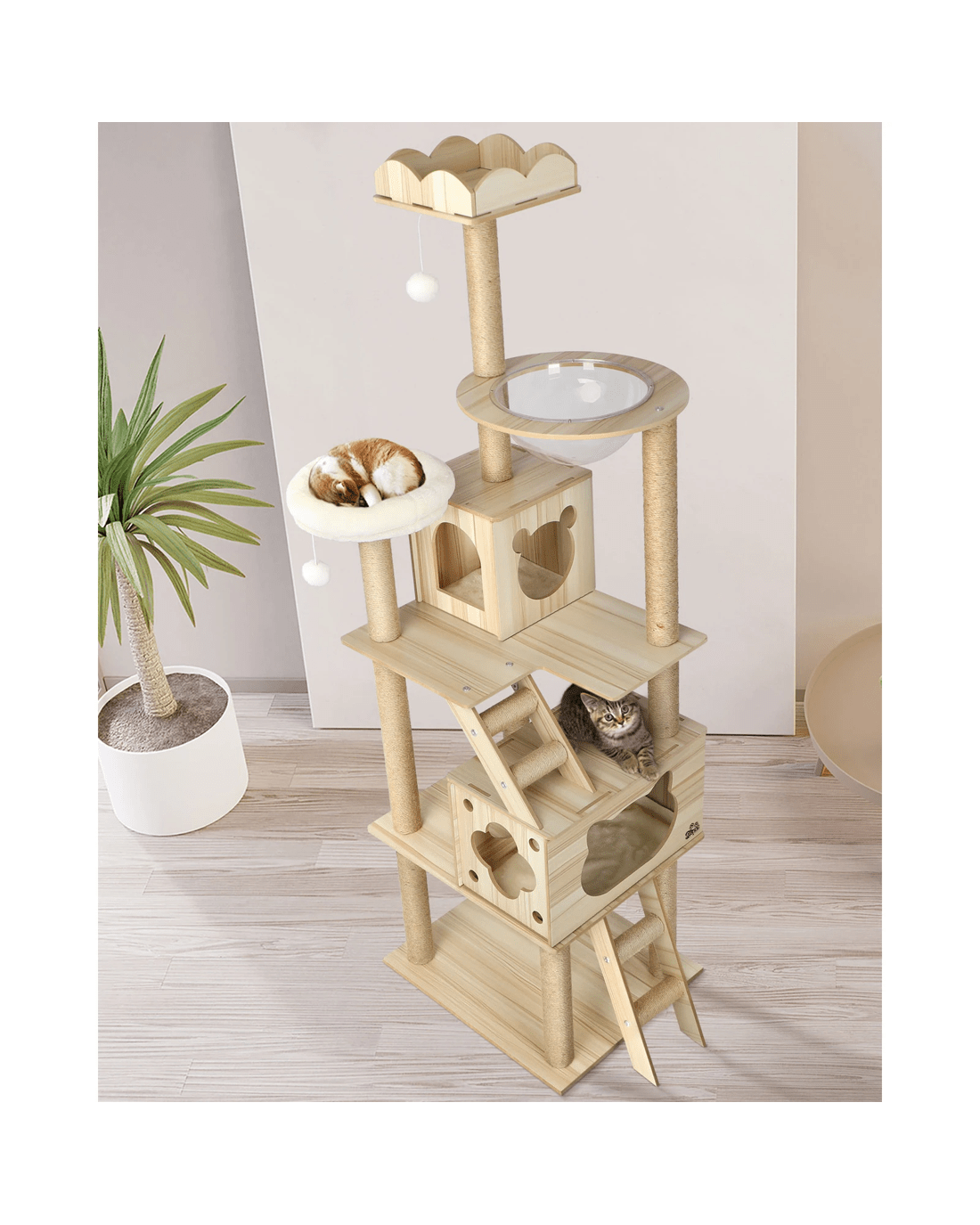 We would recommend placing this cat tree near the window as it's their favorite thing to do on most of the days! Designed with sleeping dens, acrylic bowl, ladder and hanging toy ball, the combination of everything adds more plat to cats and they have their own island to play, nap and jump around!