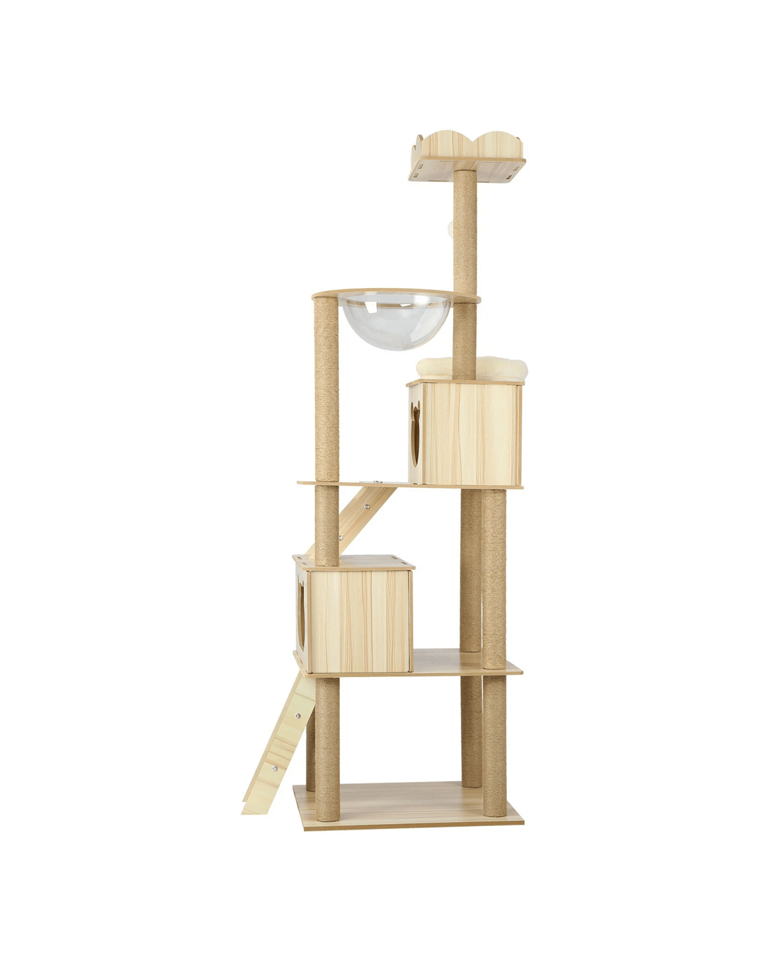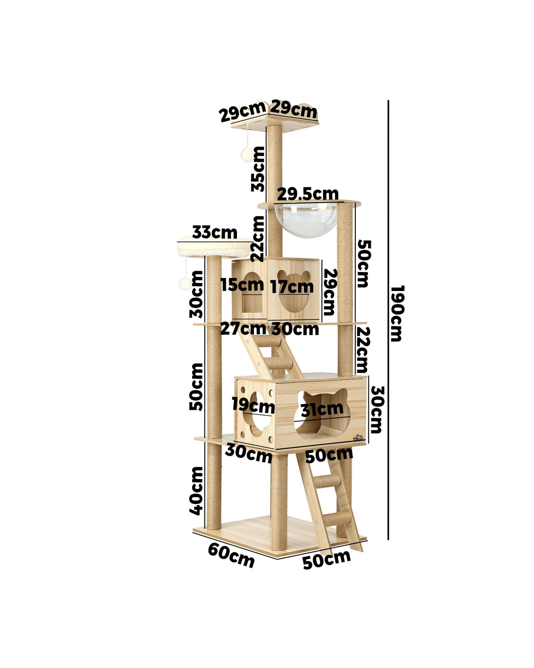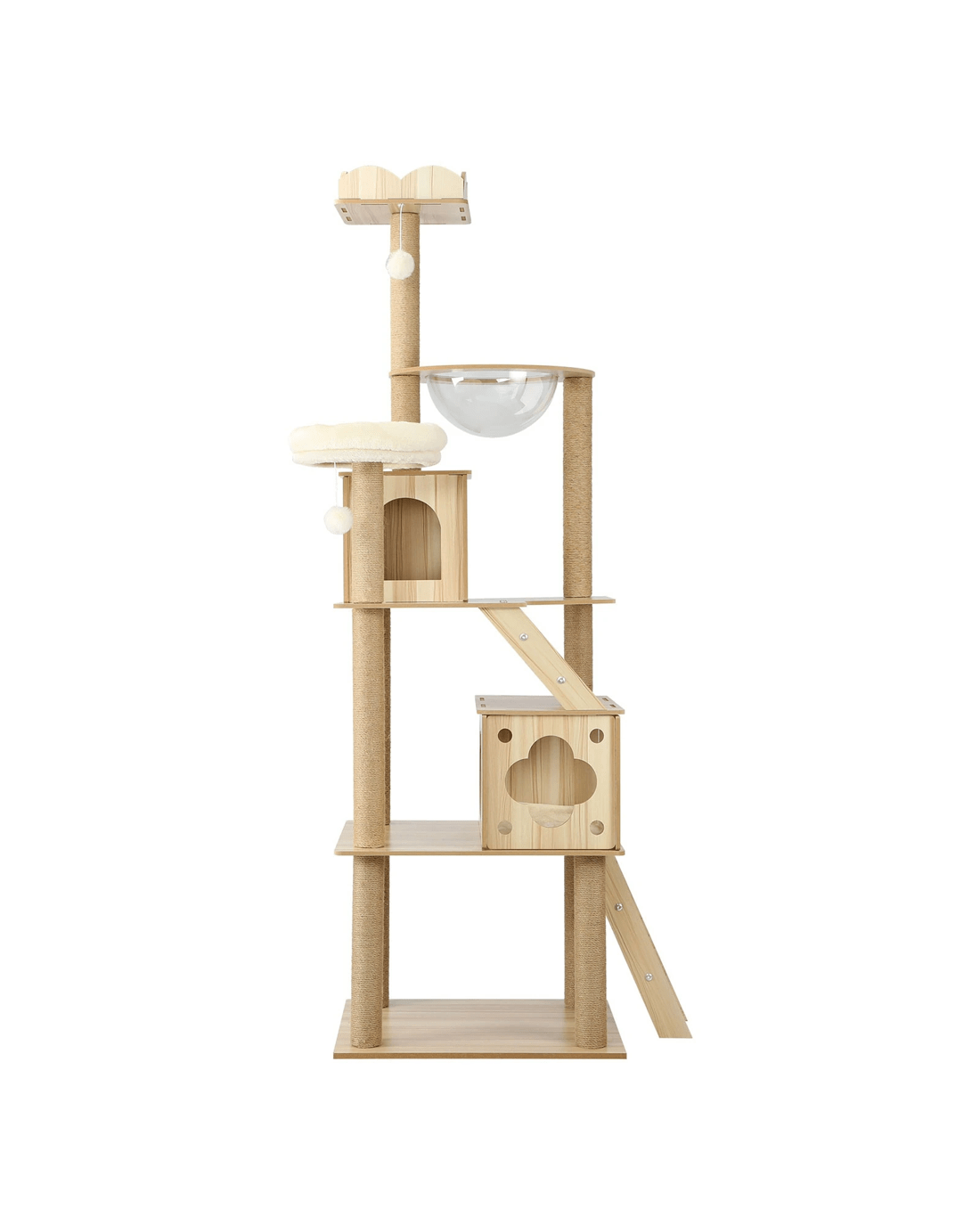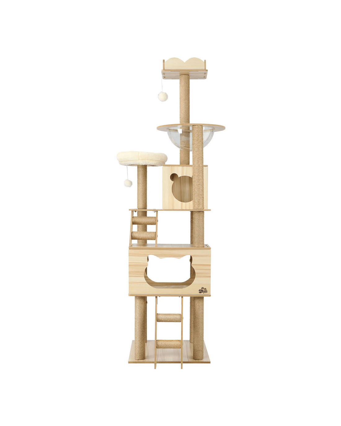 We would recommend placing this cat tree near the window as it's their favorite thing to do on most of the days! Designed with sleeping dens, acrylic bowl, ladder and hanging toy ball, the combination of everything adds more plat to cats and they have their own island to play, nap and jump around!