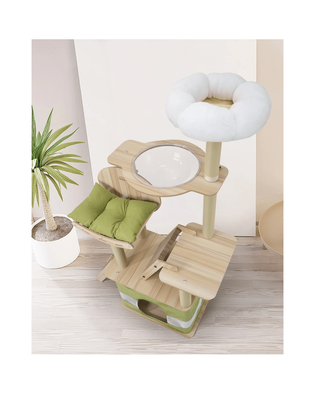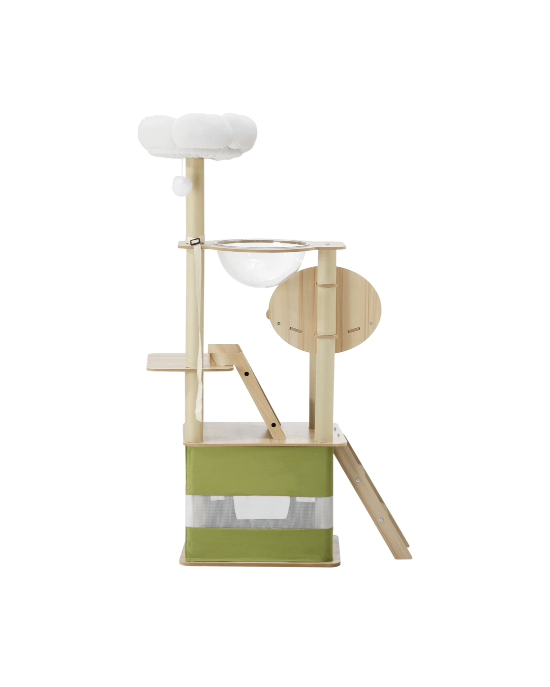 Made of sturdy E1 particle board with a sturdy base, the cat tree is designed for robust use and maximum stability, and yet comfortable enough with its plush posts to get your cat purring with delight at every post, nook and corner, and a detachable transparent bowl to observe kitty as it cuddles in play. Better still, set-up is quick and fuss-free so that your cat can get on to all that it naturally loves to do with our cat tree in no time at all. A happy cat is a healthy cat indeed. And there's no better place to start than with our Alopet Cat Tree.
