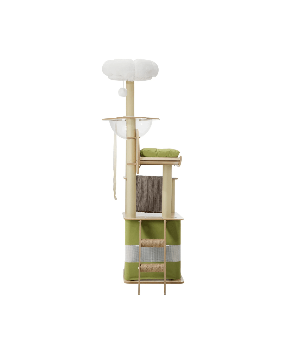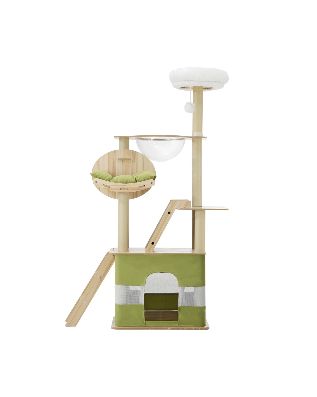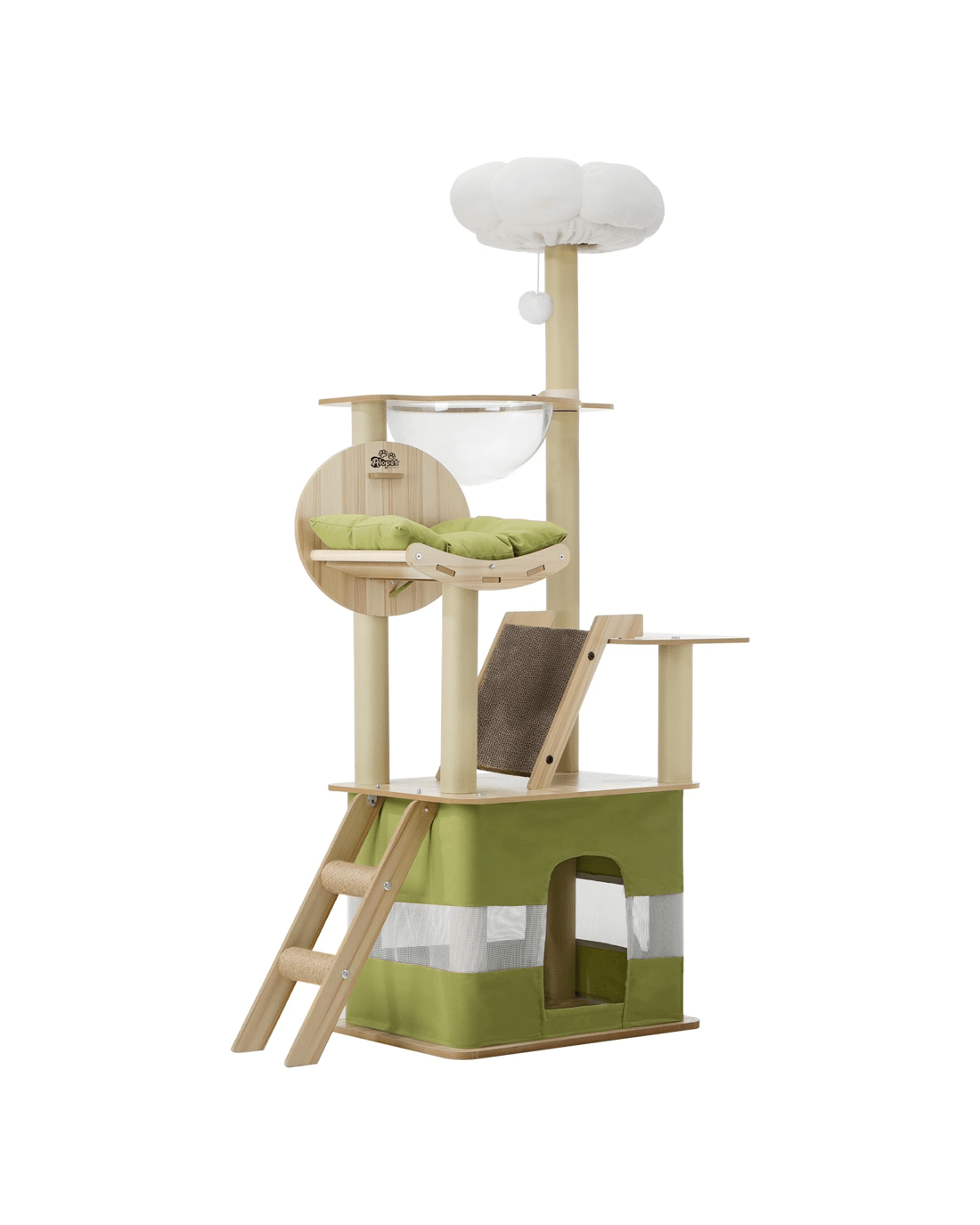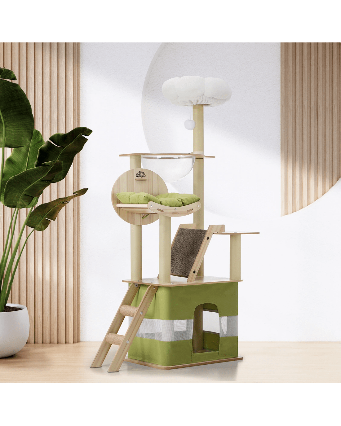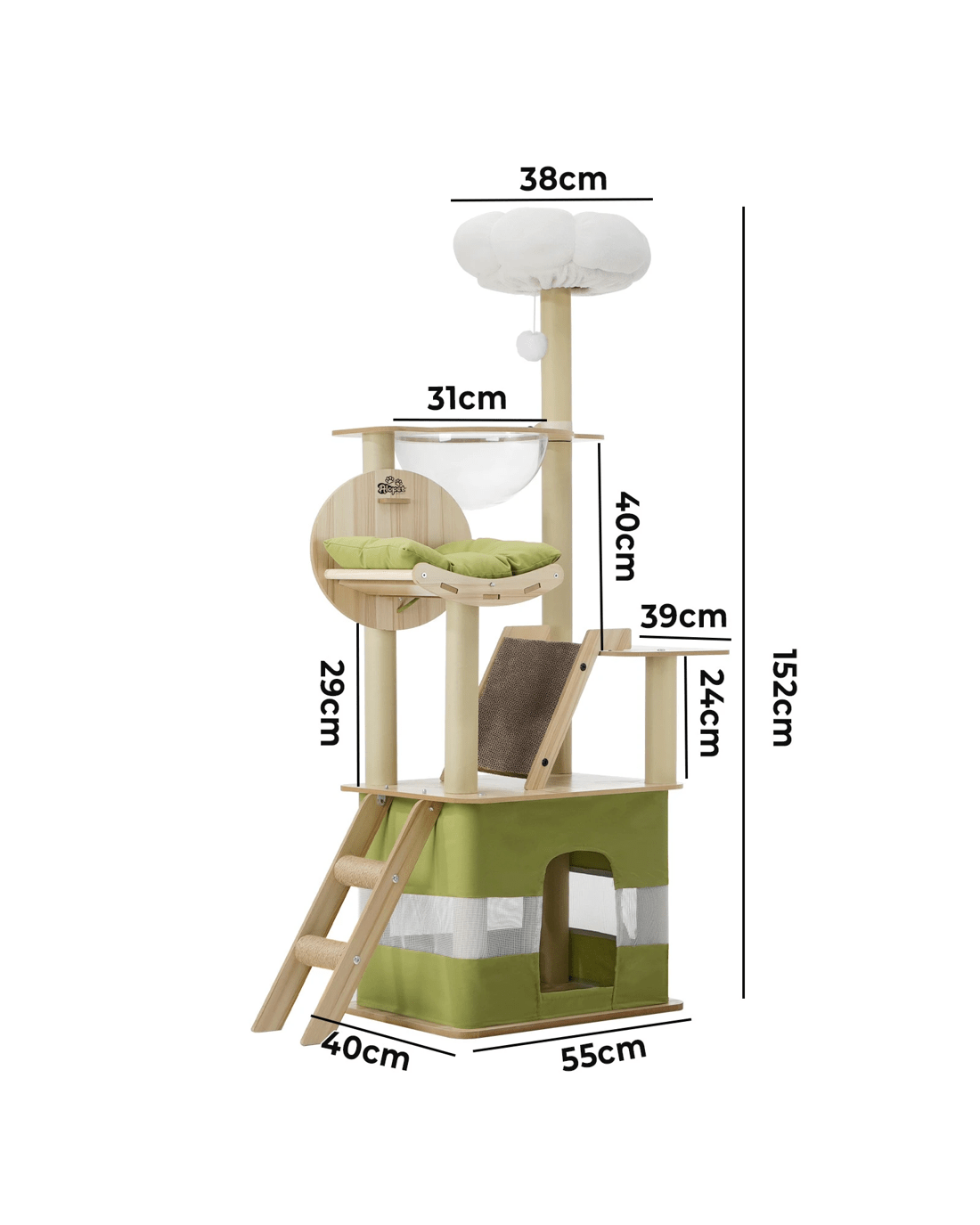 Cats and cat trees simply go together like bread and butter. And our Alopet Cat Tree is made perfect for your feline friend to satisfy all its innate instincts. From jumping, climbing and hopping around with the cat tree's multi-level platforms or napping and hiding away in dedicated cubicles and doing everything else in between, your pet will enjoy every aspect of the cat tree. Such as the natural sisal-wrapped posts to sharpen and maintain their claws freely, and thankfully not on your prized furniture and other household items, and various play spots and a hanging ball to entertain and stimulate your cat for hours. Ladder, hammock, sleeping cubicle and den, and even a fluffy top as a plush vantage point for your pet to seek out.