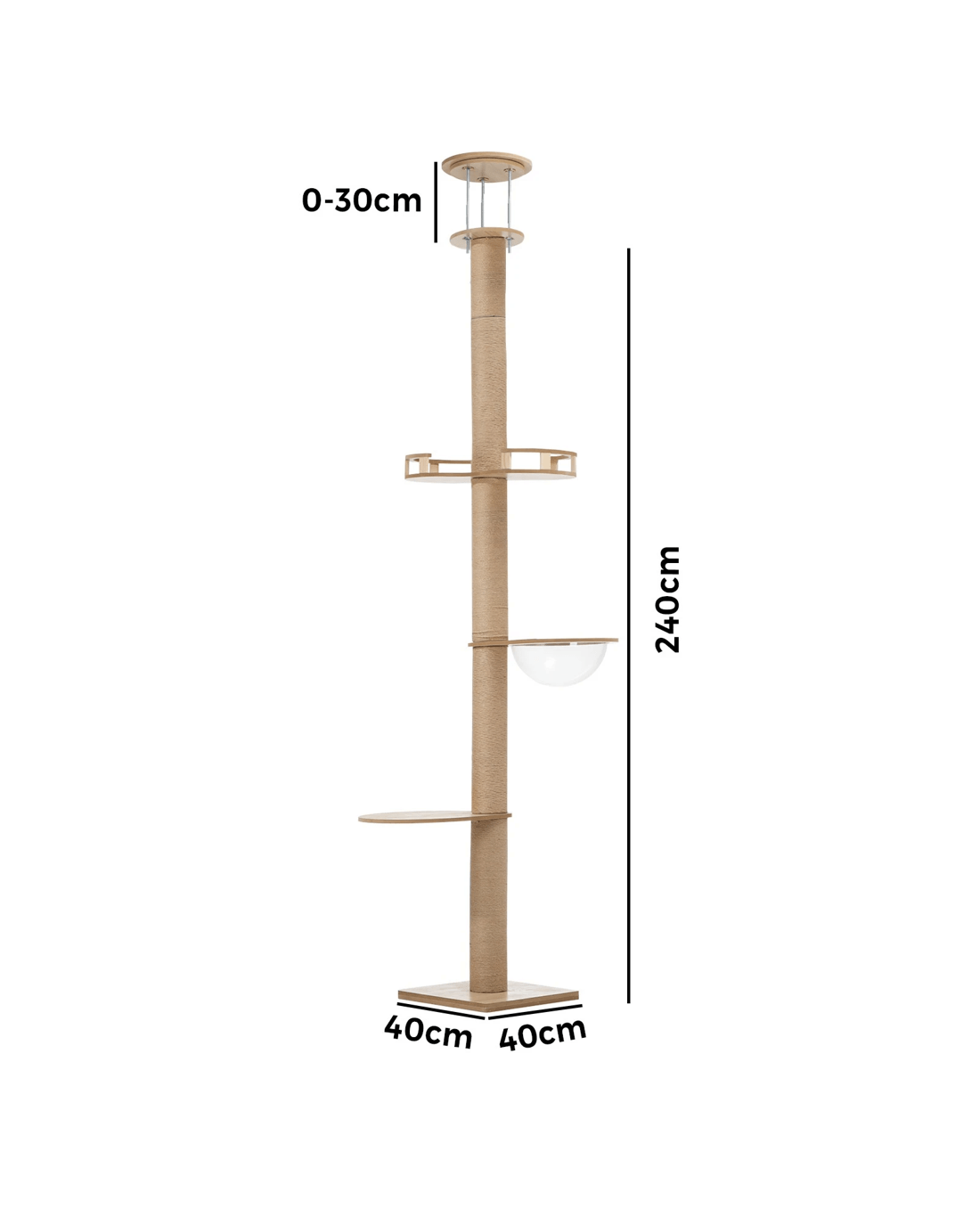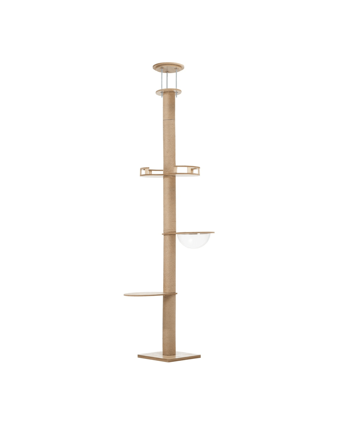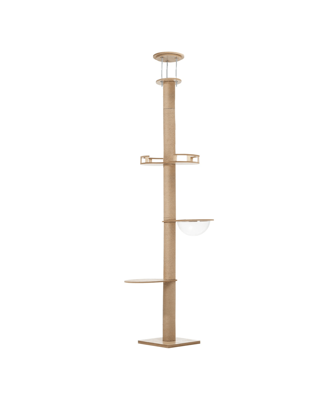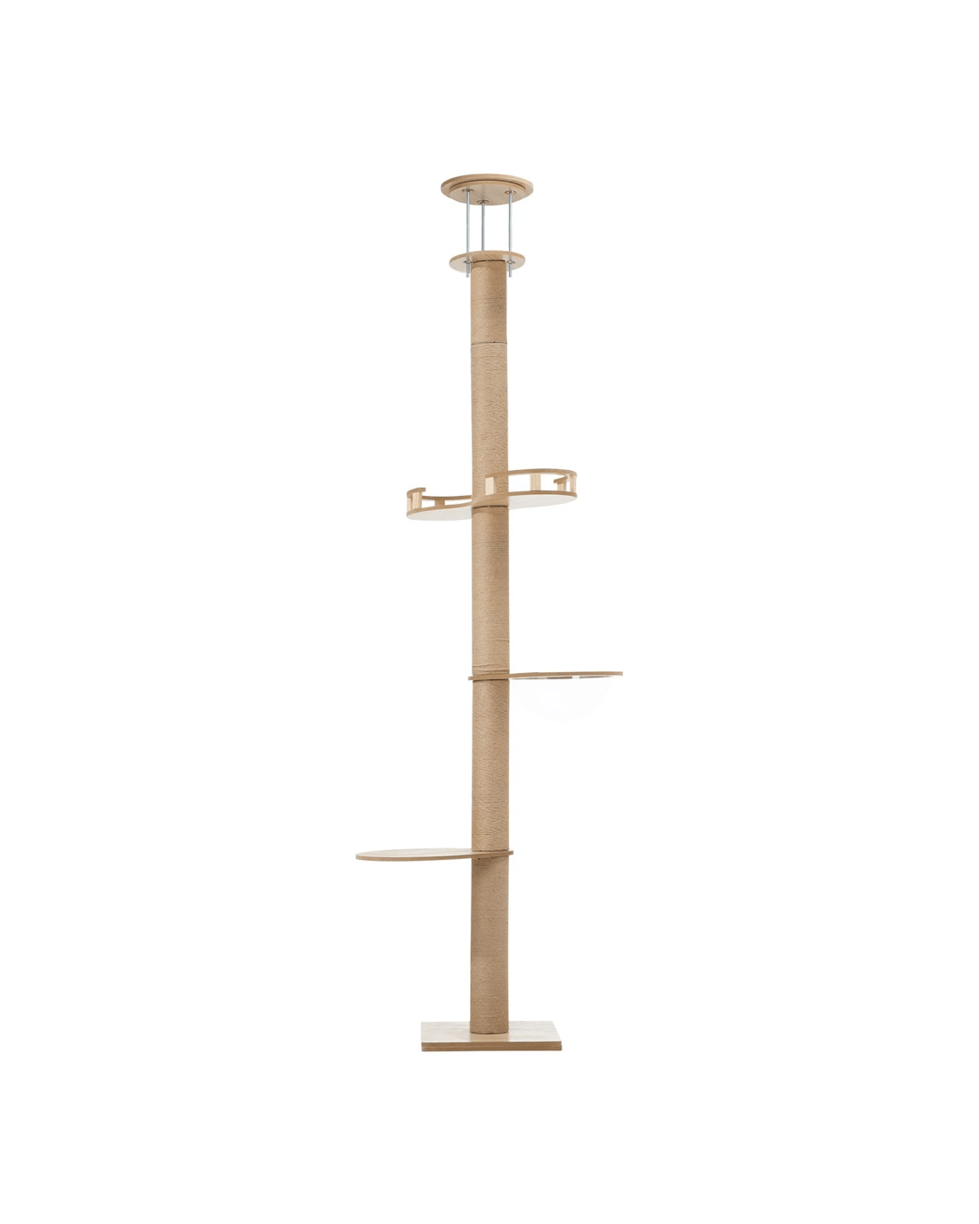 But what's really unique about this cat tree is its floor-to-ceiling setup for maximum stability. With a 3-pole metal support and an adjustable height of between 240cm and 270cm using wing nuts, the cat tree is held in place through pressurised force between the floor and ceiling. No drilling is required at all and the entire structure remains firm and steady and not susceptible to any bends.