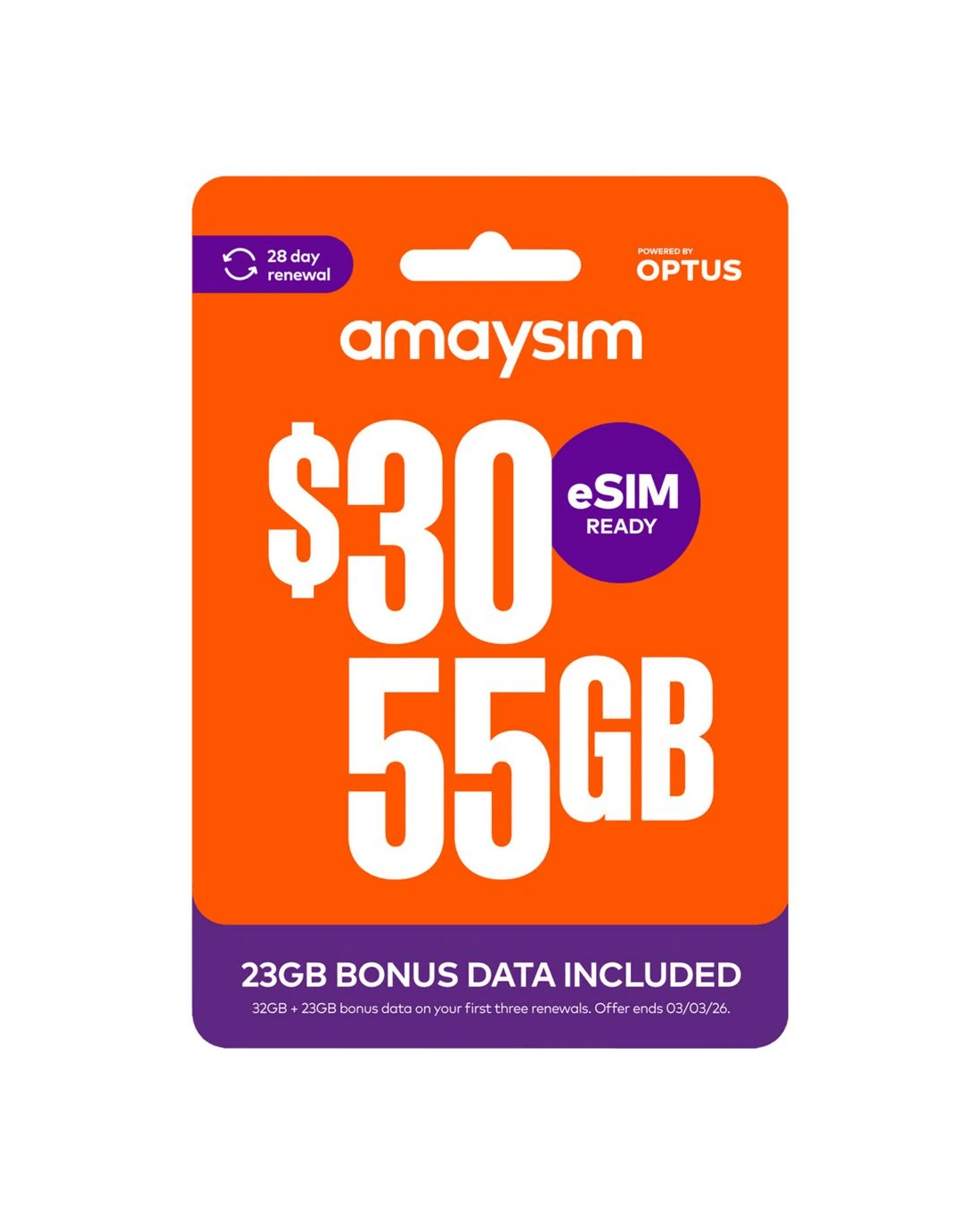 The amaysim Starter Pack is ideal for connecting to the 5G or 4G network to connect with friends, view media, and more. It provides unlimited standard talk and text in Australia and to 28 countries, as well as 32GB of data, plus 23GB bonus data for the first 3 renewals.