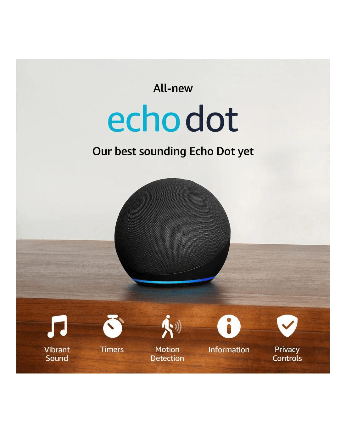The Amazon Echo Dot 5th Gen is Amazon's most popular smart speaker, featuring a sleek design that fits into any decor theme. Enjoy enhanced audio for vibrant sound anywhere in your home, stay on track with help from Alexa, and control compatible smart home devices with your motion.