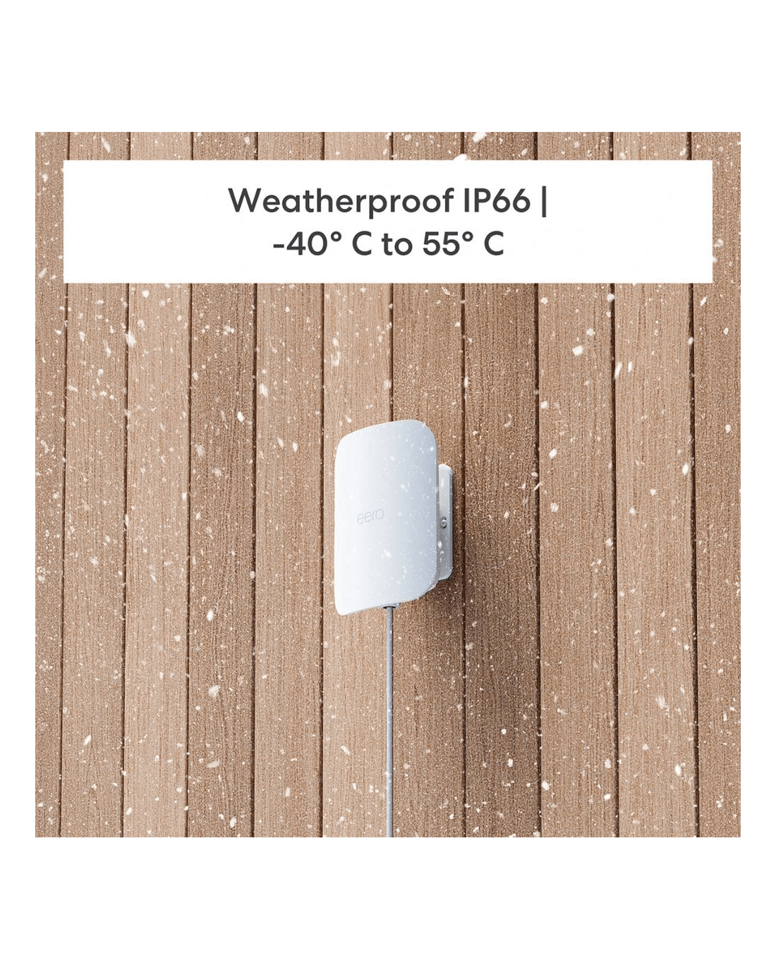 • Built for all seasons (IP66): eero’s first weather proof outdoor device. IP66-rated protection from dust, rain and snow. Tested to operate in extreme temperatures from -40oC to 55oC, ensuring reliable performance year-round. Includes mounting kit for wood, vinyl siding, fiber cement, and stucco.
