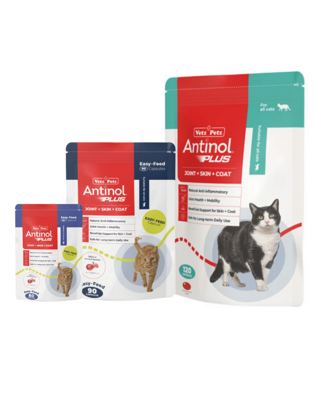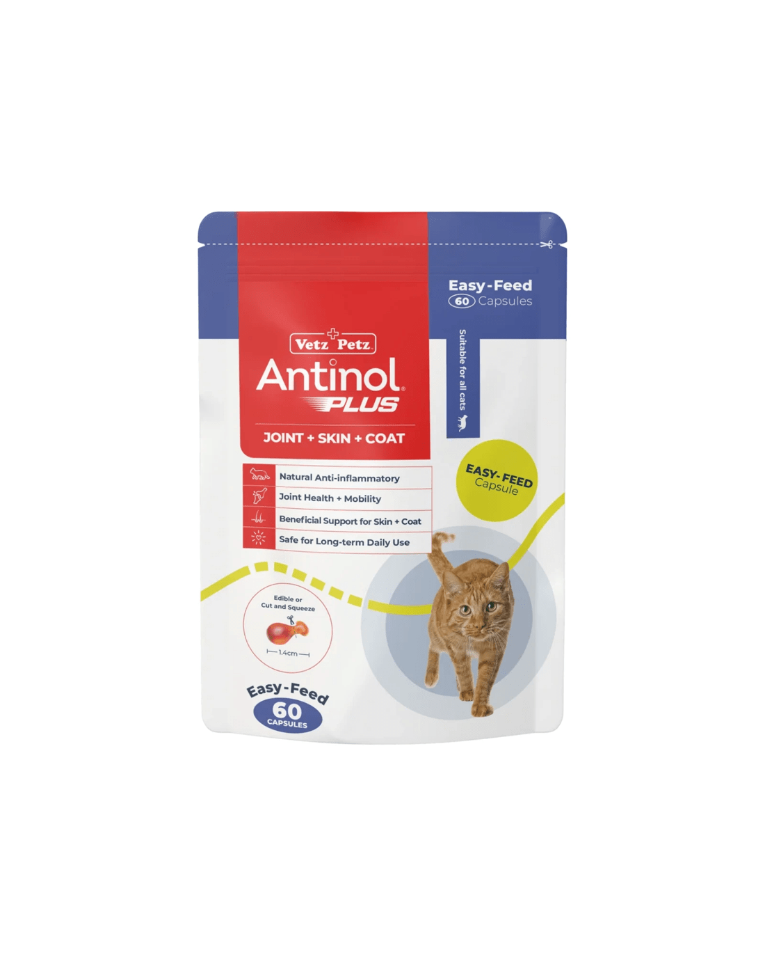 Antinol® Plus is a natural anti-inflammatory and antioxidant supplement that supports joint mobility, skin health, and overall well-being. Made from a patented blend of fully traceable, sustainably sourced marine lipid oils, it’s rich in essential fatty acids and antioxidants to help your cat move and feel their best.