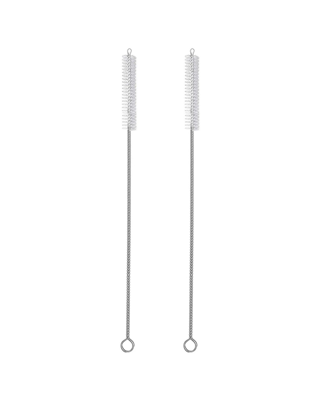 Each set includes two stainless steel brushes featuring long, thin handles with coiled wire bristles at one end. The cylindrical wire bristles are crafted for effective scrubbing of the interior of reusable straws, helping to remove residue and prevent build-up. The handles are equipped with small loops at the bottom, allowing for easy hanging or storage when not in use. The brushes can be stored inside the straw for compact and hygienic storage.