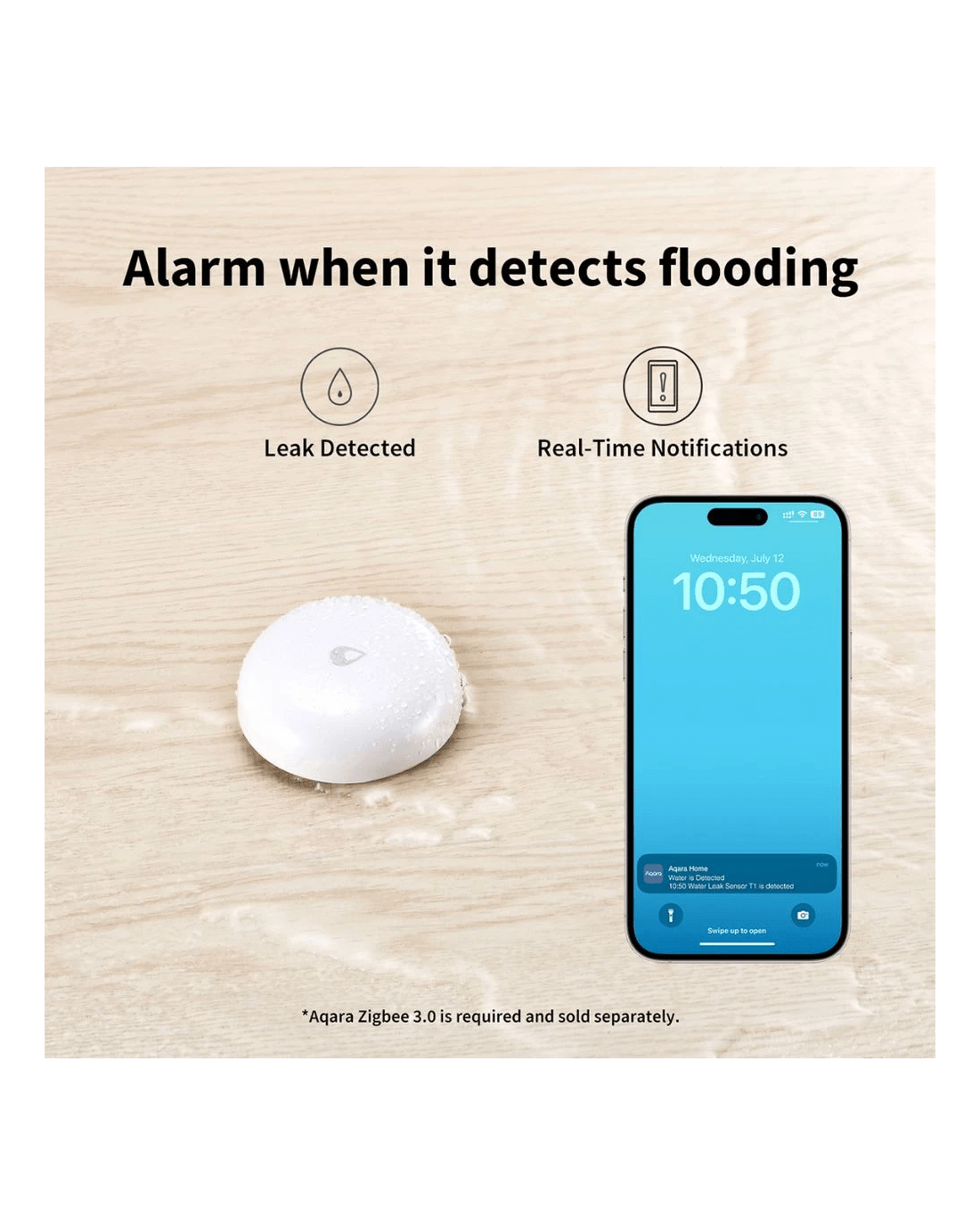- Triggers Aqara Hub Alarm and Push Notifications: When the water level reaches up to 0.5mm, the Water Leak Sensor T1 will trigger the Hub to sound an alarm and send a notification to your phone.