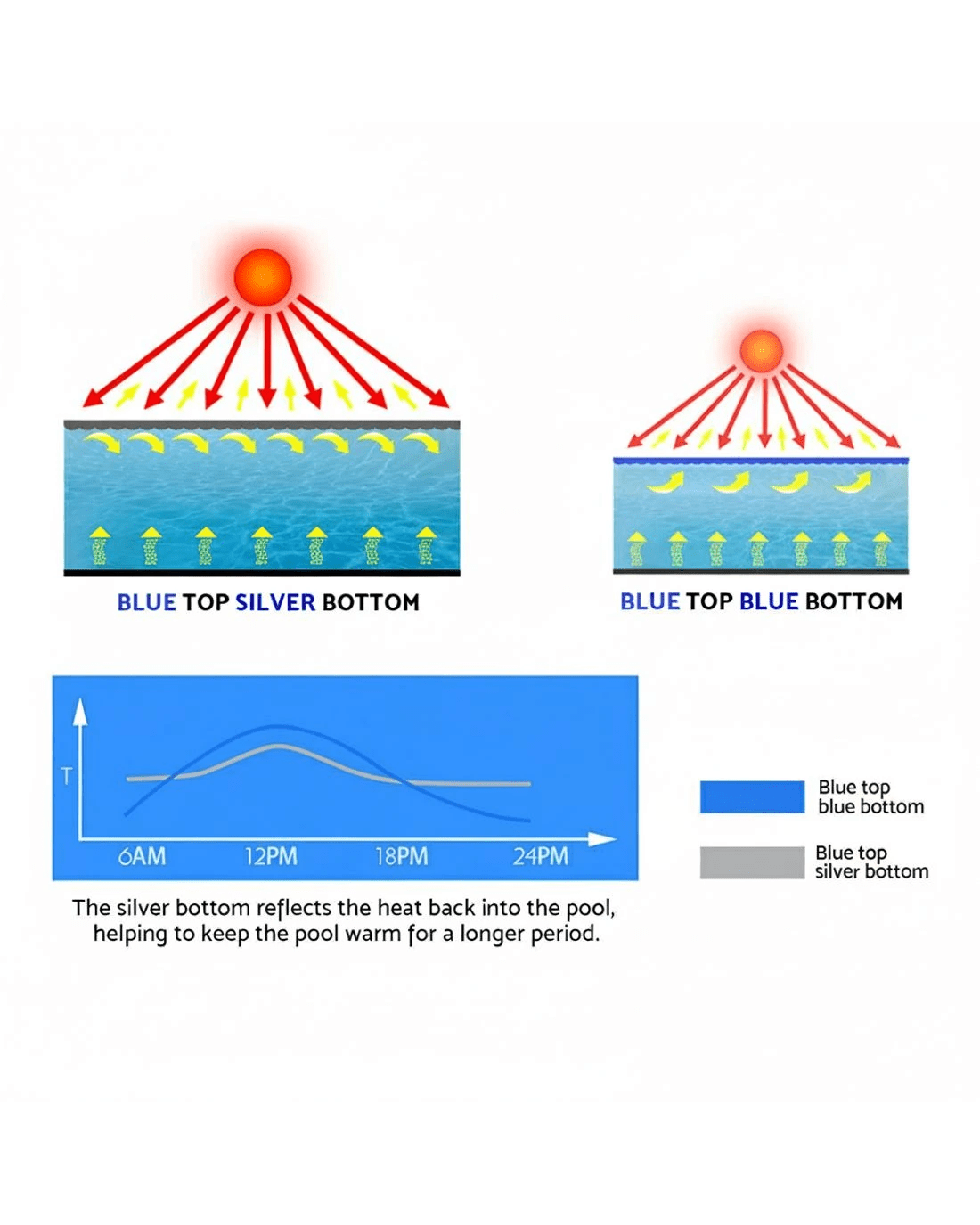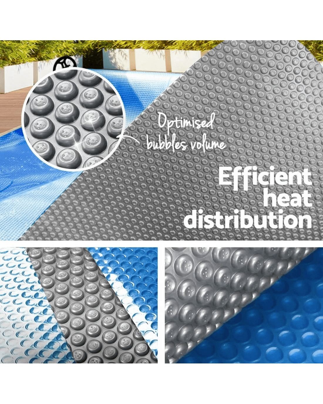 LDPE. It's the key to having a great swimming pool all year around. The acronym actually stands for Low Density Polyethylene. A thermoplastic that can withstand temperatures of up to 80℃ continuously. It's also what our Solar Pool Cover is made of to face up to the heat of the typical Australian summer. Incorporating an innovative split blue and silver isothermal design, the solar pool cover is able to let heat pass through via the translucent blue rippled surface during the day. At the same time, the silver underside acts to traps the heat to keep the pool warmer (about 5℃ more) longer. No more cold starts to a nice dive!
