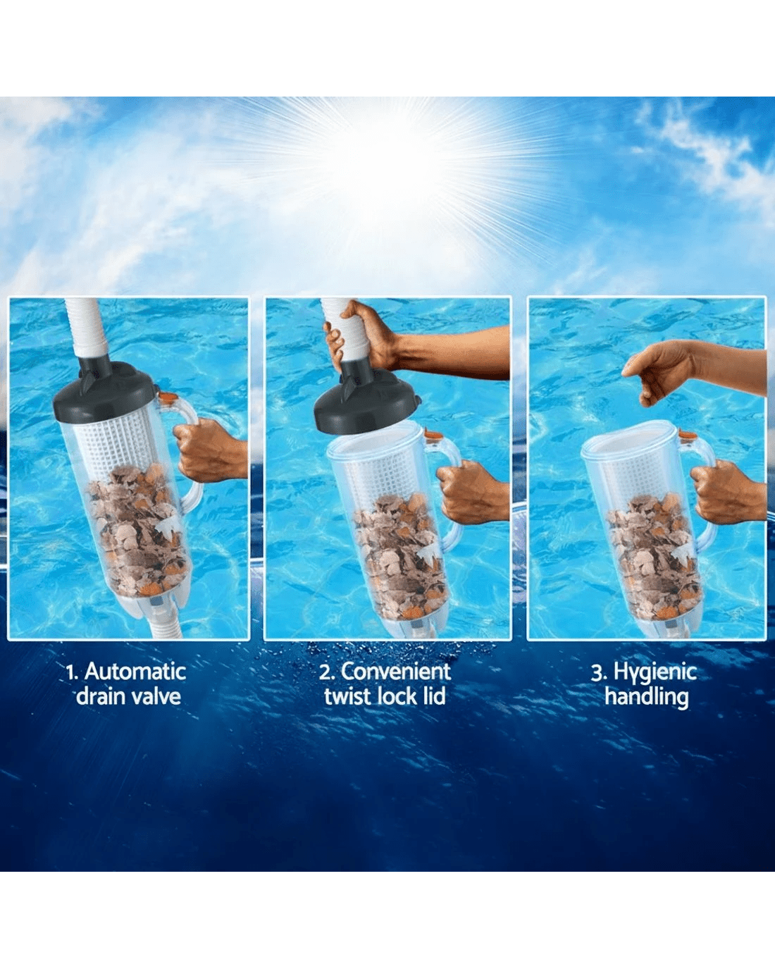 If you're tired of dealing with a clogged pool filtration system, our pool leaf catcher is a must have! Simply connect it to your pool pump hosing and enjoy a worry-free pool experience. Our catcher has a large capacity, heavy-duty basket, and a secure lid lock to keep debris out. Its easy view and easy clean design, along with the integrated handle, make maintenance a breeze. Plus, the reliable suction protection and universal compatibility make installation a snap. Save time and protect your pool with Aqua Buddy trusted and convenient leaf catcher!