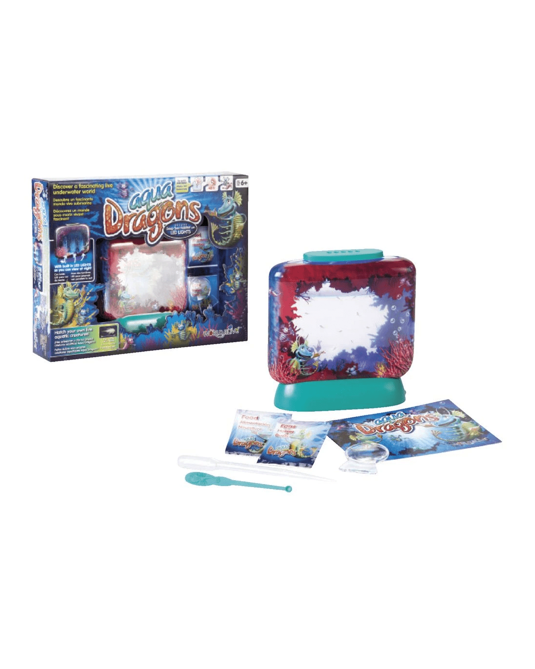 - This kit includes a double-sided tank with LED lights, eggs and food packets, feeding spoon, aerator and an instruction booklet.