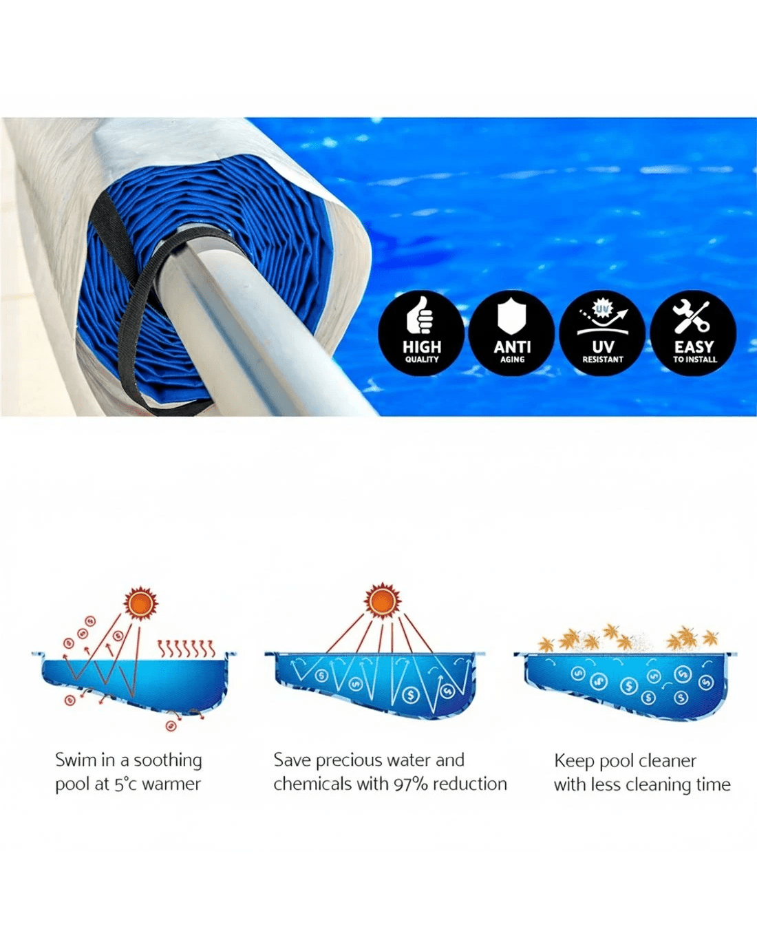 Keep your pool clean from debris and warm from the power of the sun with Aquabuddy's Aluminium Pool Roller and 10.5m x 4.2m Pool Cover. Made of sturdy aluminium construction with full adjustability, this pool roller is suitable for pool with a width between 2.4m-5.55m. It is equipped with premium anodized aluminium alloy stands, plastic wheels for maximum portability, and an exclusive non-slip spinning wheel design to easily roll up your pool cover and get right in the water. The solar pool cover is made from premium low-density polyethylene 500 Micron, which makes it extremely durable. What's with the blue top and silver underside, you ask? Well, the design allows the sun rays to penetrate the pool, increasing the temperature and significantly reducing water evaporation. Aquabuddy helps heat the pool easier and faster, and retain more heat in the pool for a longer time. Finally, the cover keeps the pool water clean all year round, reducing the time spent maintaining the water, pumps and filters. Save money, save time, save summer! Get the best of natural resources and save money on chemicals and water; get yourself an Aquabuddy Pool Roller and 10.5m x 4.2m Cover set today!
