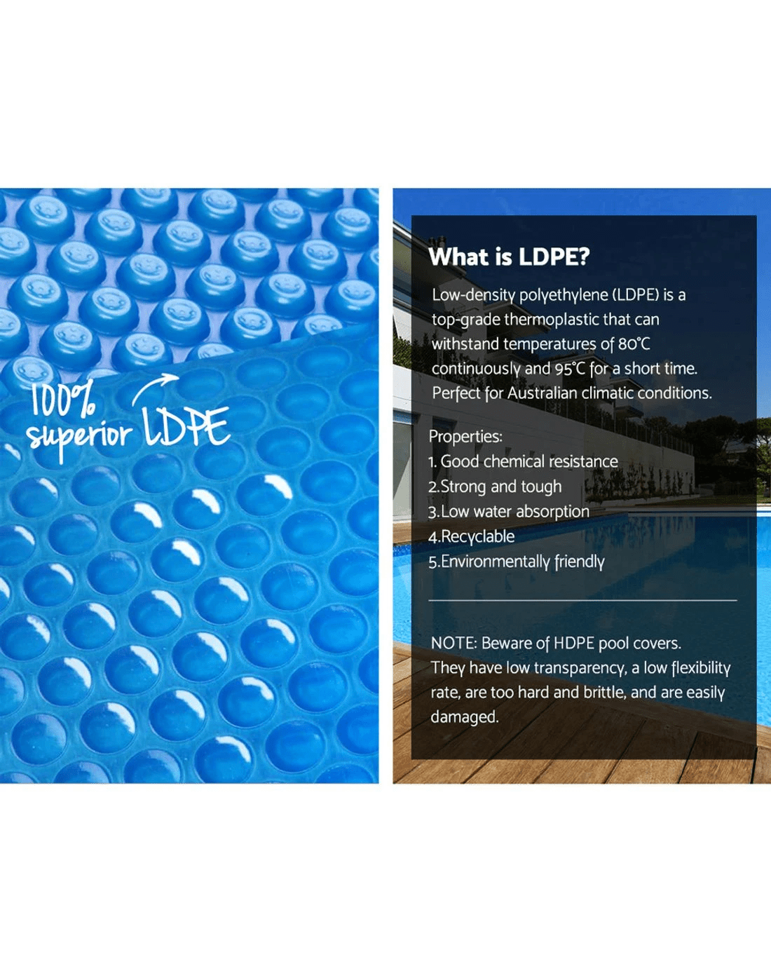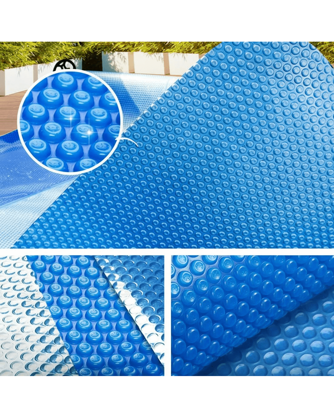 Made of premium low density polyethylene 500 Micron and isothermal design, this solar pool cover is extremely durable and can efficiently and effectively distributing the heat to the water. It allows sun heat to penetrate to the pool; increasing the temperature in the water as well as can significantly reducing water evaporation.