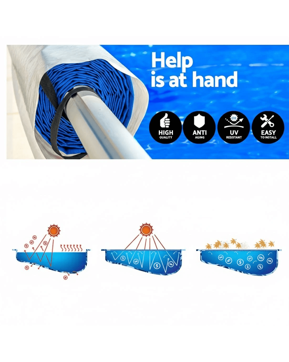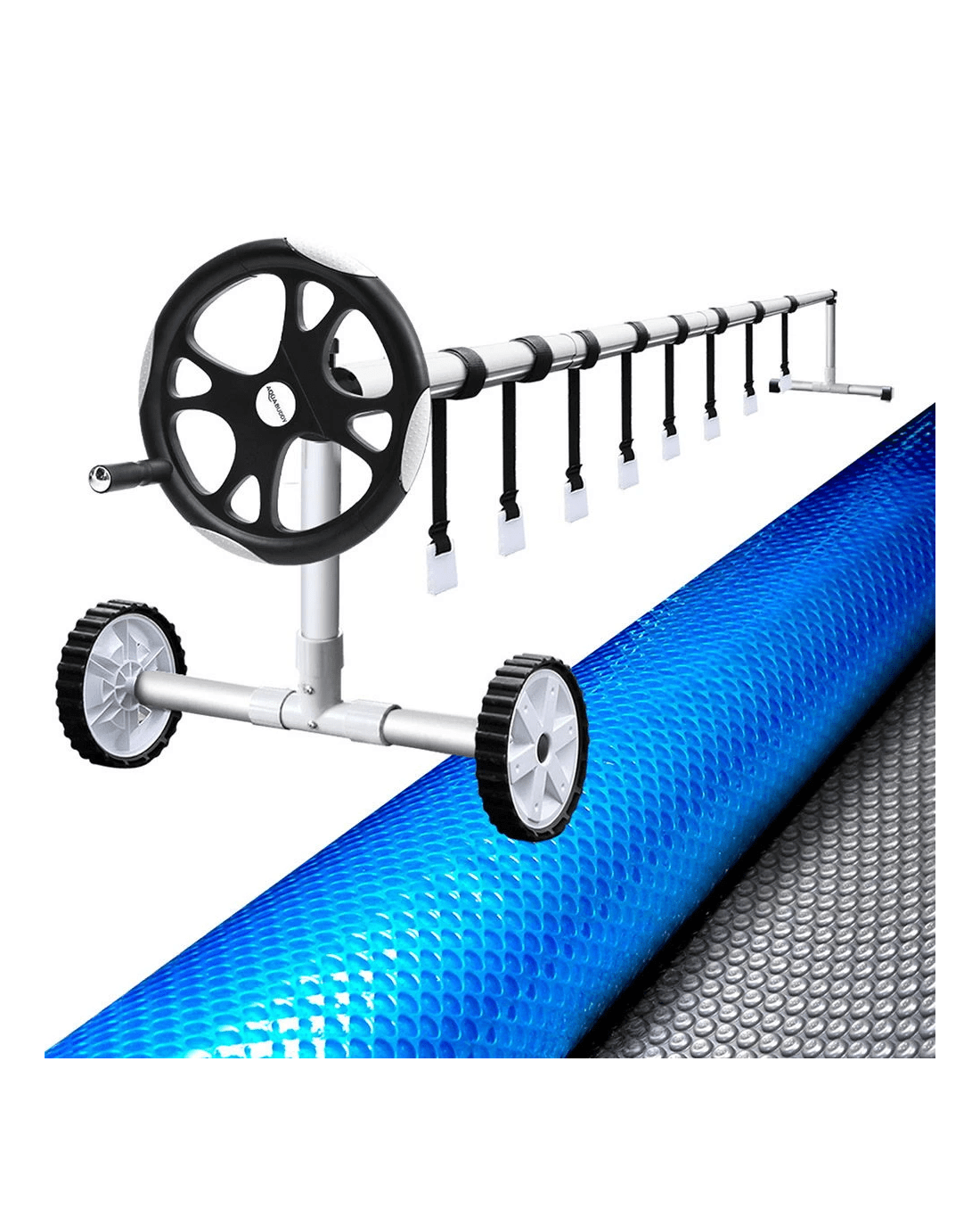 Keep your pool clean from debris and warm from the power of the sun with Aquabuddy's Aluminium Pool Roller and 7m x 4m Pool Cover. Made of sturdy aluminium construction with full adjustability, this pool roller is suitable for pool cover with a width between 2.4m-5.55m. It is equipped with premium anodized aluminium alloy stands, plastic wheels for maximum portability, and an exclusive non-slip spinning wheel design to easily roll up your pool cover and get right in the water. The solar pool cover is made from premium low-density polyethylene 500 Micron, which makes it extremely durable. What's with the blue top and silver underside, you ask? Well, the design allows the sun rays to penetrate the pool, increasing the temperature and significantly reducing water evaporation. Aquabuddy helps heat the pool easier and faster, and retain more heat in the pool for a longer time. Finally, the cover keeps the pool water clean all year round, reducing the time spent maintaining the water, pumps and filters. Save money, save time, save summer! Get the best of natural resources and save money on chemicals and water; get yourself an Aquabuddy Pool Roller and 7m x 4m Cover set today!