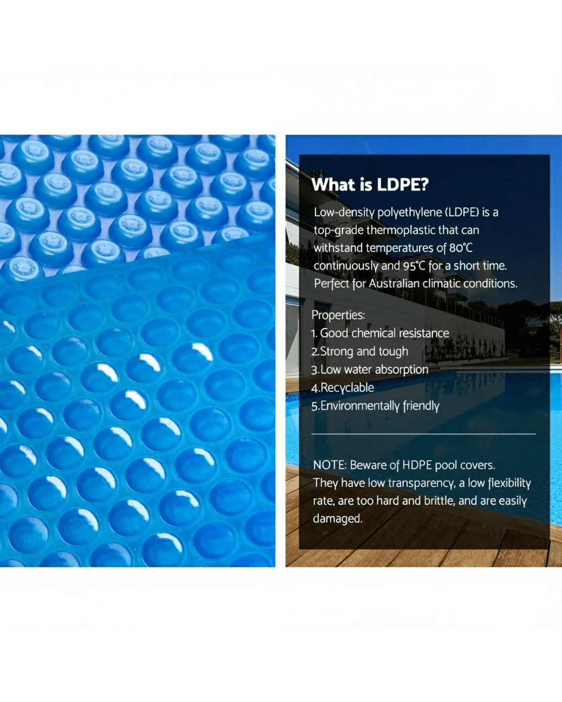 Made of premium low density polyethylene 400 Micron, this solar pool cover is extremely durable and can efficiently and effectively distributing the heat to the water. It allows sun heat to penetrate to the pool; increasing the temperature in the water as well as can significantly reducing water evaporation. Also, it helps in keeping the pool clean; reducing maintenance time and cost for filtration and pumping. Maintaining your swimming pool will no longer be expensive. Get the best of natural resources and save money on chemicals and water!