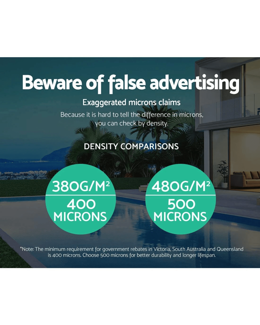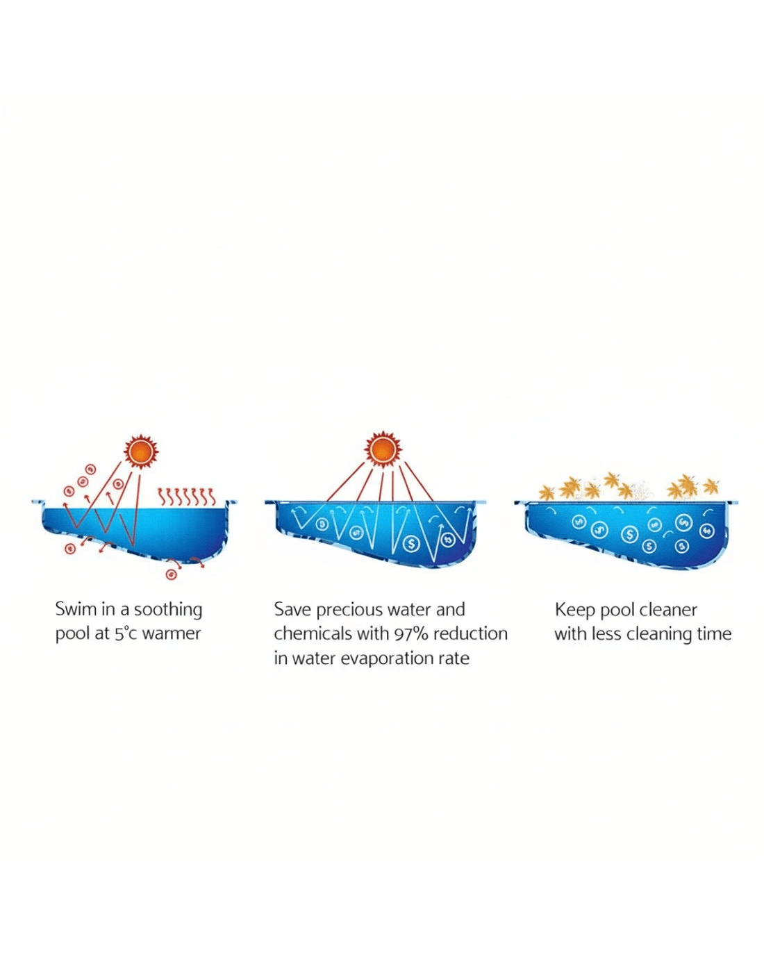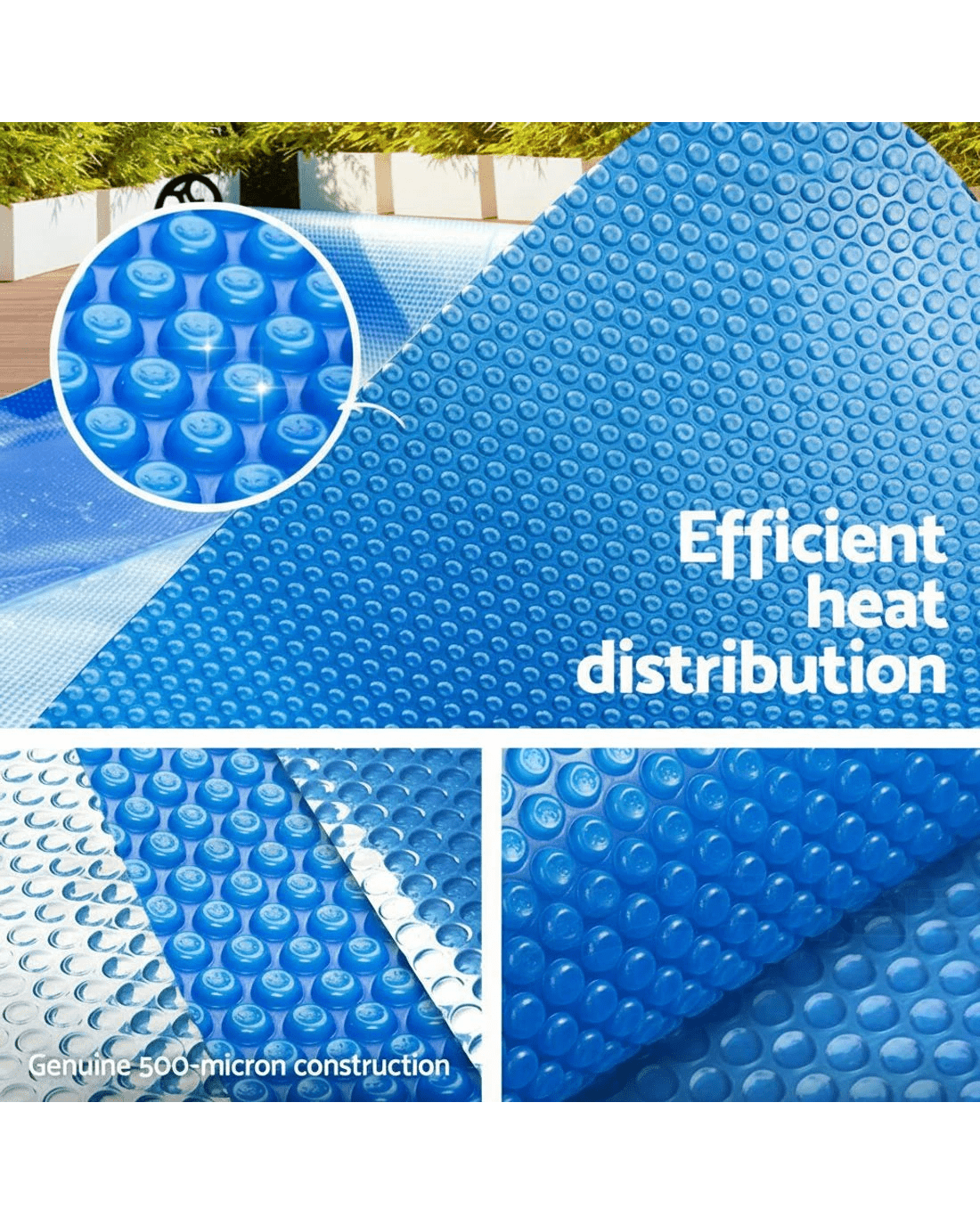 Made of premium low density polyethylene 400 Micron and isothermal design, this solar pool cover is extremely durable and can efficiently and effectively distributing the heat to the water. It allows sun heat to penetrate to the pool; increasing the temperature in the water as well as can significantly reducing water evaporation. Also, it helps in keeping the pool clean; reducing maintenance time and cost for filtration and pumping. Maintaining your swimming pool will no longer be expensive. Get the best of natural resources and save money on chemicals and water!