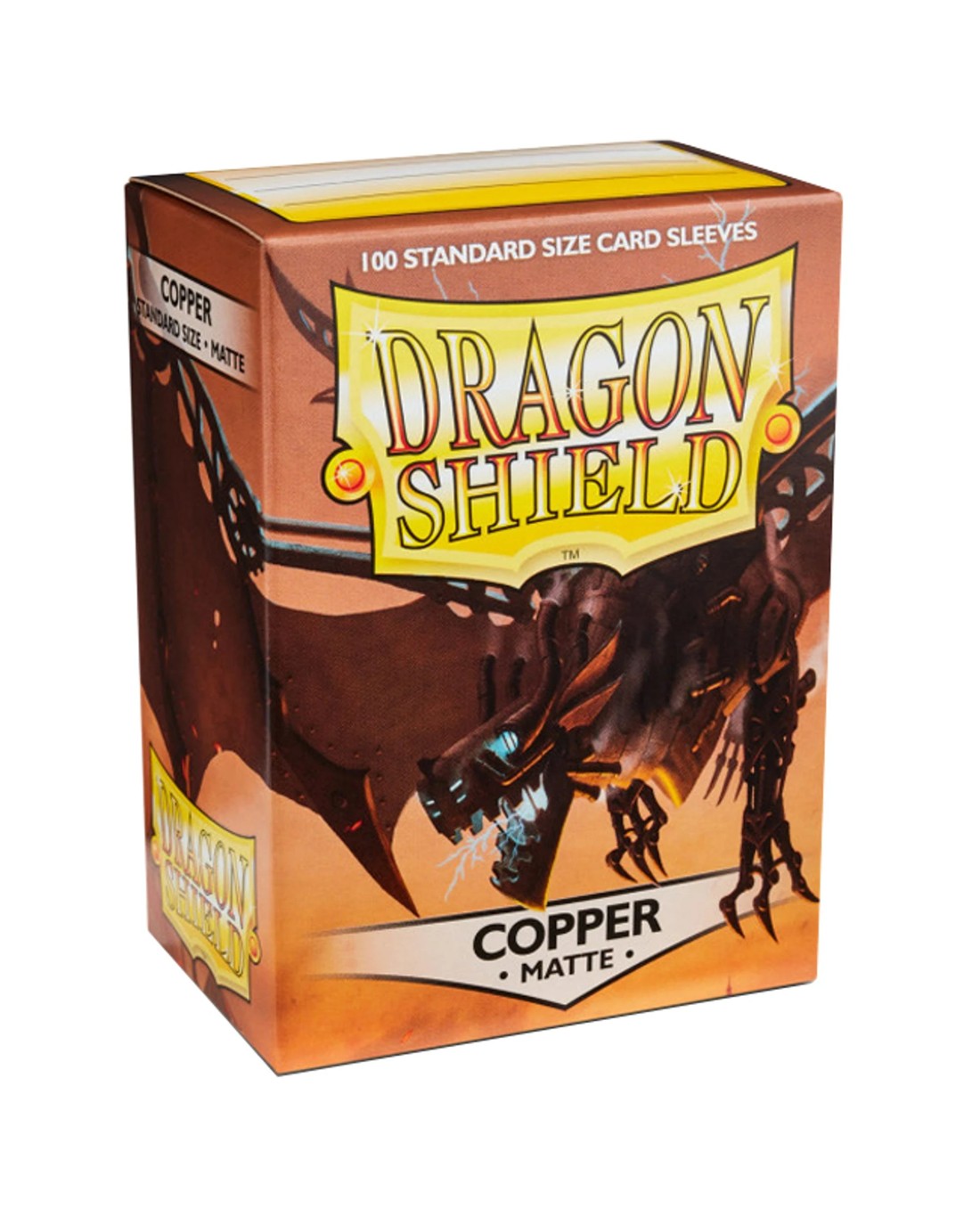 Clear front & Copper back. The engulfing engine of progress. Matte sleeves are our popular line of textured Dragon Shield with superior handling. A perfect mix of durability and shuffle-ability. 100 sleeves per box. For cards measuring up to 63×88 mm (2½”x3½”). PVC-free polypropylene sleeves, no acid. Archival safe. 120 μm quality thickness. Sturdy cardboard box fits 75+ sleeved cards. Box lid has a label for your personal use. Designed for use with Magic the Gathering™, Pokémon™ and other card games. Draco Primus Mk. Zero “Do you have it?” Elon asked. Anna, war-torn and bloody, opened her bag. Inside, the rusted Shield gave off a faint glow. “Aren't you going to ask about the others?” “Unimportant,” Elon said, grabbing the Shield. “This is all that matters.” He rushed into his lab where the Prototype stood. It hardly looked like a dragon to Anna — more like a jumble of wires, contraptions, and whatchamajigs. Elon insisted the Shield was all he needed to make it go, to give them a fighting chance against Angrozh. With it they would avenge her fallen friends. Elon slid the Shield into its chest. Nothing. Then, Draco Primus opened its eyes.
