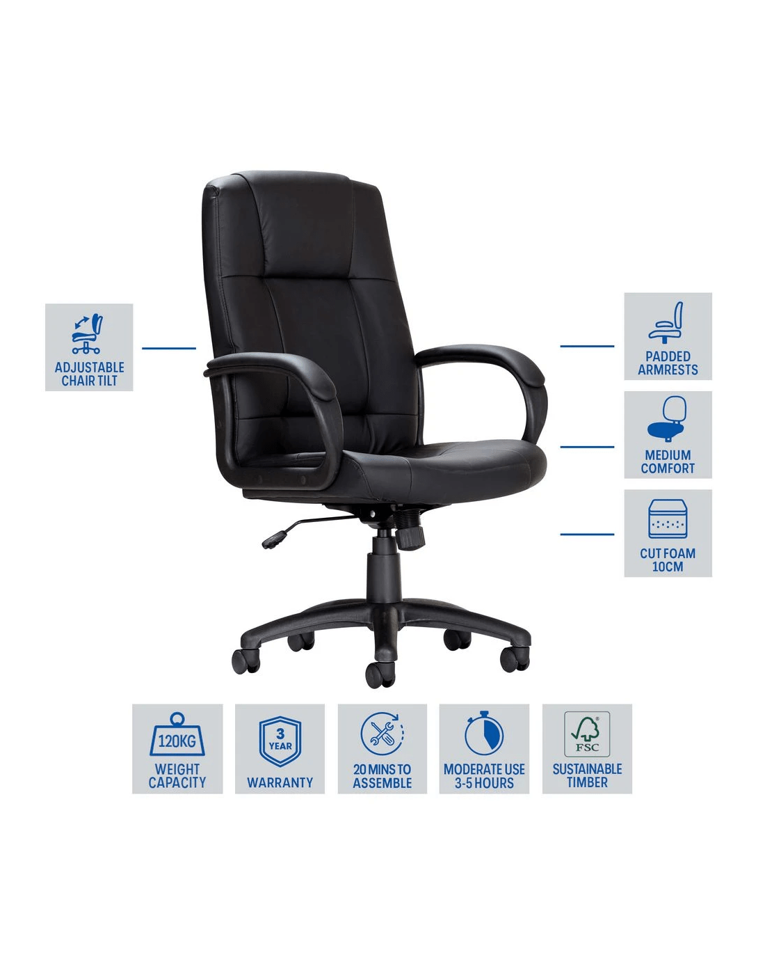 The Archer Executive High Back Chair is a comfortable chair which you can use for up to 5 hours at a time. This chair allows you to adjust the height and tilt so you can customise it to your needs.