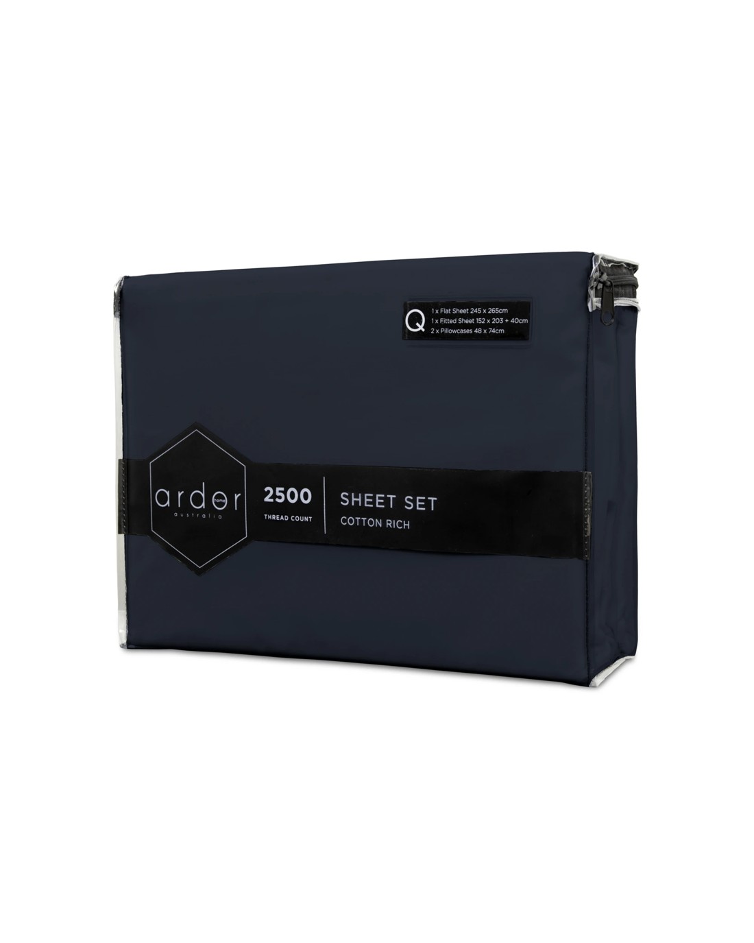 This set includes all the essentials for a queen bed, comprising a fitted sheet, flat sheet, and two pillowcases, providing a complete bedding solution and effortless style coordination. The navy colour adds versatile sophistication to any bedroom setting.
