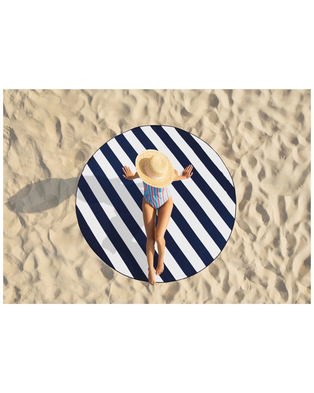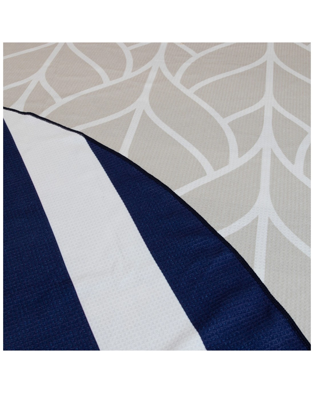 Made from 85 per cent polyester and 15 per cent polyamide with a weight of 390GSM, this towel offers a premium smooth surface that is soft, absorbent, and quick drying. Its beautifully finished contrast stitched edge enhances durability and appearance. The towel's round shape and navy colour make it a standout accessory, and its lightweight, compact design ensures easy transport to and from the beach. Perfect for casual beach outings or relaxed poolside lounging.