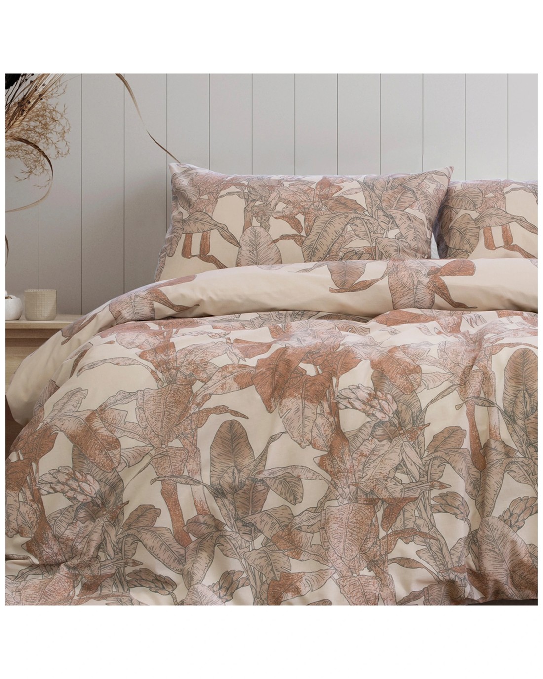 The Ardor Bayley Quilt Cover Set is designed to transform your bedroom into a lush tropical retreat. Inspired by tropical foliage, the set adds a warm island vibe with its botanical motifs and neutral dusk colour, creating a relaxed and inviting atmosphere.