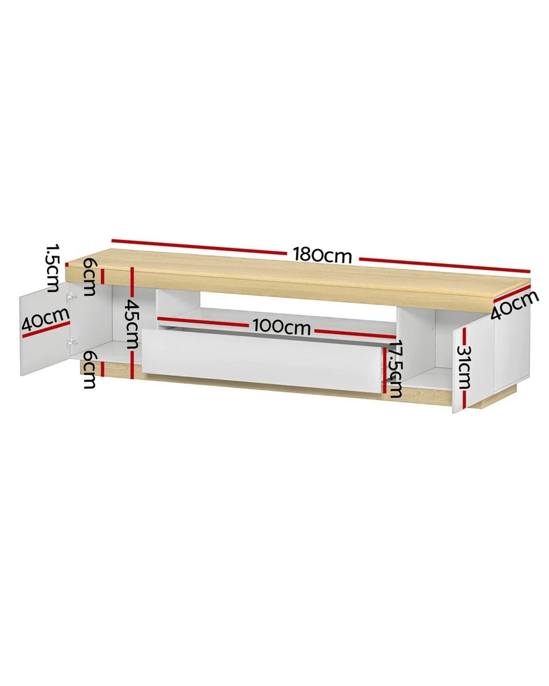 Your treasured home entertainment system deserves the best entertainment unit. That is why our Artiss Lior Entertainment Unit is the ideal choice for you. Incorporating a contemporary two-tone design and made with 15mm thick particle board with a melamine finish, our entertainment unit combines great craftsmanship with equally fine materials. The unit offers ample storage space with an open shelf, two deep cabinets and one spacious drawer with anti-rust runners and heavy-duty fixings. With a design that will surpass trends and fads, our entertainment unit is your definite pick for an everlasting display piece with timeless appeal. It is easy to clean thanks to the smooth surface – simply wipe it down with a damp cloth. Even easier to assemble with the included instructions, your family entertainment setup can take centre stage with the Artiss Lior Entertainment Unit.