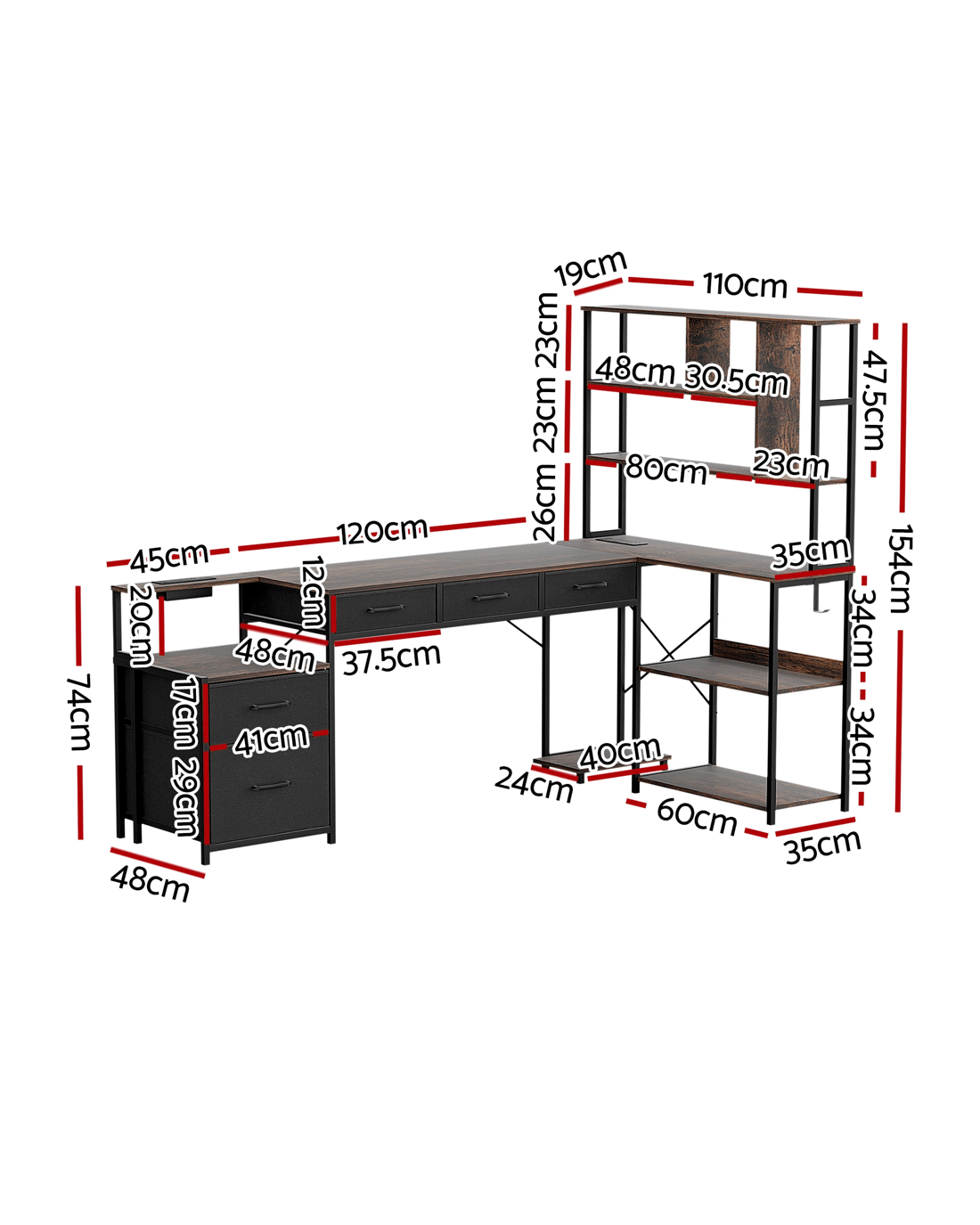 Weight Capacity: Desktop: 25kg; Shelves: 10kg; Drawers: 5kg per unit