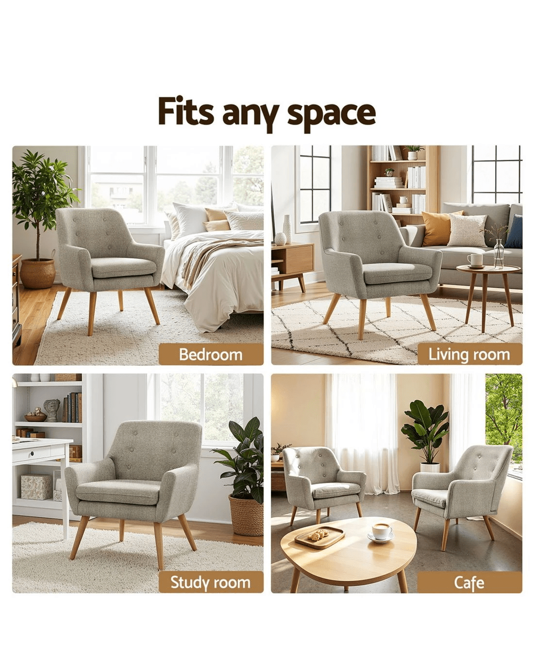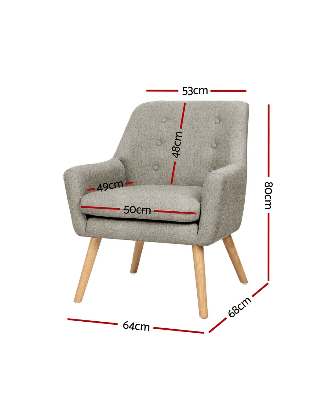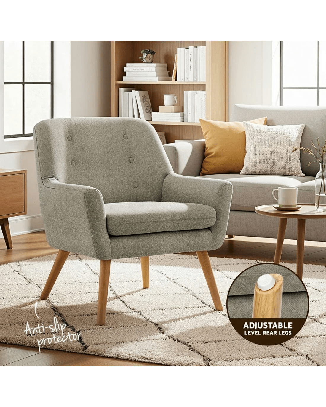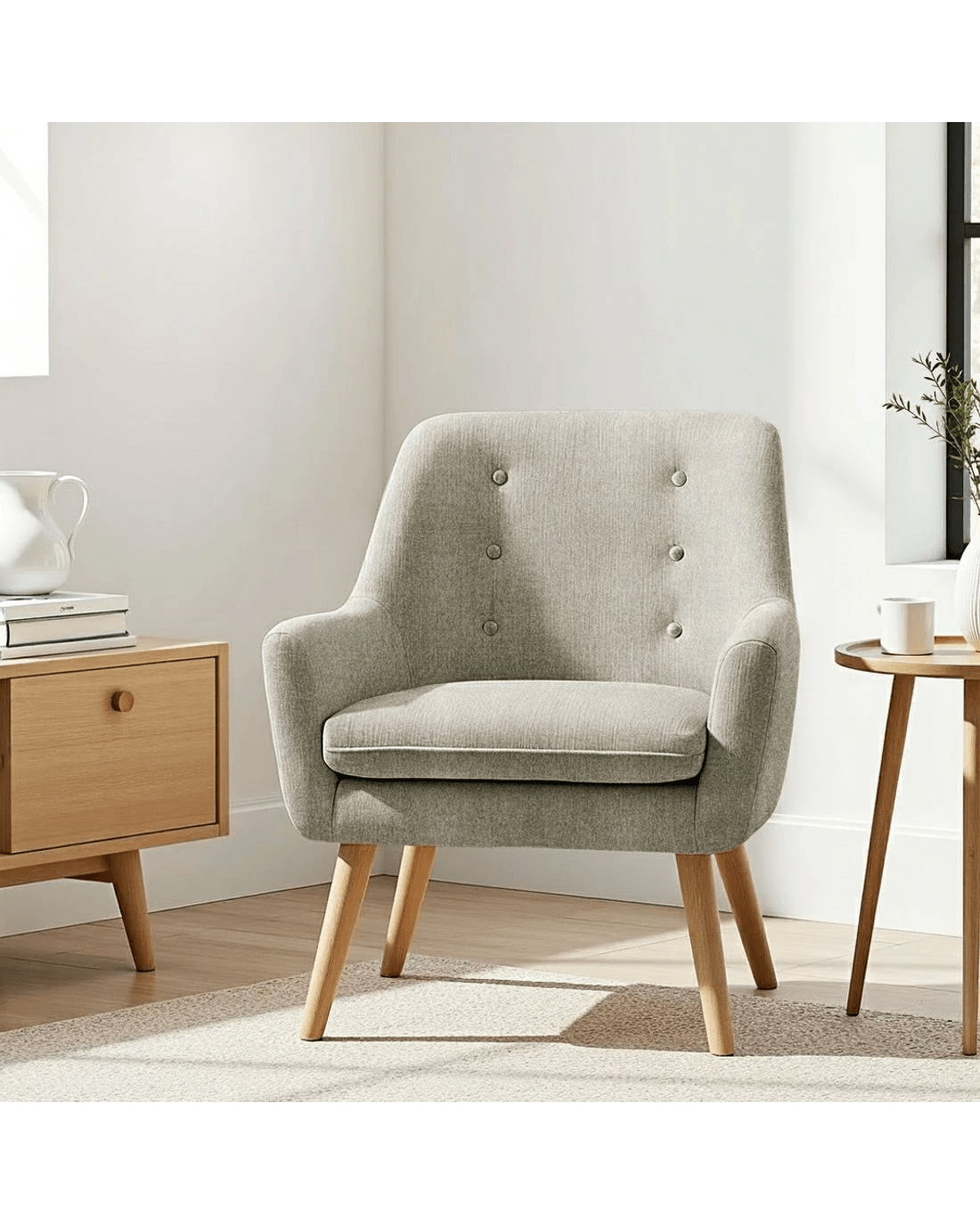 Upholstered in quality polyester, the Anne Armchair is a full size chair with generous seating space. The extra thick foam padding ensures ultimate comfort with exceptional support while the tufted backrest adds an array of luxurious highlights to the overall character of the armchair. Together with a reinforced wooden frame and sturdy tapered rubber wood legs, the Anne Armchair is guaranteed to stand up to durable use for many years to come. Not least, with its neutral tones, the Anne Armchair is a seamless match for any home décor.
