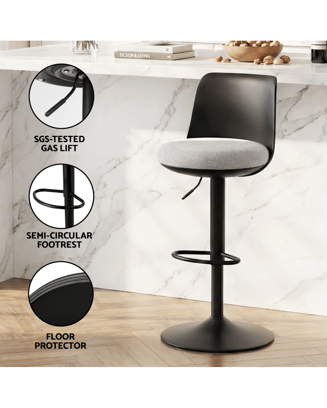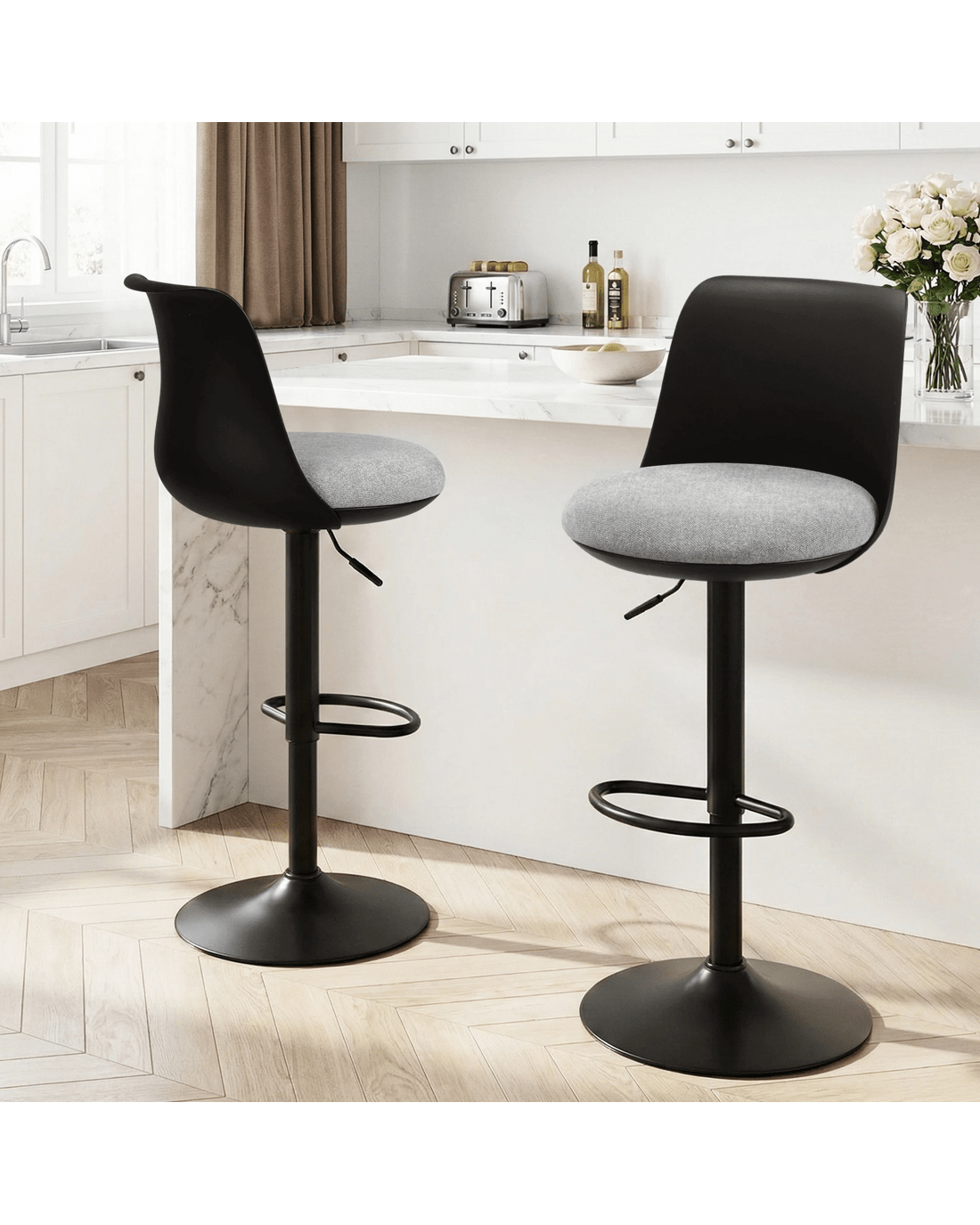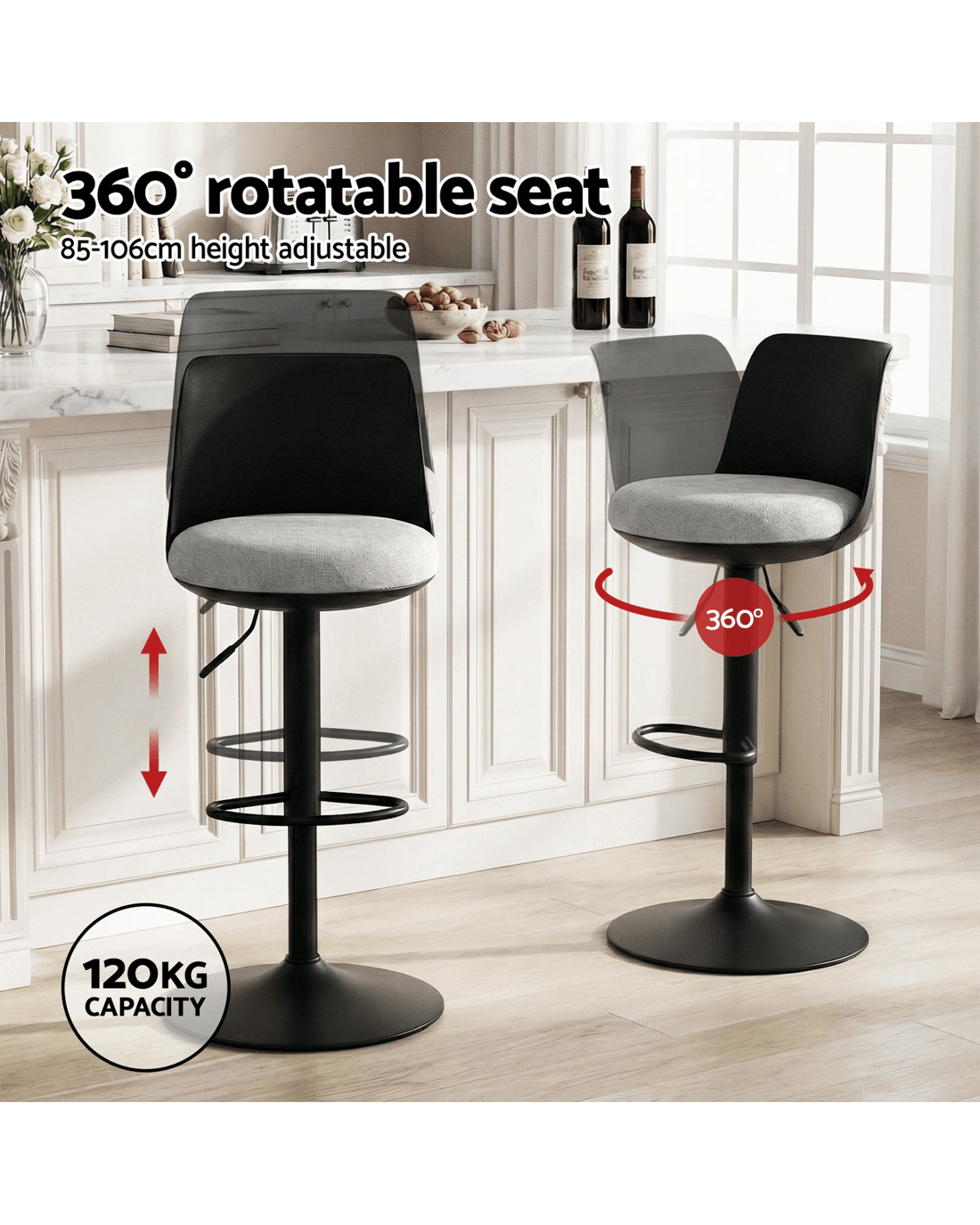 Upgrade your home with this stylish and functional set of 2 bar stools. Featuring adjustable seat height (64cm-85cm), these stools cater to various seating needs, whether for a kitchen counter or bar top. The ergonomic curved backrest and thick foam padding ensure maximum comfort, while the premium faux linen fabric adds a sophisticated touch to your decor. Built with a reinforced gas lift cylinder and sturdy metal construction, each stool supports up to 120kg. The semi-circular footrest ring enhances comfort, and anti-slip floor protectors safeguard your floors. Assembly is quick and easy, making these stools the perfect choice for any modern home.