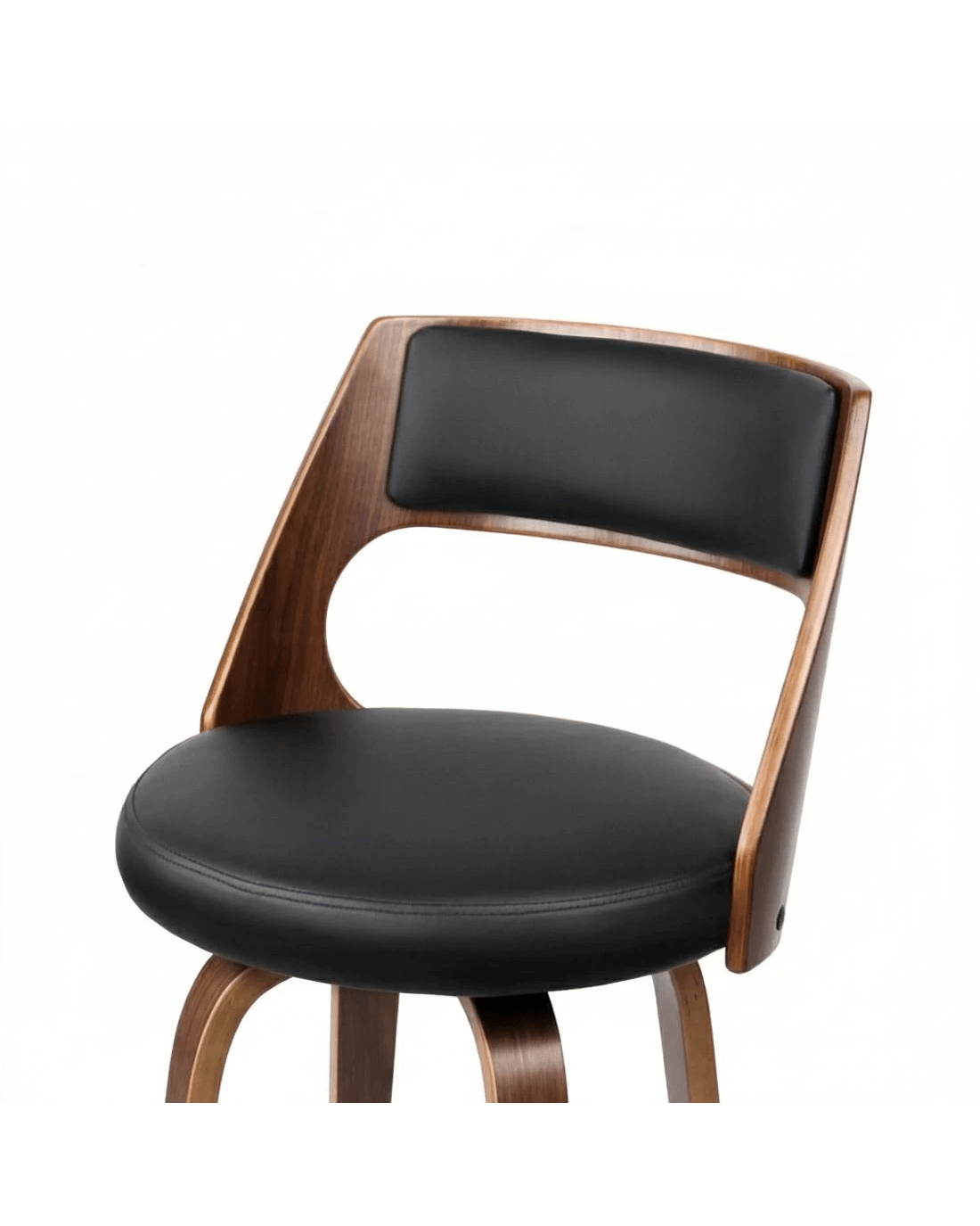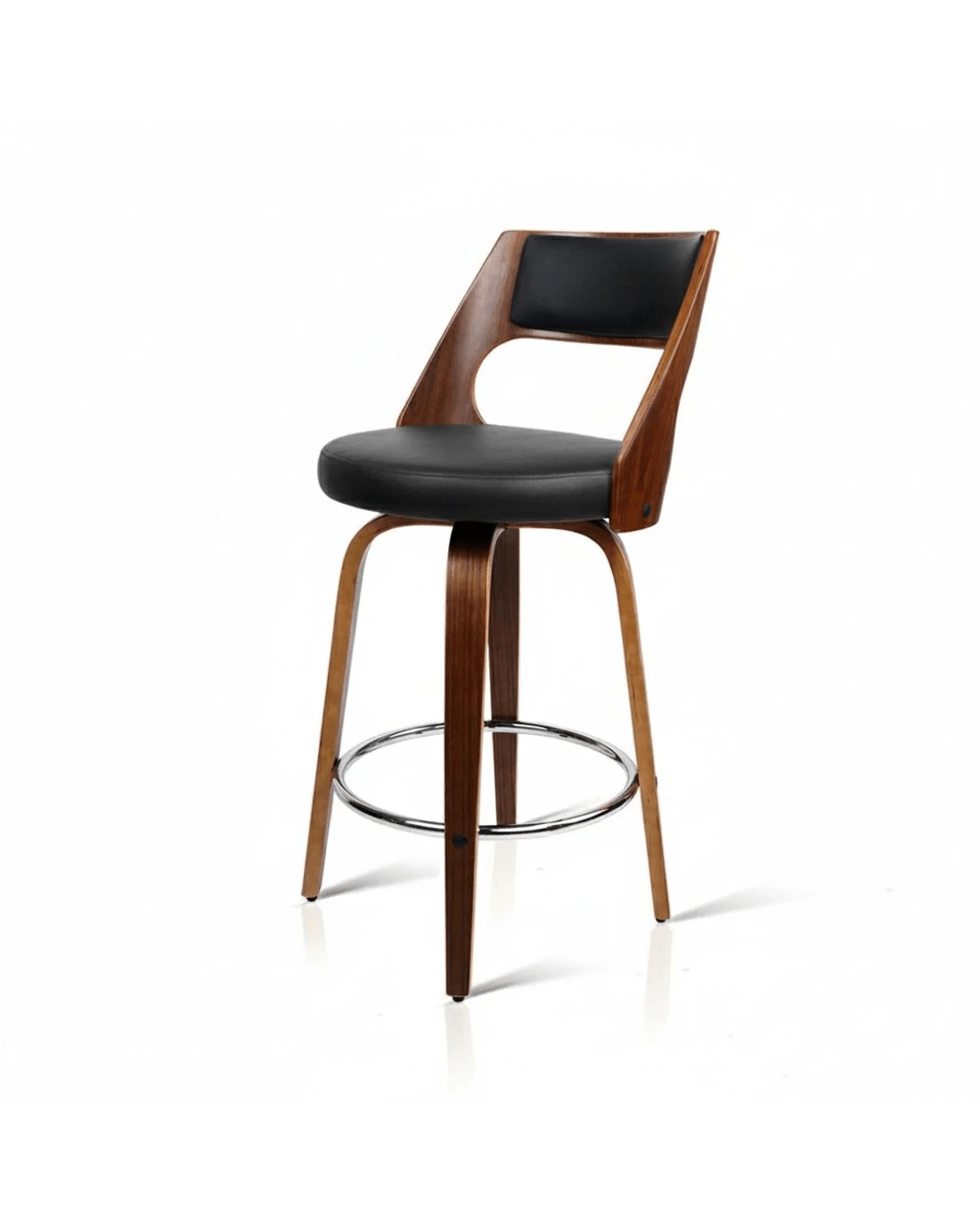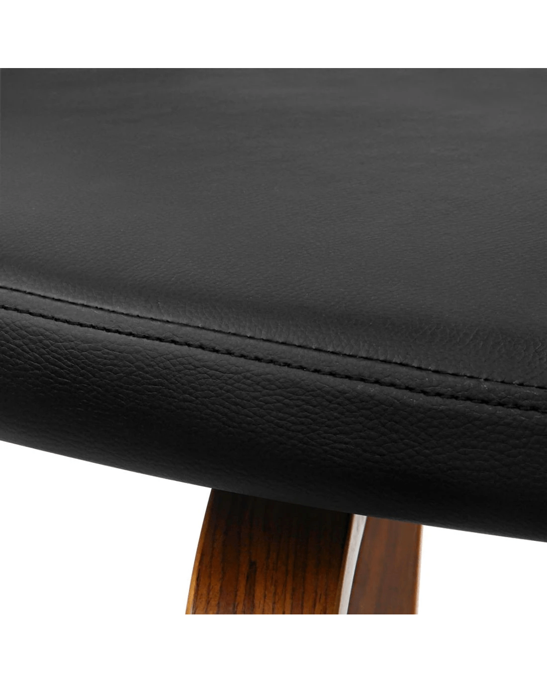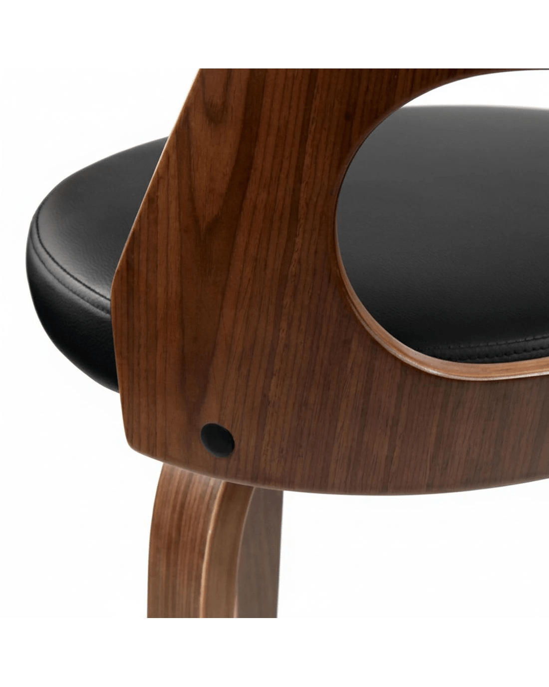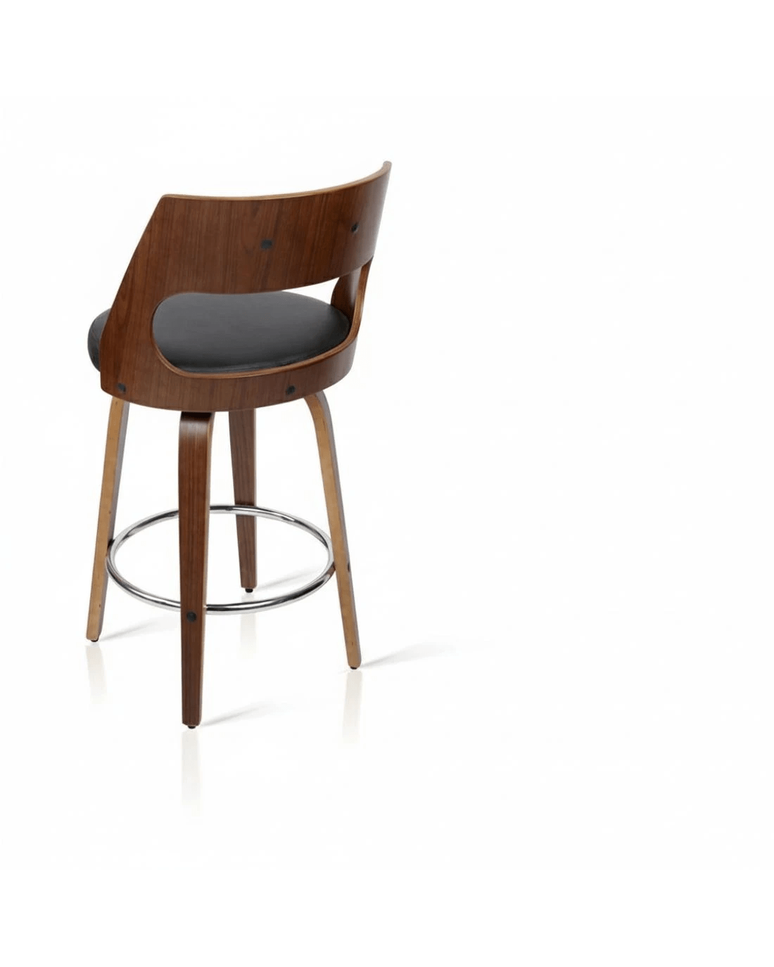 Meticulously crafted with solid wood in a stunning walnut finish for the legs, the Bentwood Bar Stool features a generous puckered faux leather integrated seat and backrest that feel comfortably smooth and look absolutely classy. The mid-height backrest also provides appreciable support while the anti-slip rubber pads at the bottom of the legs remain firm and steady even with robust use. Not least, the chrome footrest lets you perch in style, feet up.